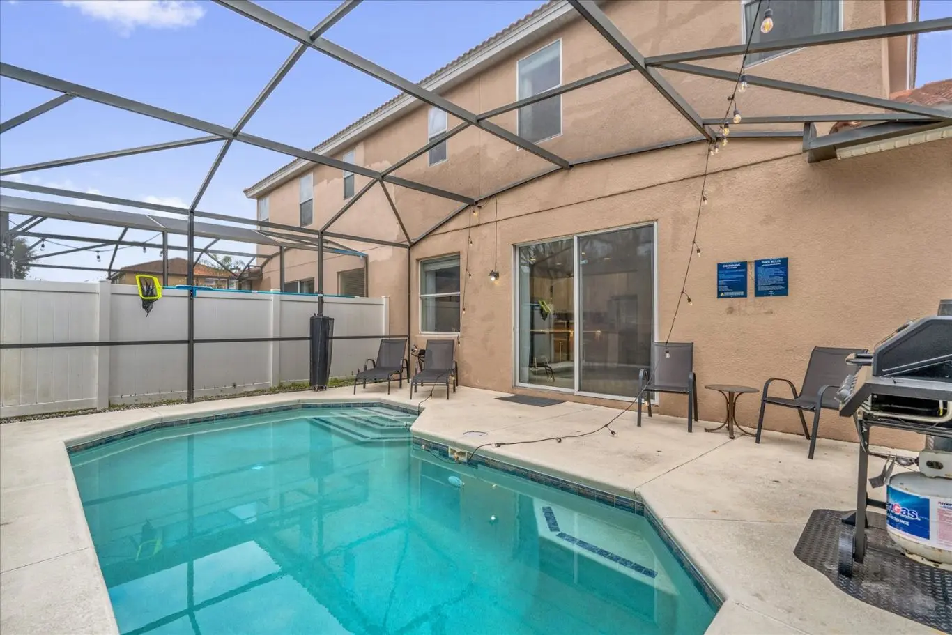 A área externa oferece uma piscina exclusiva, perfeita para relaxar após um dia nos parques ou simplesmente aproveitar o clima ensolarado de Orlando.