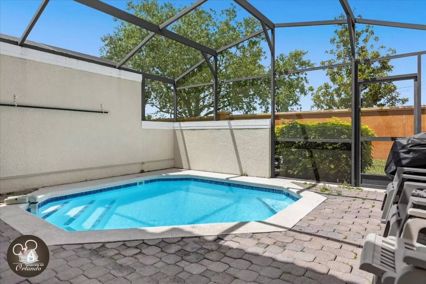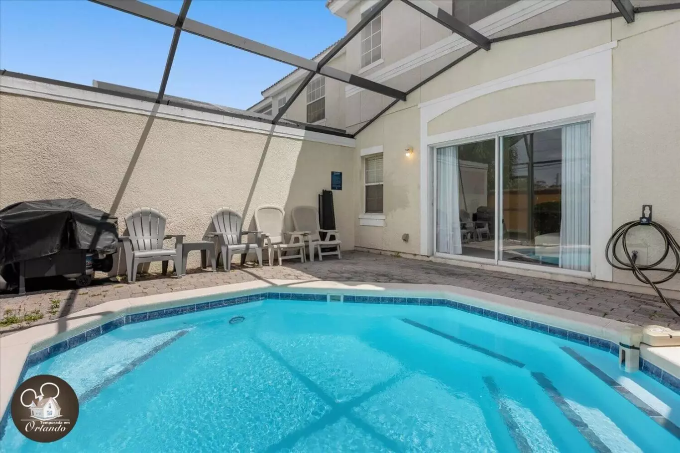 Nos fundos da casa, a área externa conta com uma piscina privativa, ideal para relaxar em família depois dos passeios pelos parques ou dias de compras.