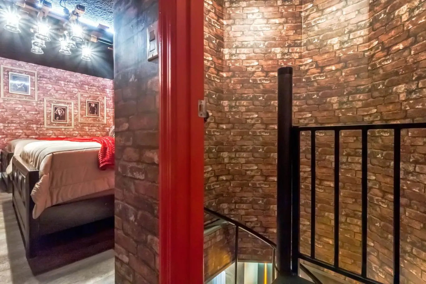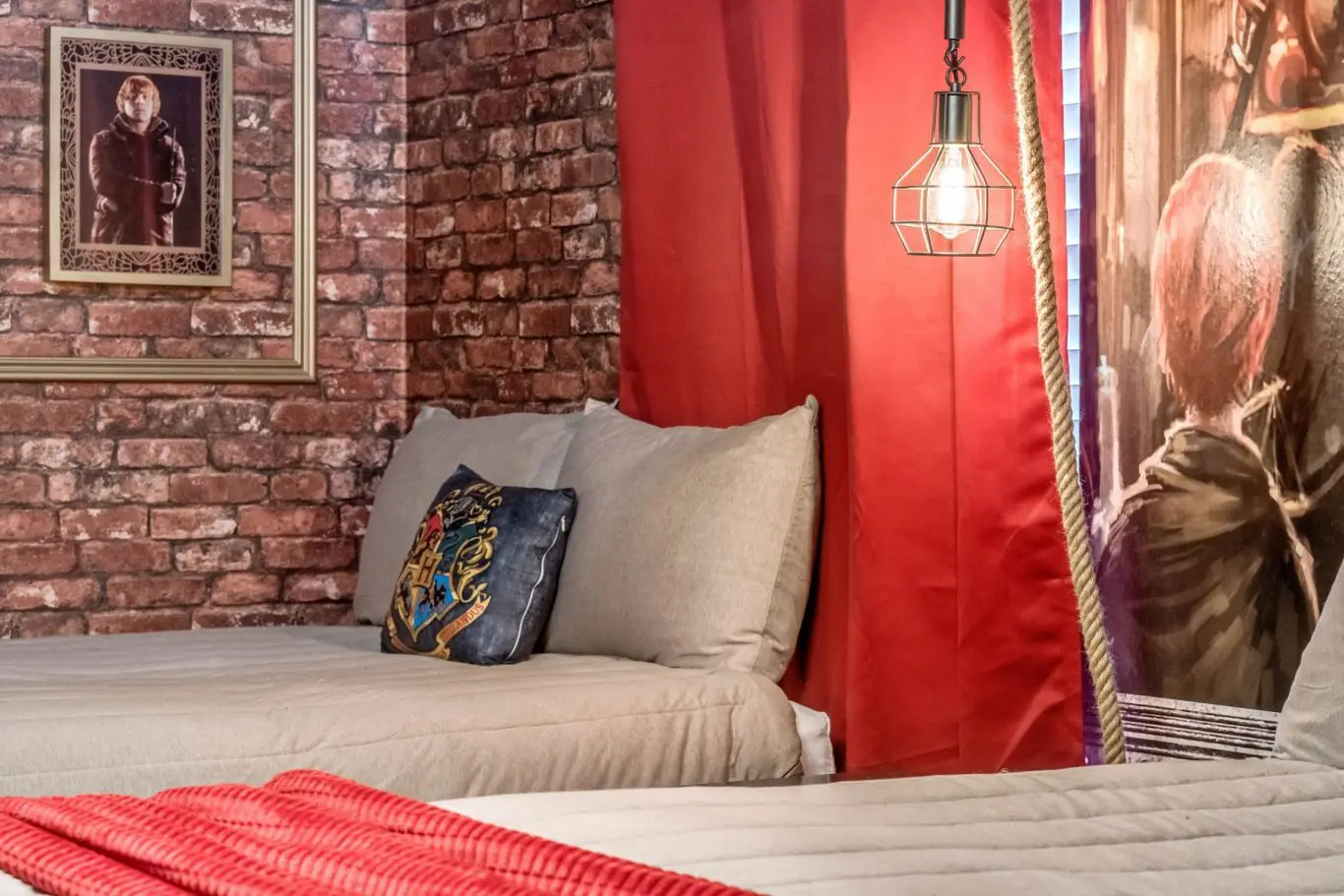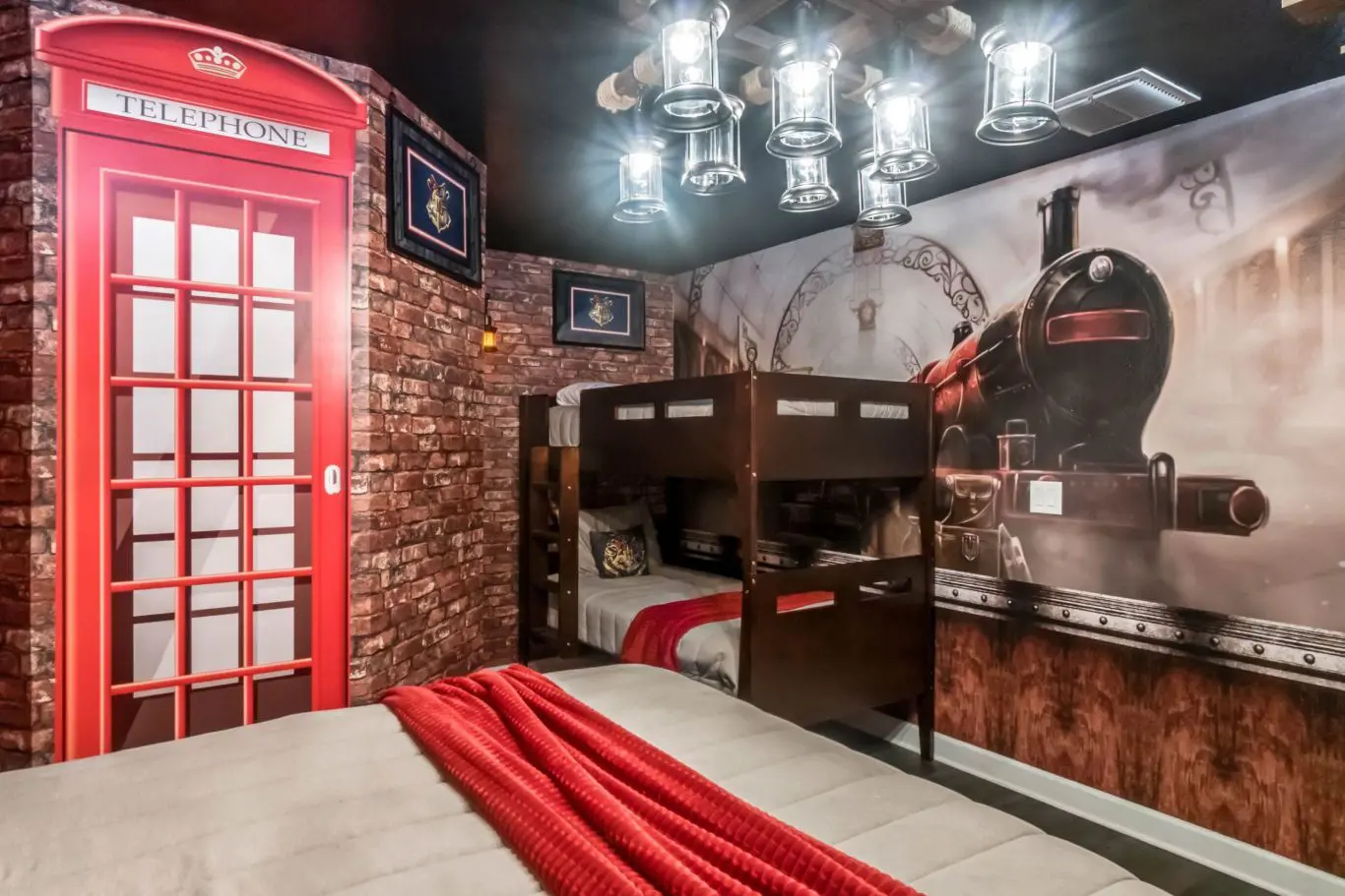 Quarto 9 (Harry Potter): 2 camas queen + 1 beliche • Acesso secreto ao salão de jogos • Banheiro exclusivo ao lado do quarto
