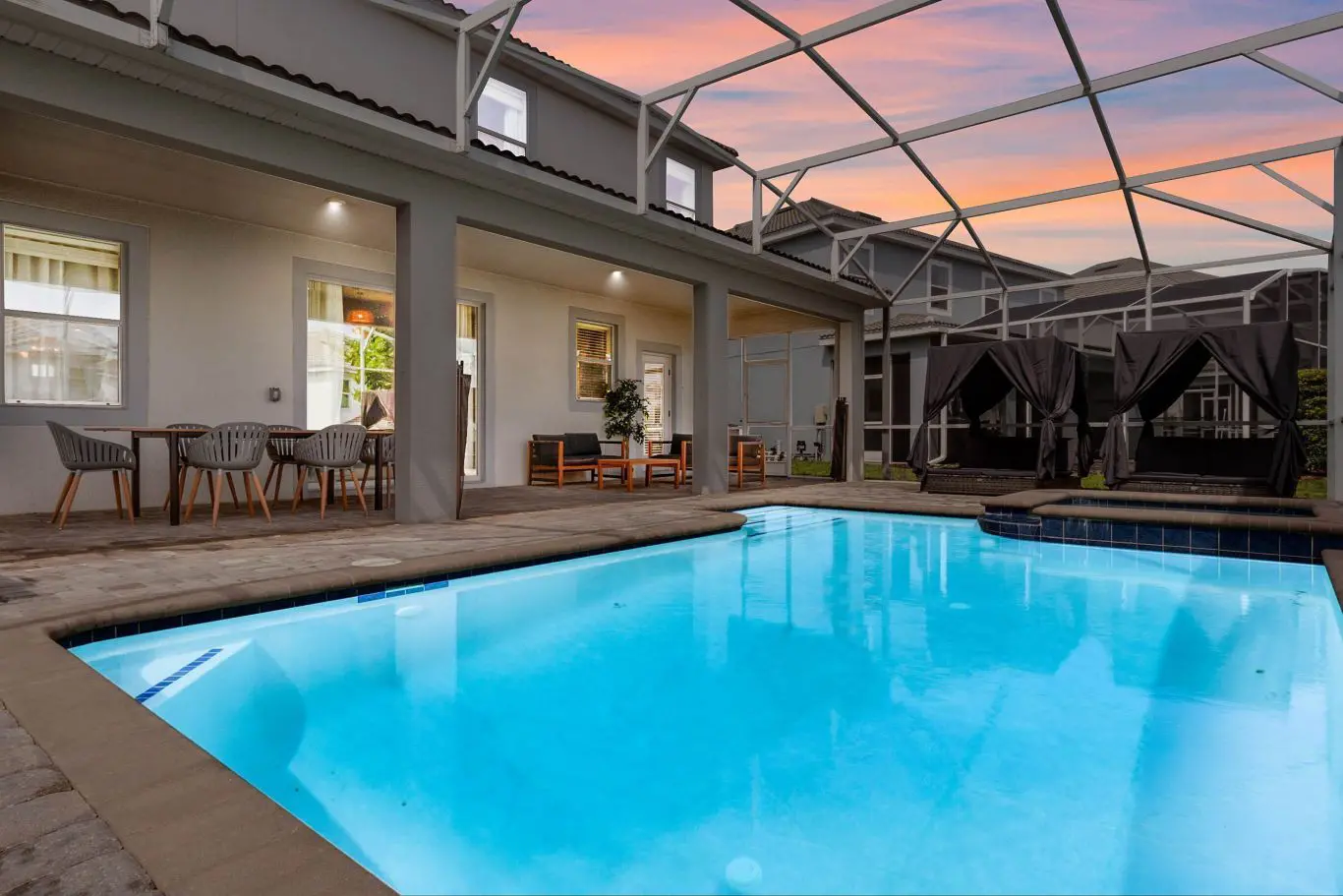 Para completar a experiência, a casa possui uma piscina privativa que oferece privacidade e lazer ao ar livre. Uma excelente pedida para os dias ensolarados em Orlando. Há ainda uma lavanderia completa no térreo, trazendo ainda mais praticidade para longas estadias.