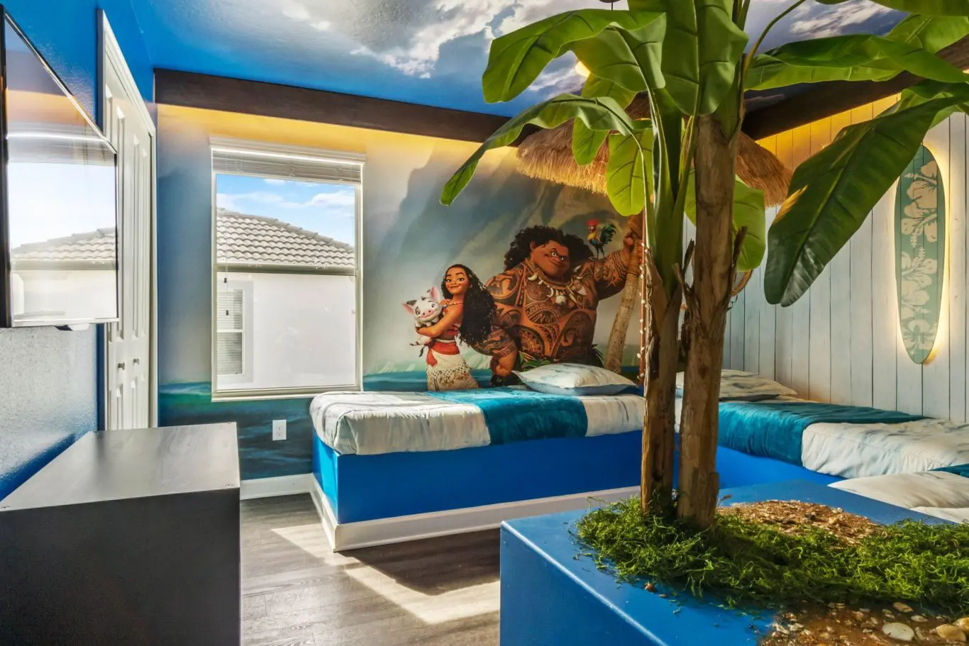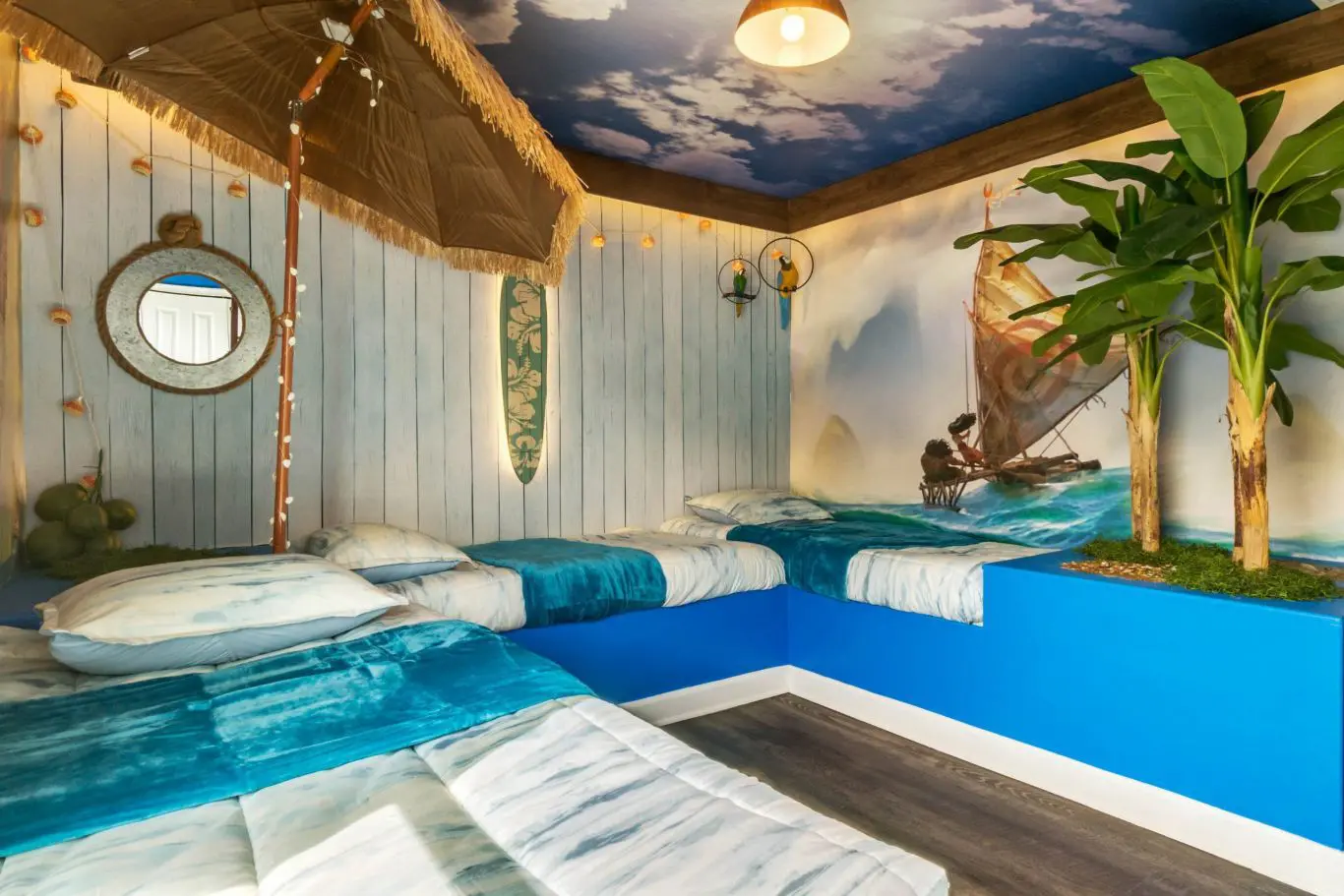 Todos os quartos são bem decorados, com destaque especial para os temas infantis: o quarto da Moana encanta com seus tons suaves e delicadeza, enquanto o quarto do Harry Potter traz uma surpresa inesquecível com sua passagem secreta diretamente para o salão de jogos. Há ainda quartos com temática de música e basquete, que tornam cada ambiente uma nova experiência.