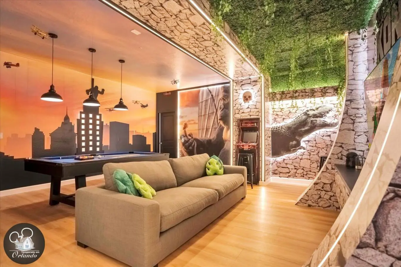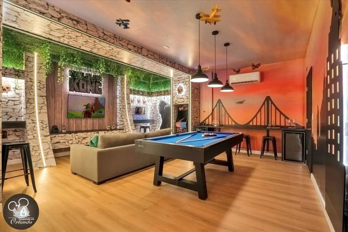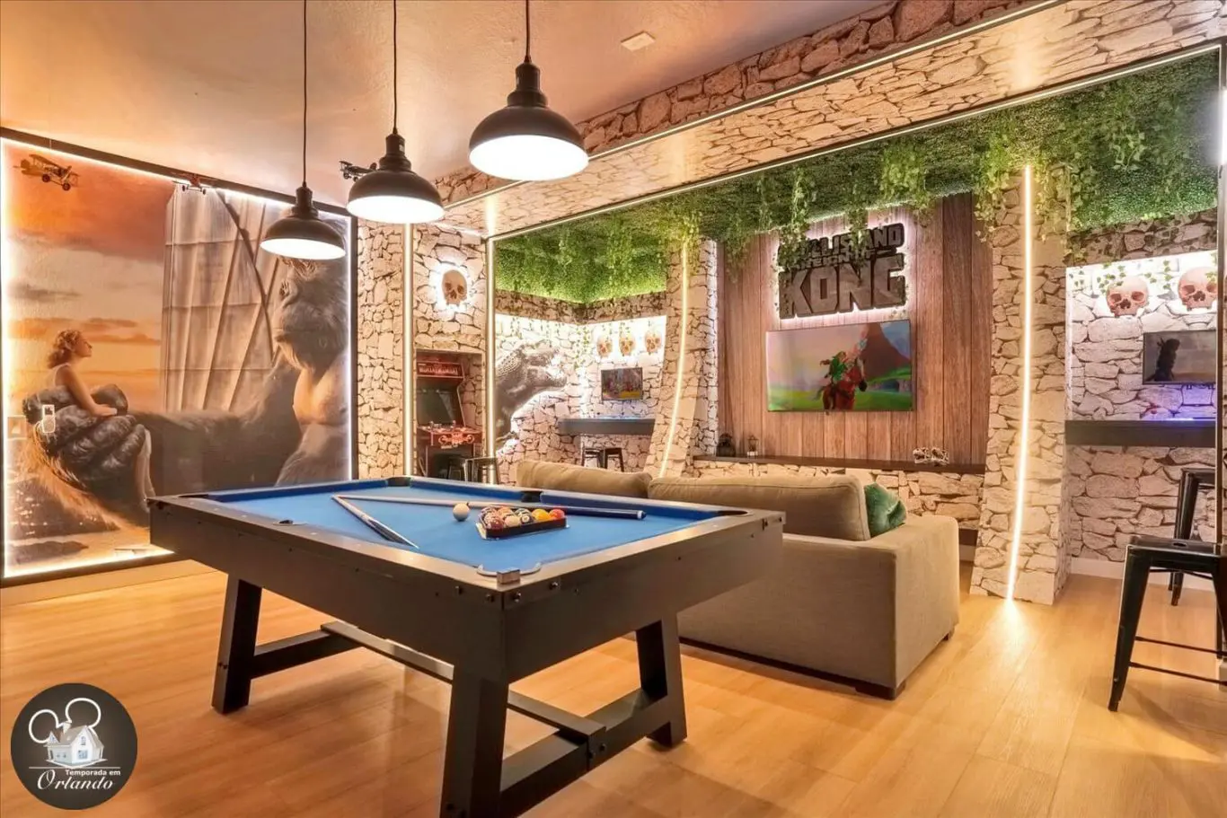 Para os entusiastas de jogos, esta mansão oferece um salão de jogos completo. Um ambiente descontraído ideal para entretenimento entre amigos e familiares.