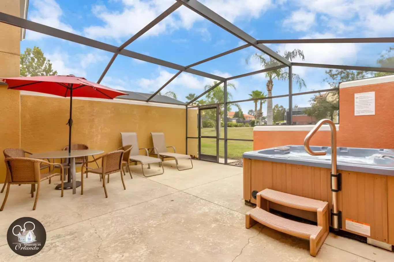 Nos fundos, a jacuzzi privativa garante um ambiente exclusivo para momentos de descanso e relaxamento após os passeios nos parques. Um diferencial valioso em casas para temporada em Orlando.