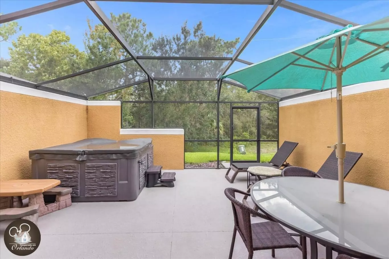 Na área externa dos fundos, a jacuzzi privativa oferece um espaço exclusivo para relaxamento e momentos de lazer. Um diferencial para quem busca casa por temporada em Orlando com estrutura superior.