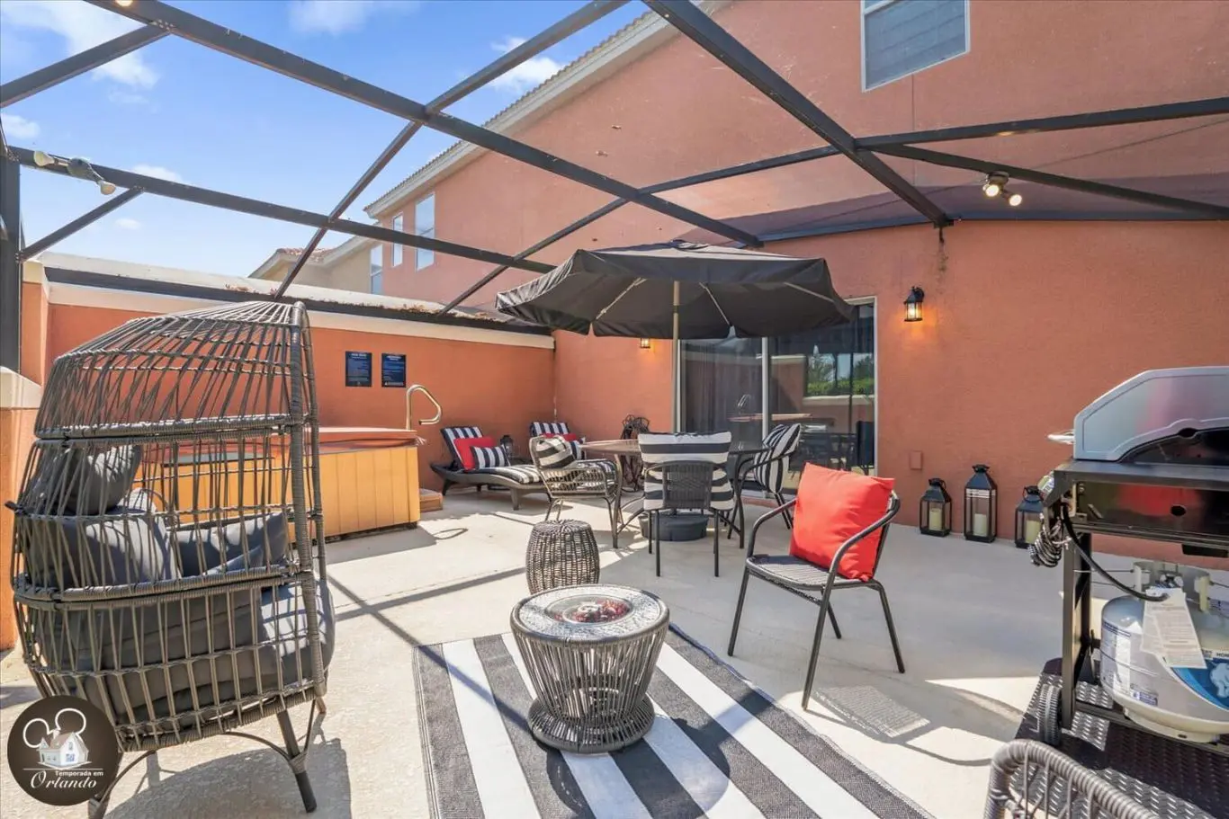 Nos fundos da casa, a jacuzzi privativa é perfeita para relaxar depois de um dia nos parques ou para reunir a família em um espaço tranquilo e exclusivo. Um diferencial que valoriza sua experiência em Orlando.