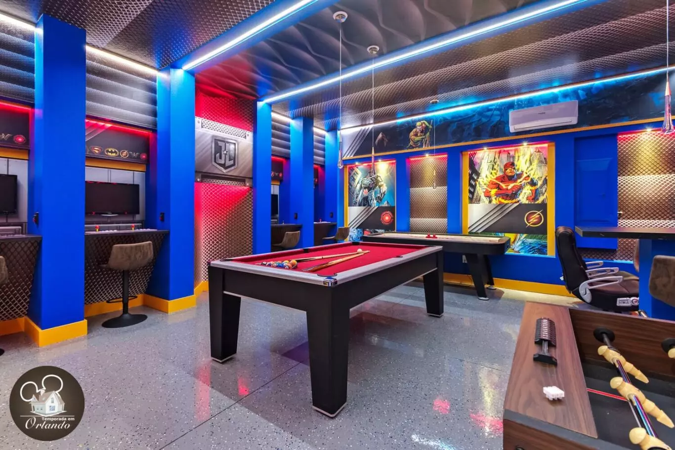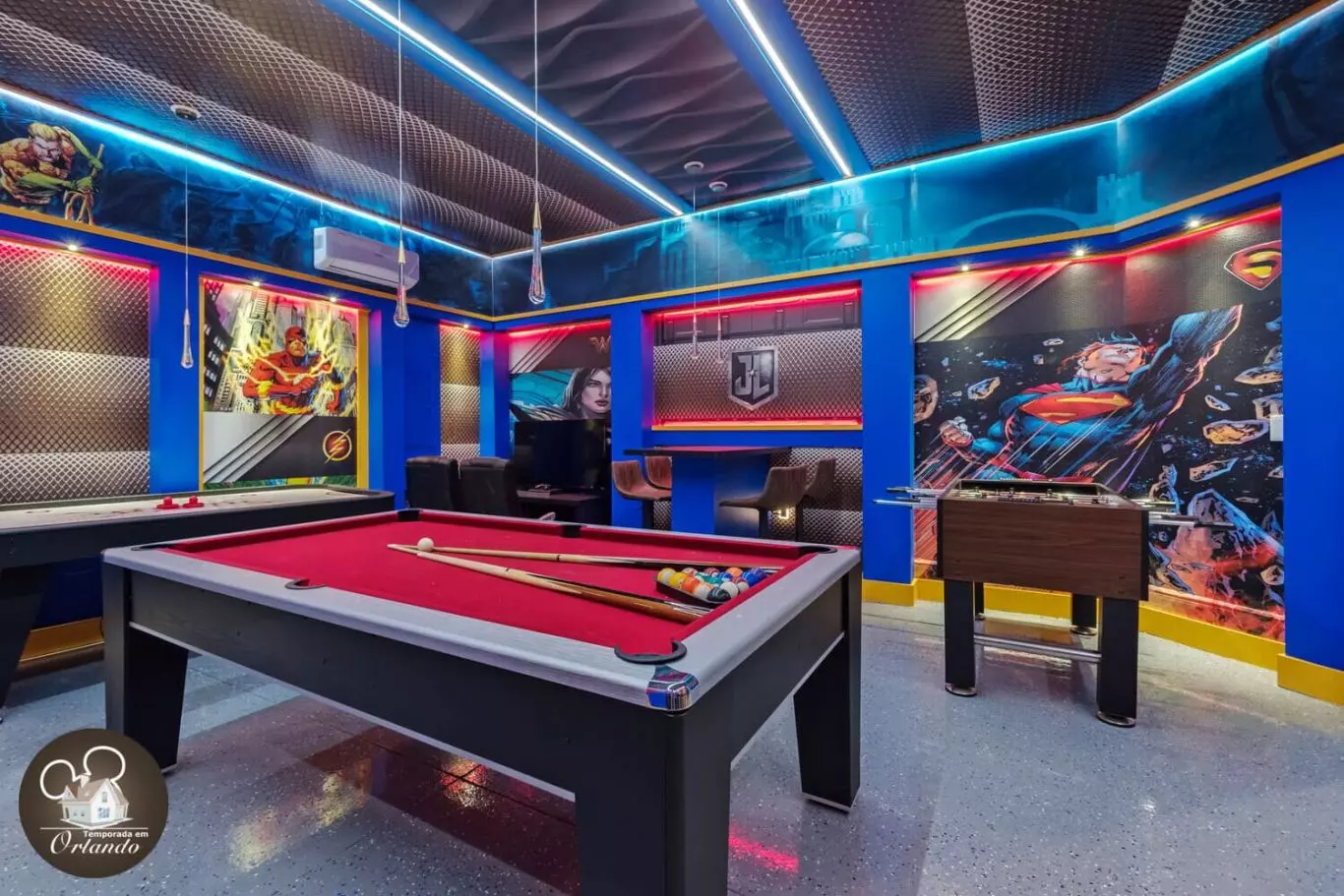 Diversão garantida com um salão de jogos completo e uma sala de descanso no andar superior com assentos confortáveis, ideal para noites de cinema em grupo.