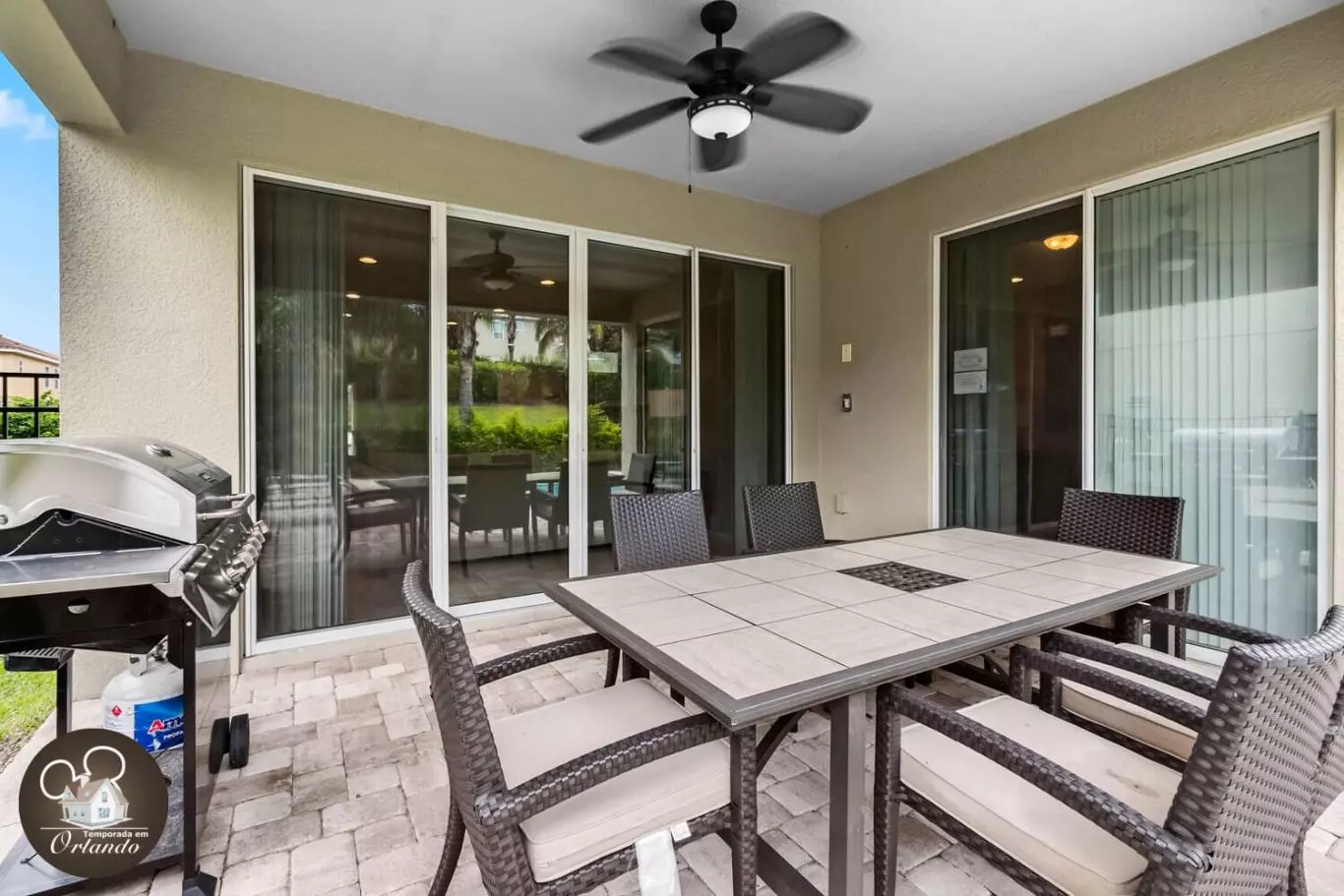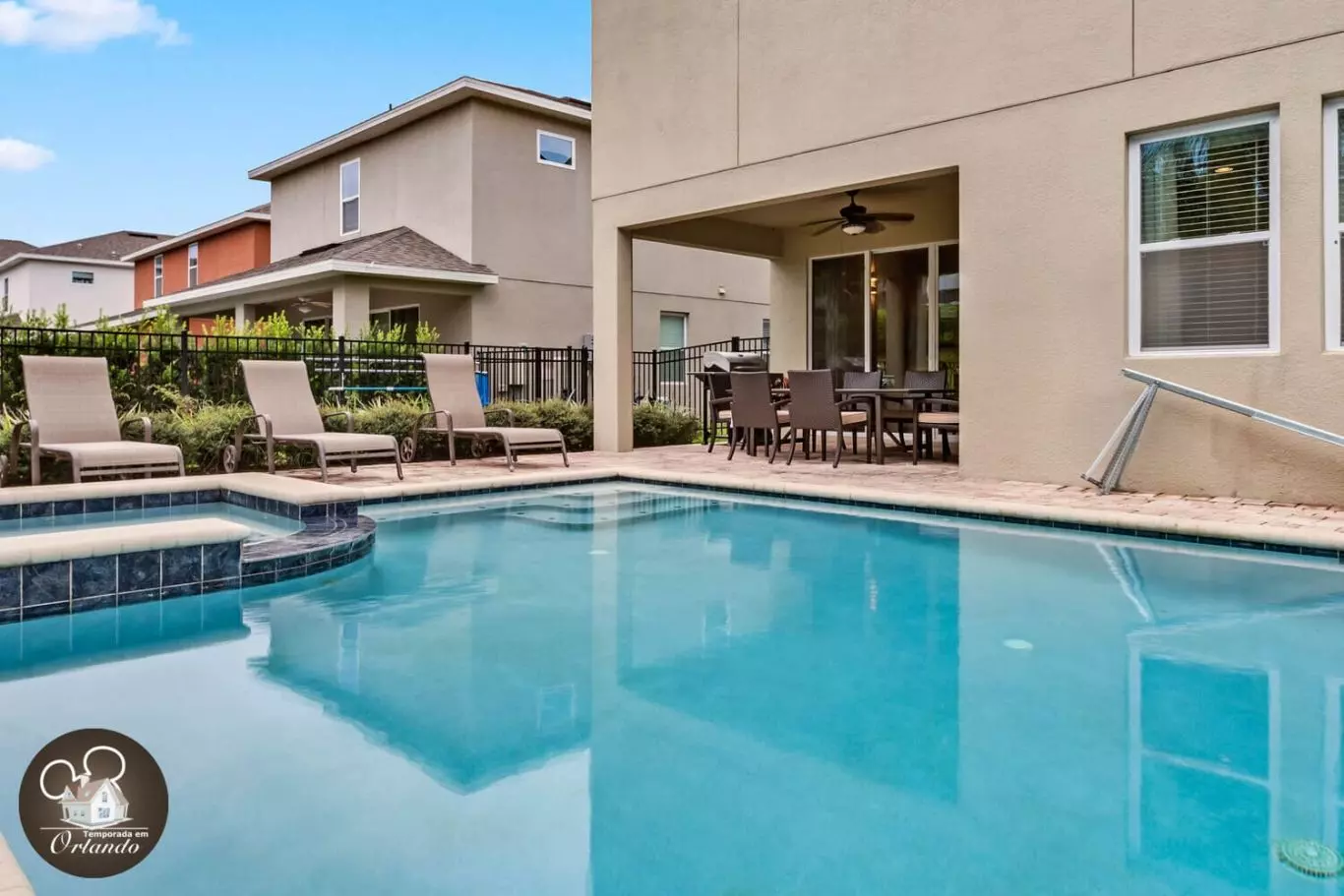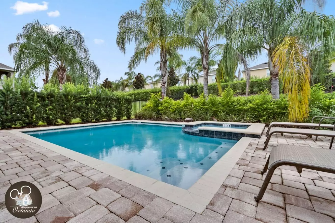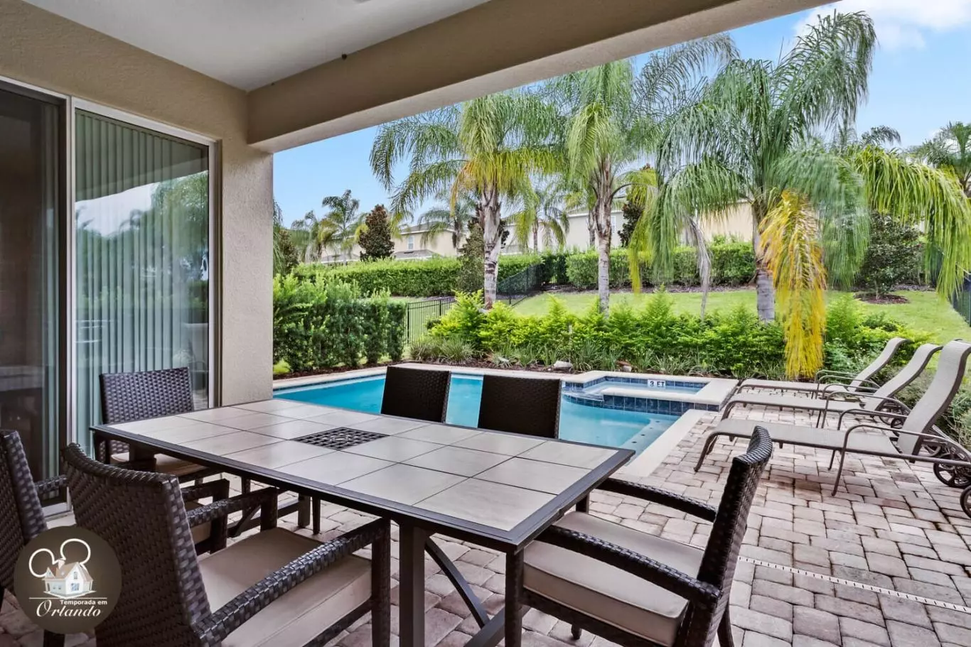 A área externa conta com uma piscina privativa e jacuzzi, perfeita para relaxar após os parques ou curtir o dia sob o sol da Flórida com sua família ou amigos.