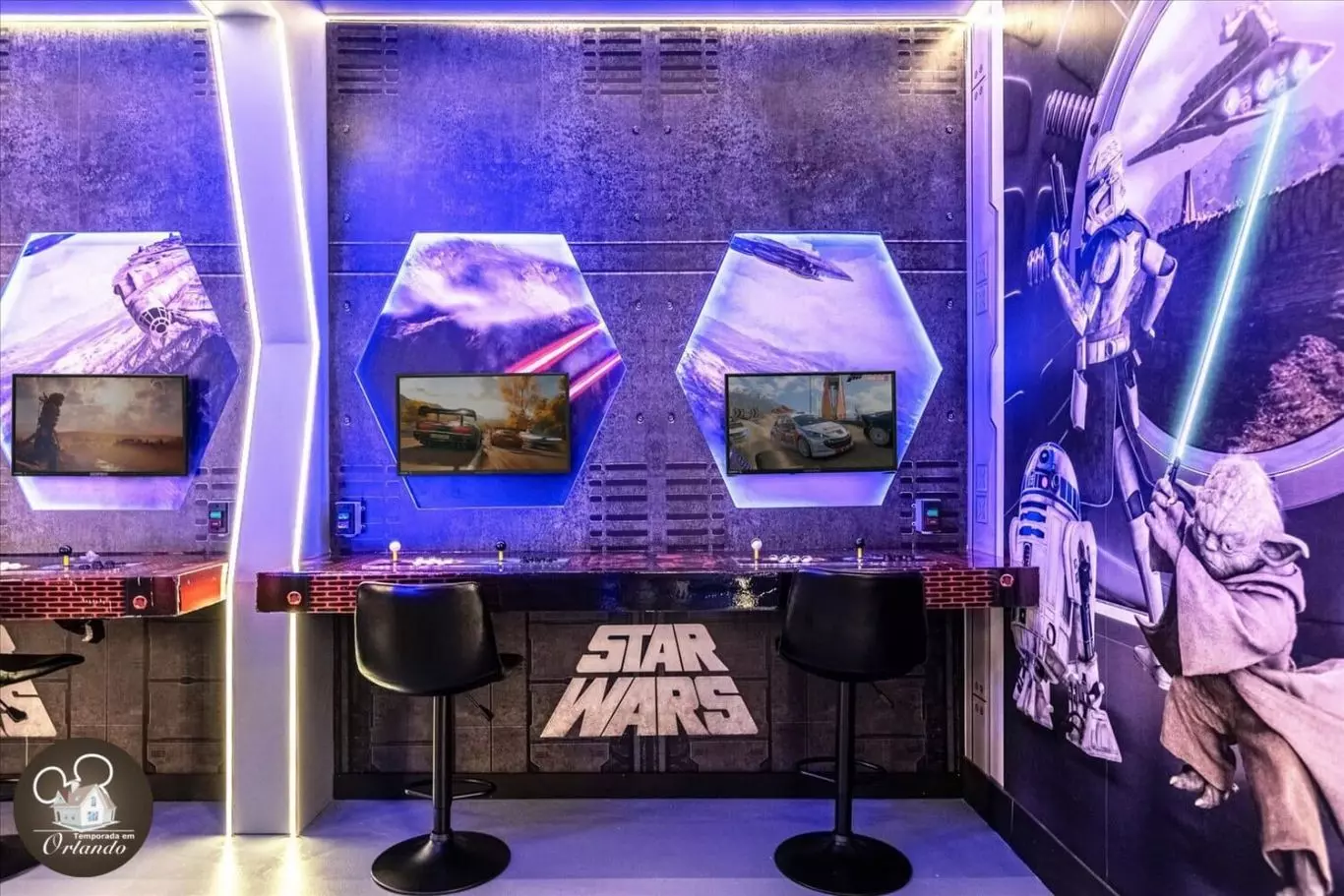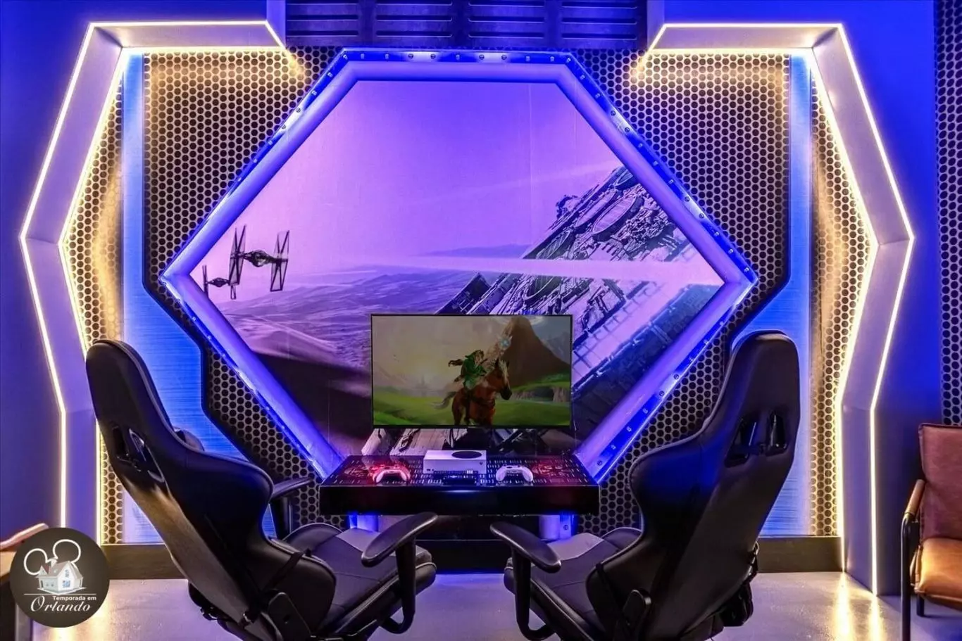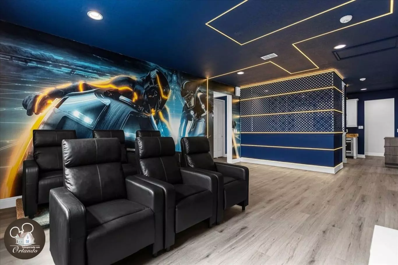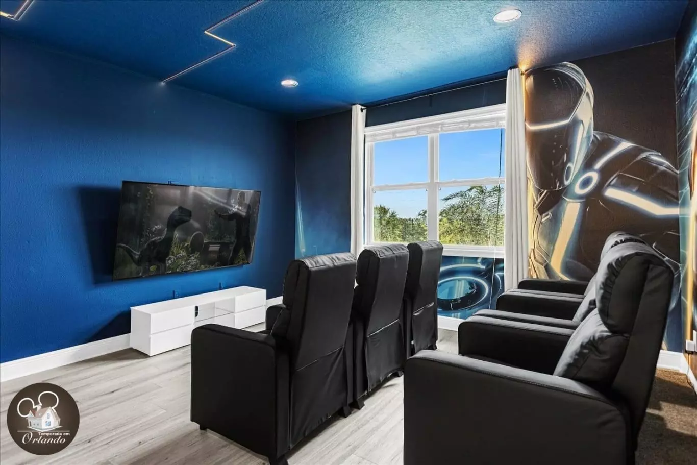 No piso superior, a sala de cinema conta com poltronas confortáveis, ideal para assistir a filmes em família após um dia nos parques.