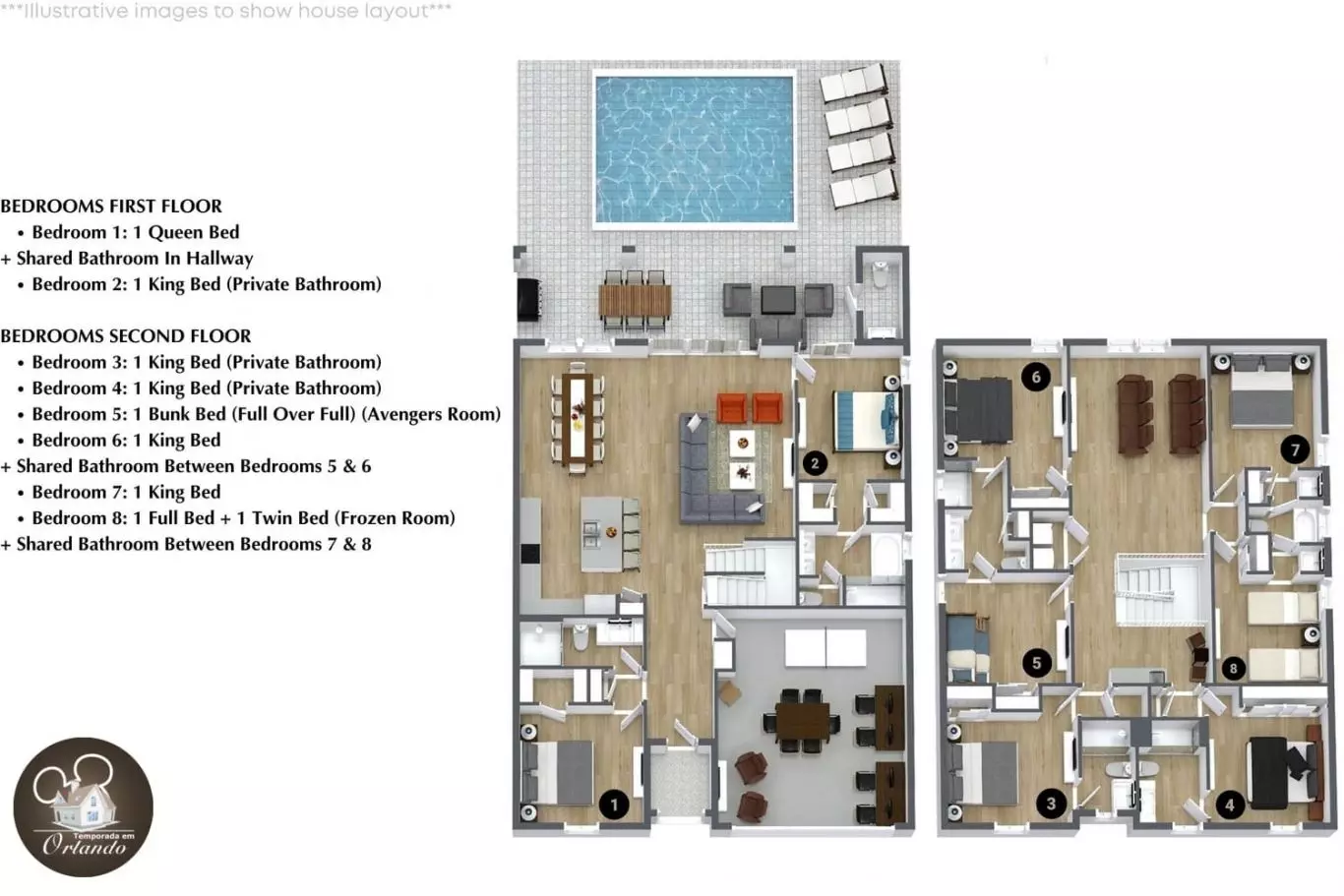 Distribuição dos quartos – acomoda até 19 pessoas com conforto