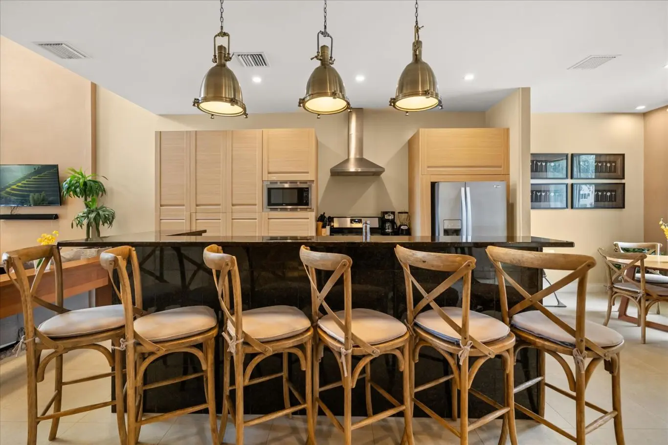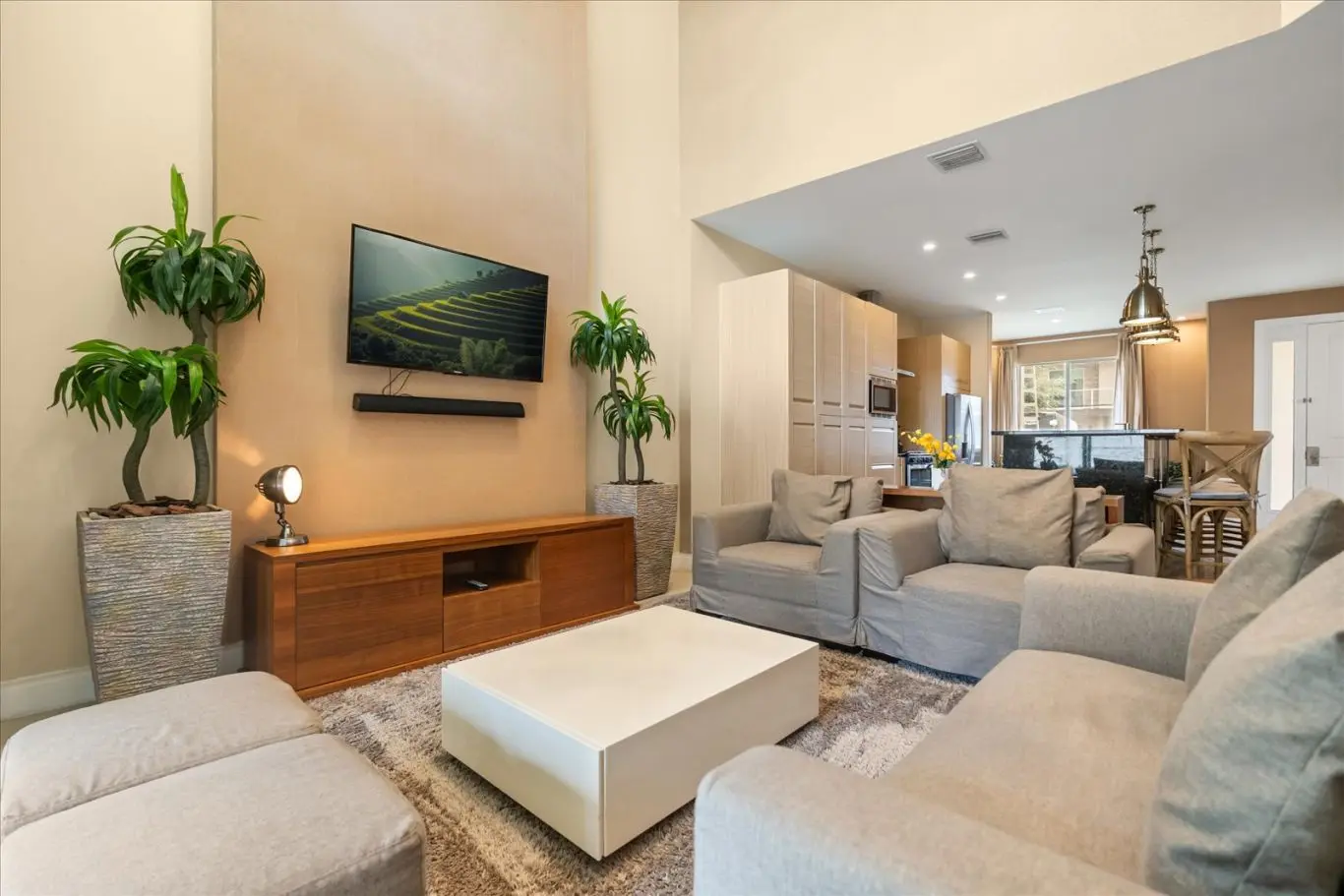 No piso térreo, a casa oferece sala de TV, sala de jantar e cozinha no estilo americano, em um espaço com arquitetura moderna e bem iluminado, ideal para convivência e descanso.