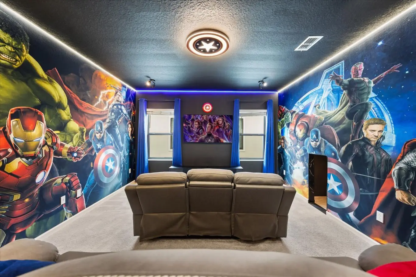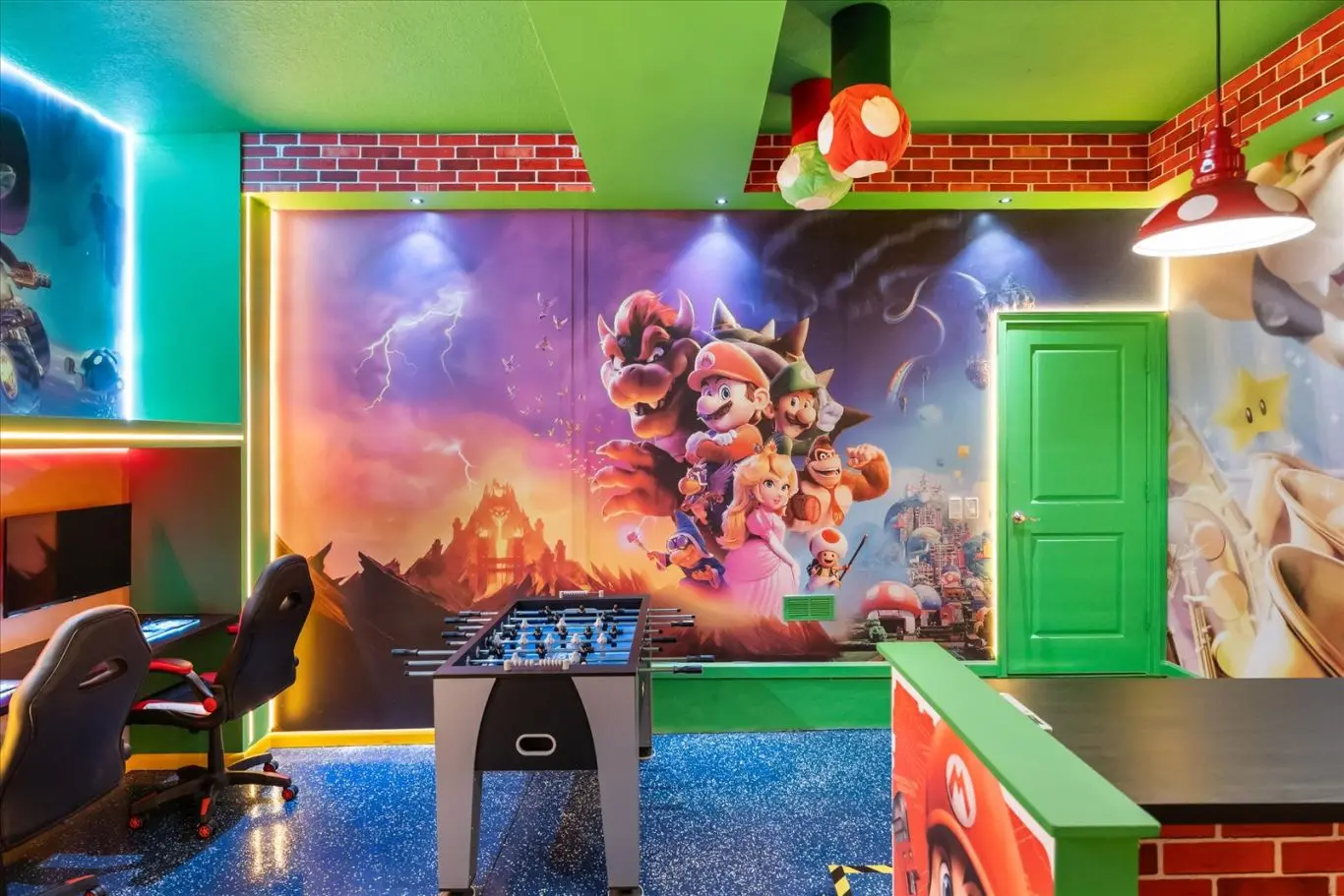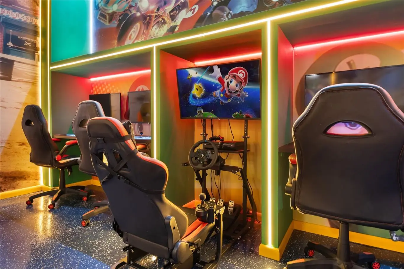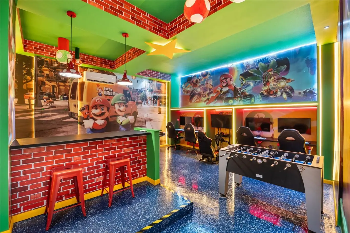 A mansão possui um salão de jogos moderno e uma sala de cinema equipada com poltronas confortáveis, perfeita para relaxar com a família e amigos após um dia nos parques.