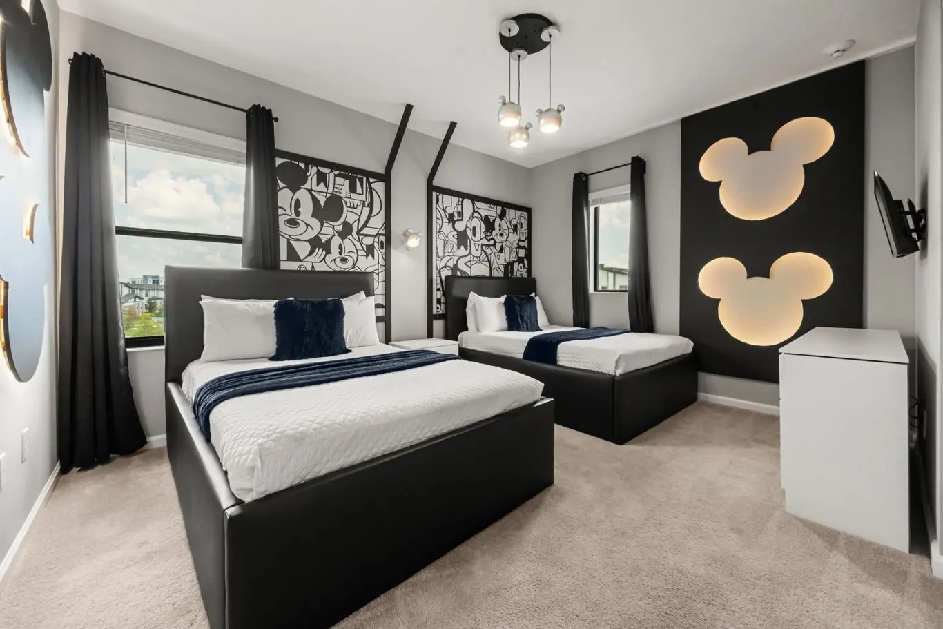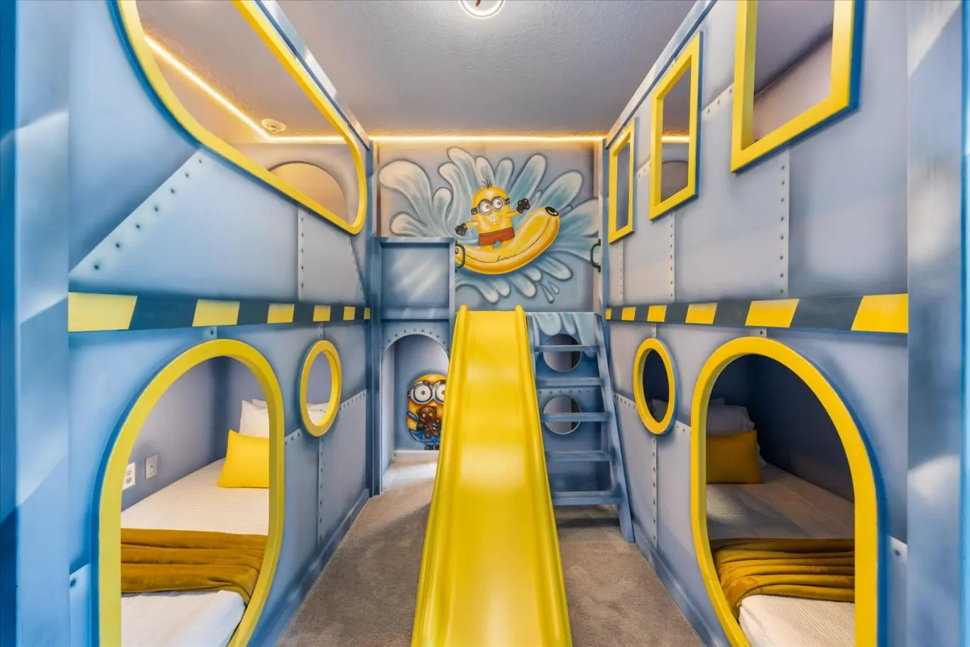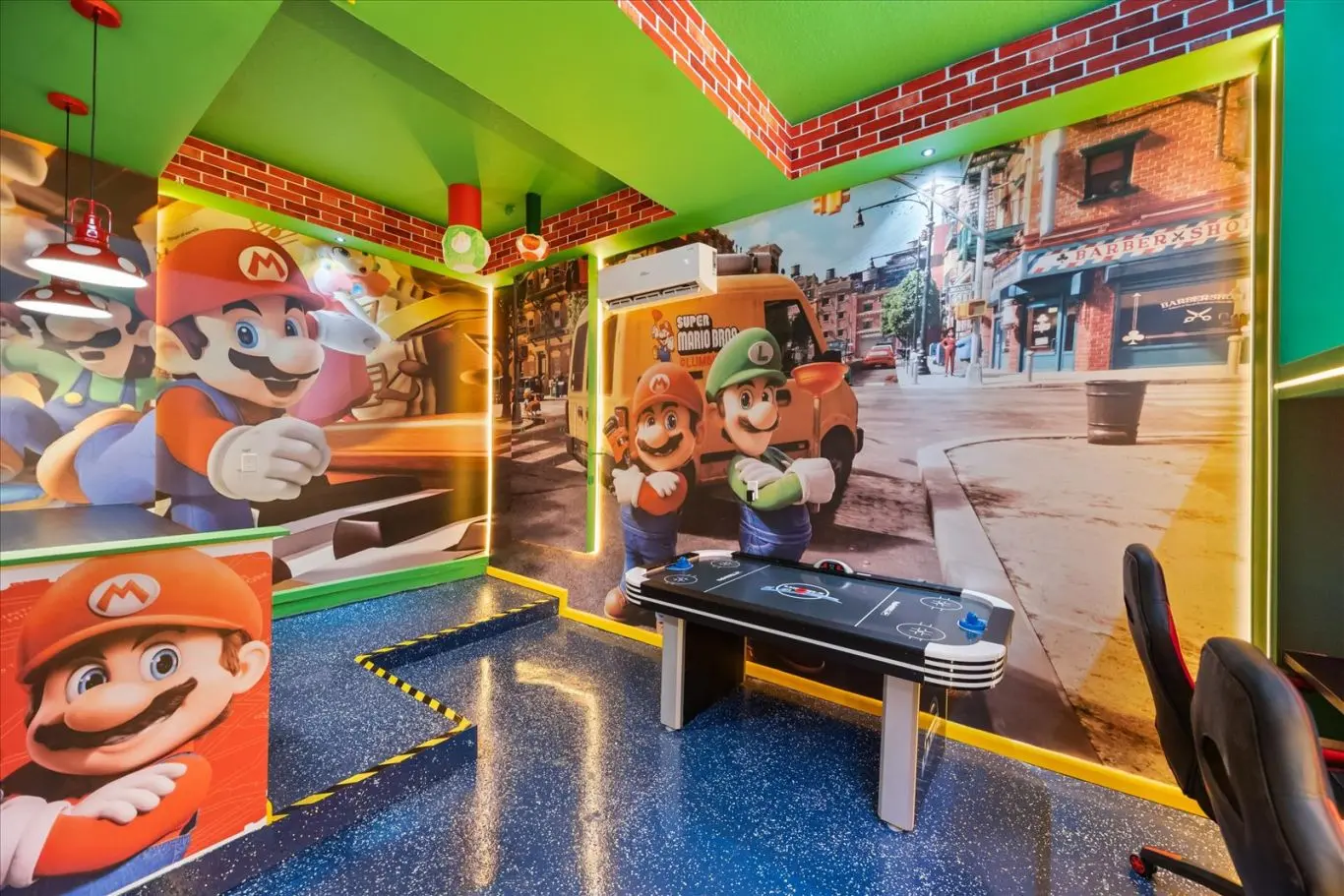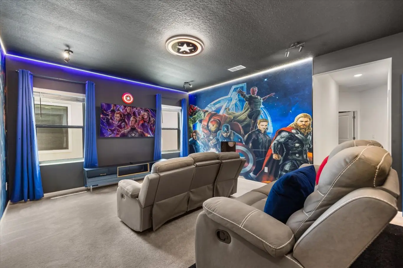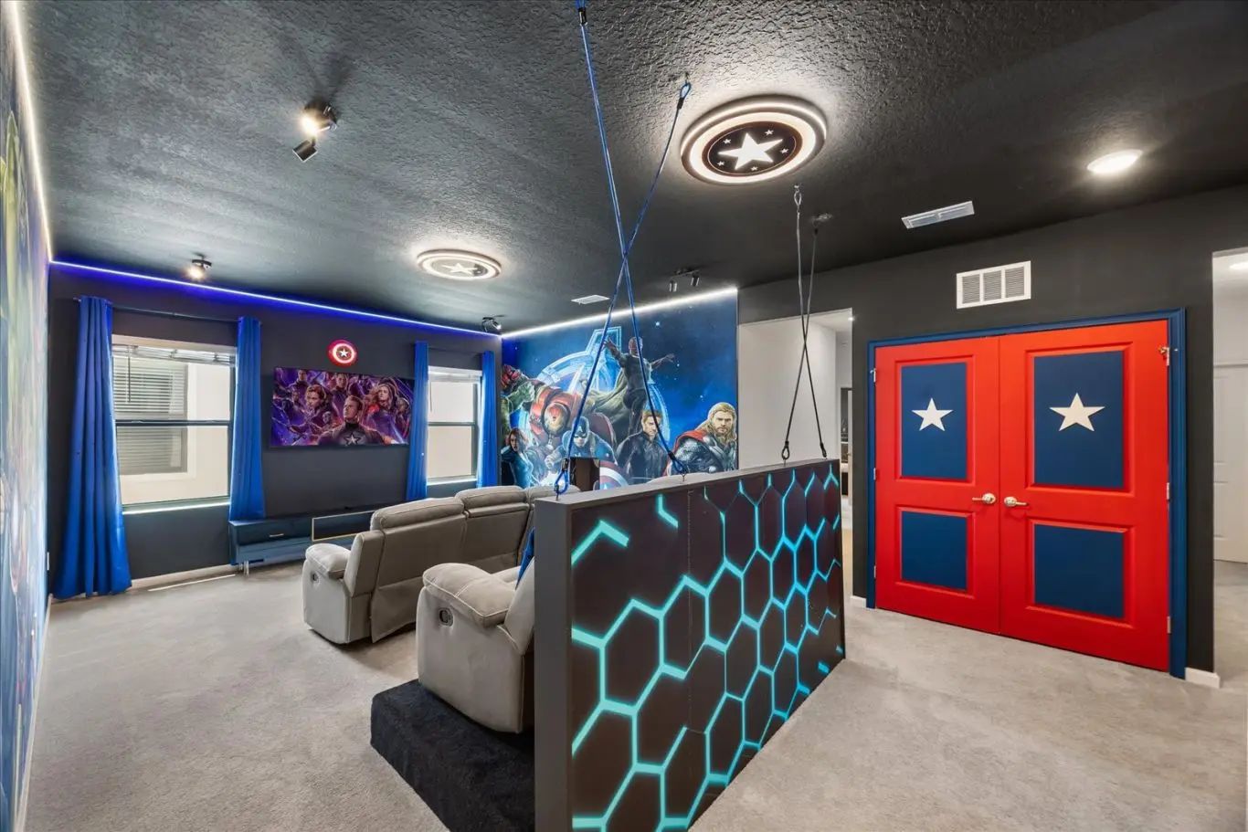 A mansão possui um salão de jogos moderno e uma sala de cinema equipada com poltronas confortáveis, perfeita para relaxar com a família e amigos após um dia nos parques.