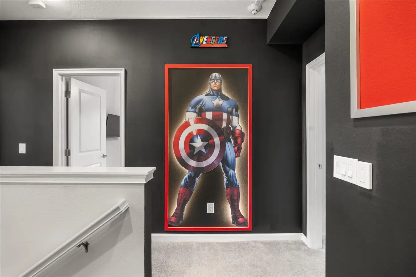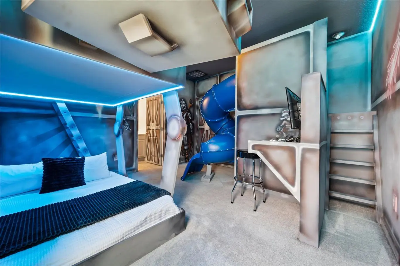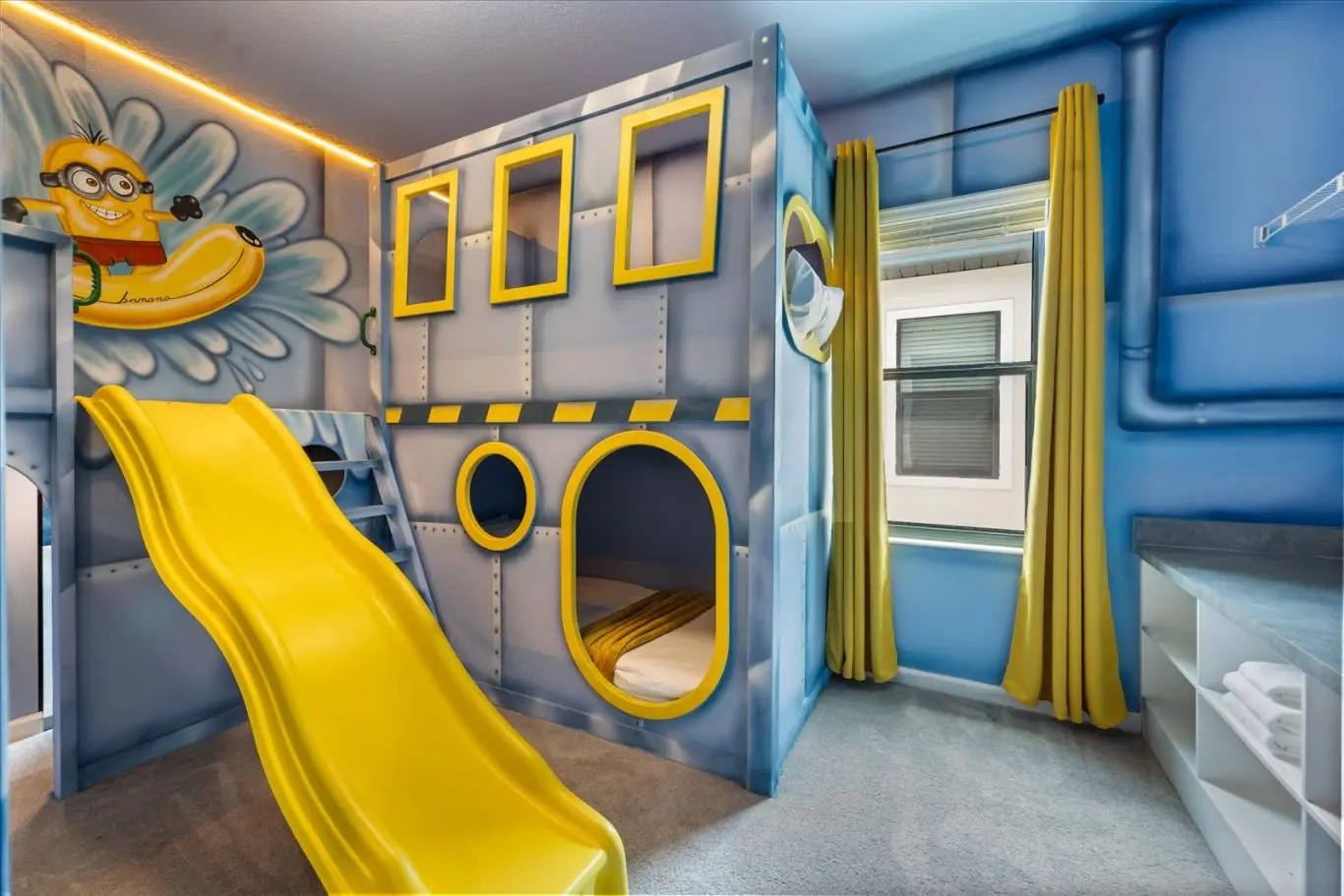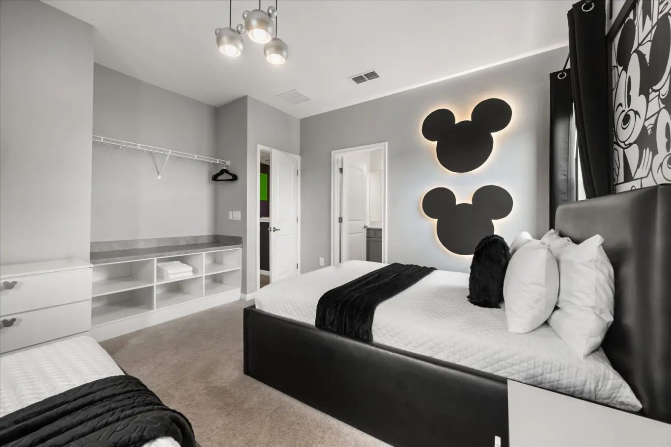 A mansão possui um salão de jogos moderno e uma sala de cinema equipada com poltronas confortáveis, perfeita para relaxar com a família e amigos após um dia nos parques.