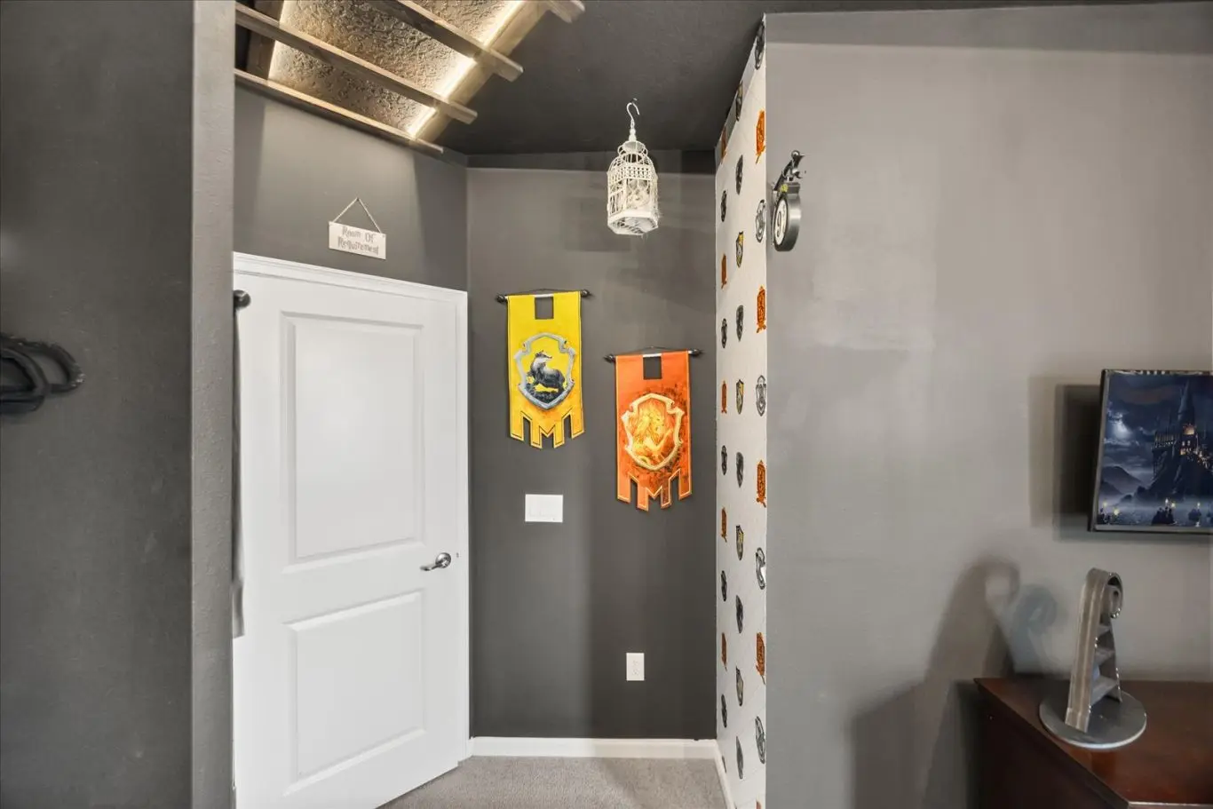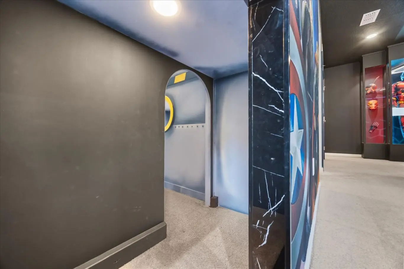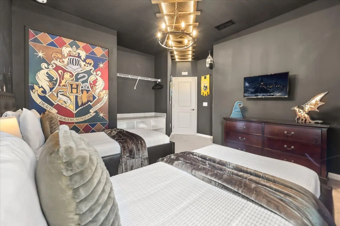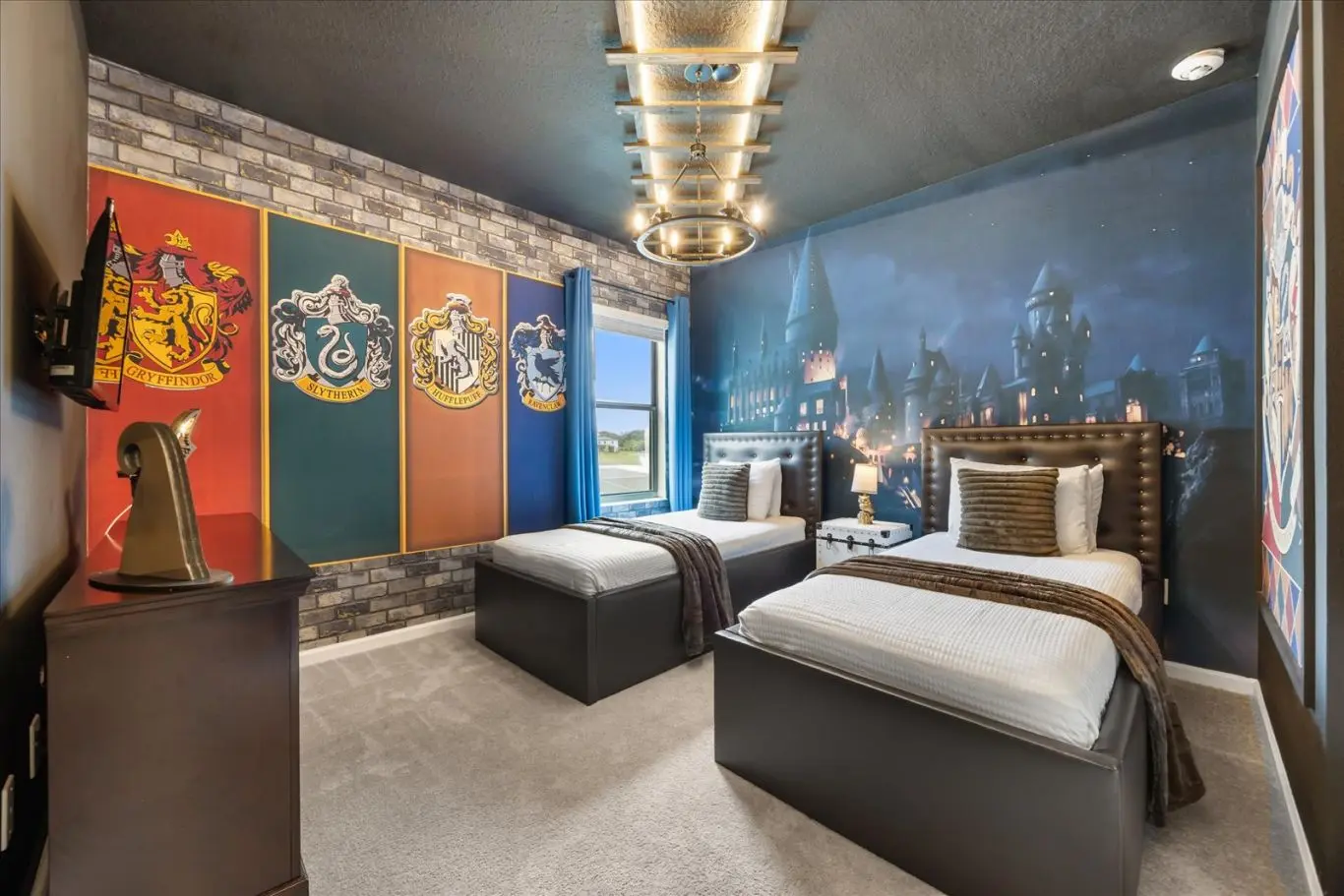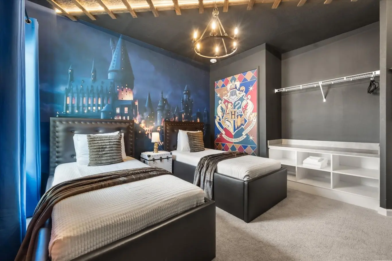 A mansão possui um salão de jogos moderno e uma sala de cinema equipada com poltronas confortáveis, perfeita para relaxar com a família e amigos após um dia nos parques.