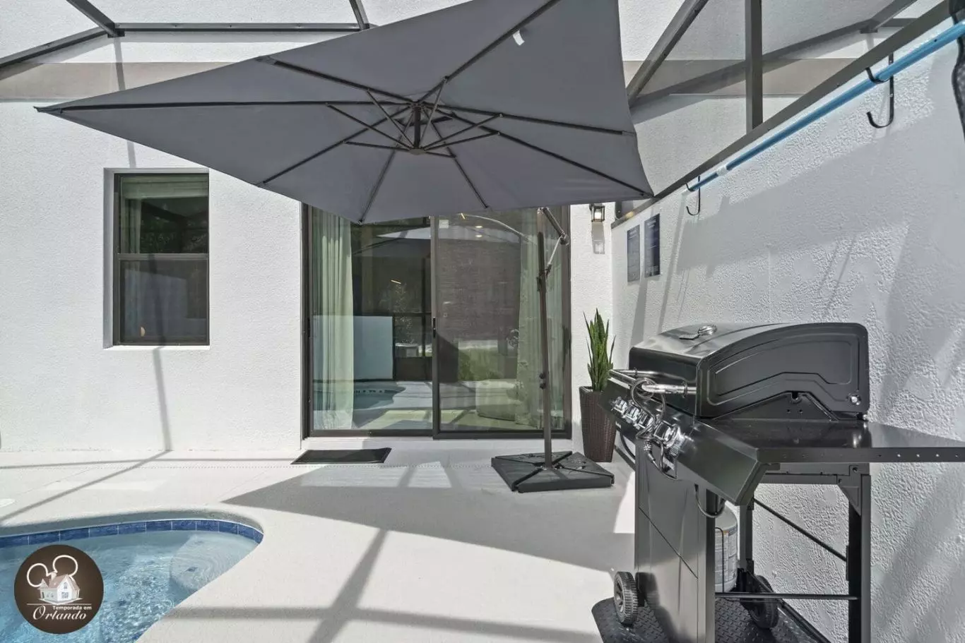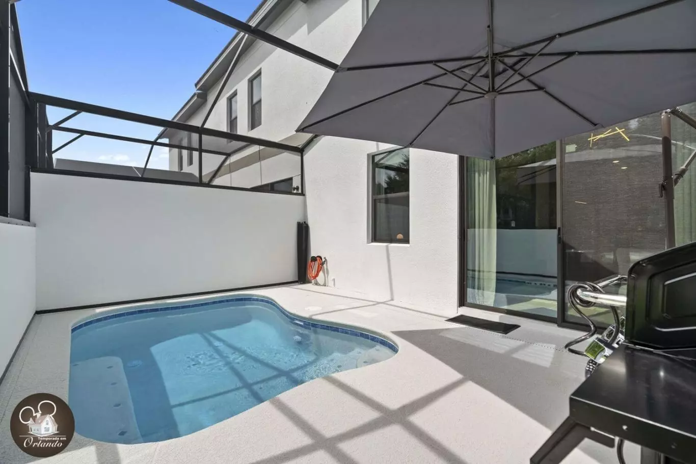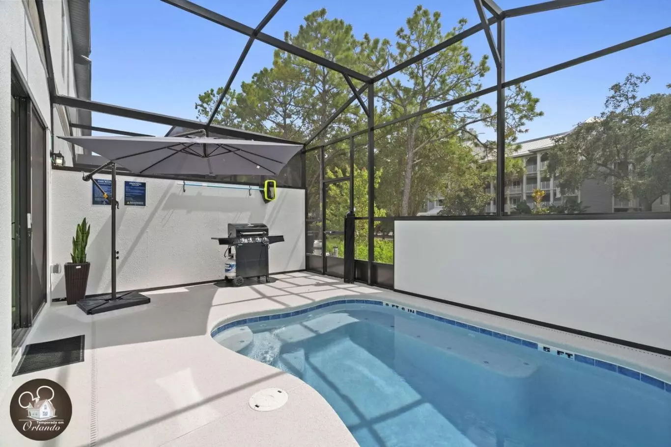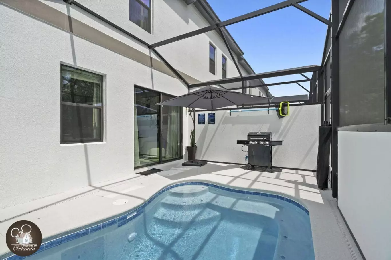A área externa é um convite ao relaxamento. A piscina privativa oferece o cenário ideal para descansar após um dia nos parques, curtir o sol da Flórida ou brincar com as crianças nas espreguiçadeiras à beira da água.