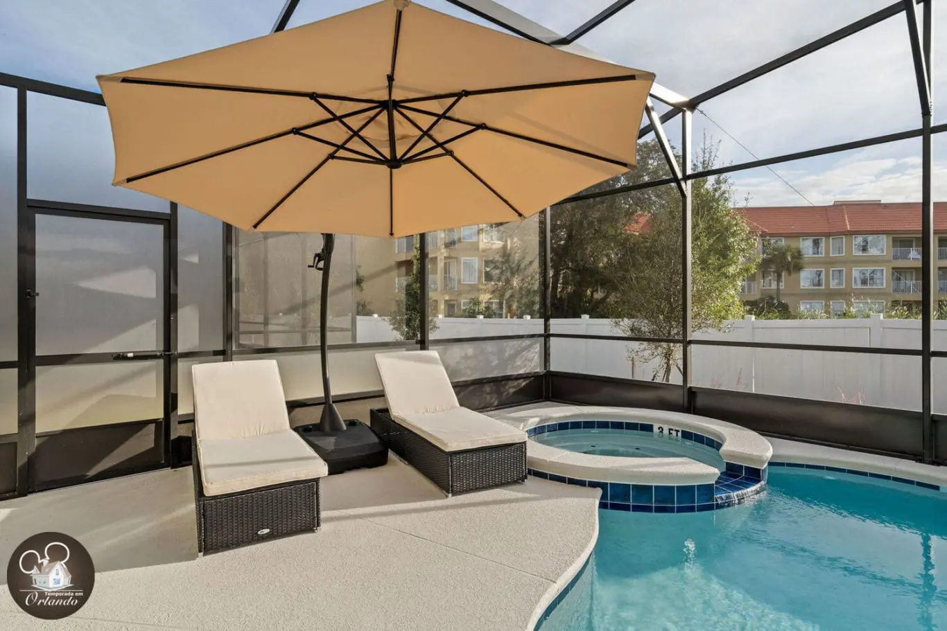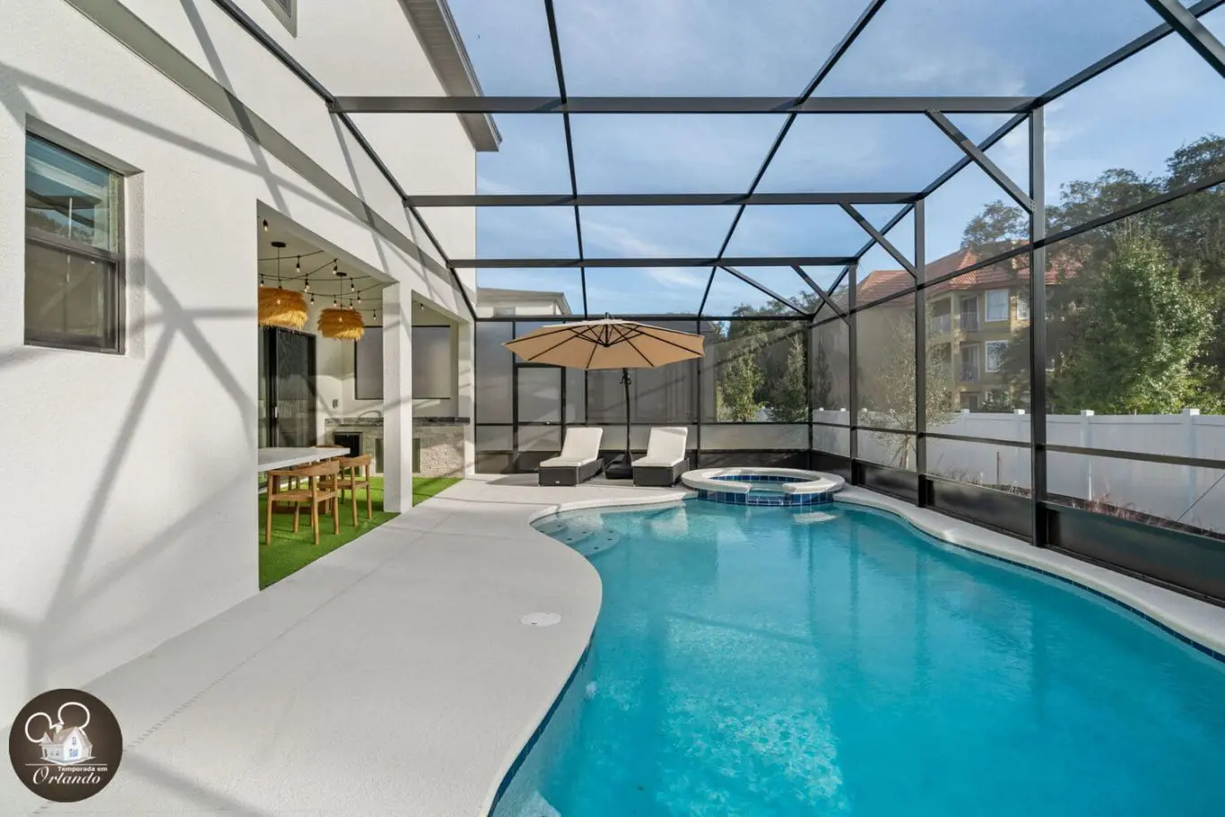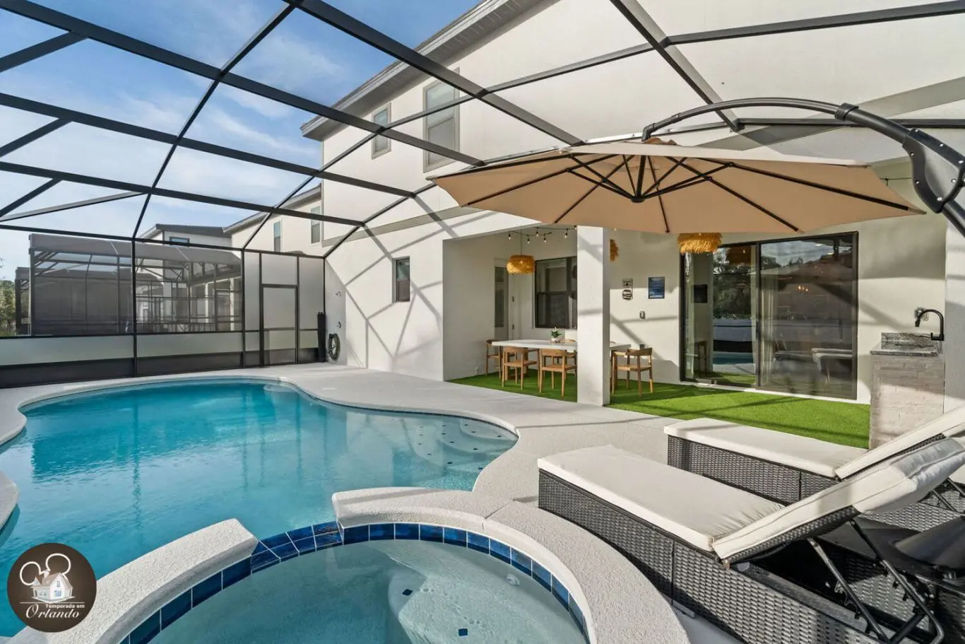 A área externa conta com piscina privativa, jacuzzi aquecida e espreguiçadeiras para quem quer descansar depois dos parques ou aproveitar um dia de sol com a família.