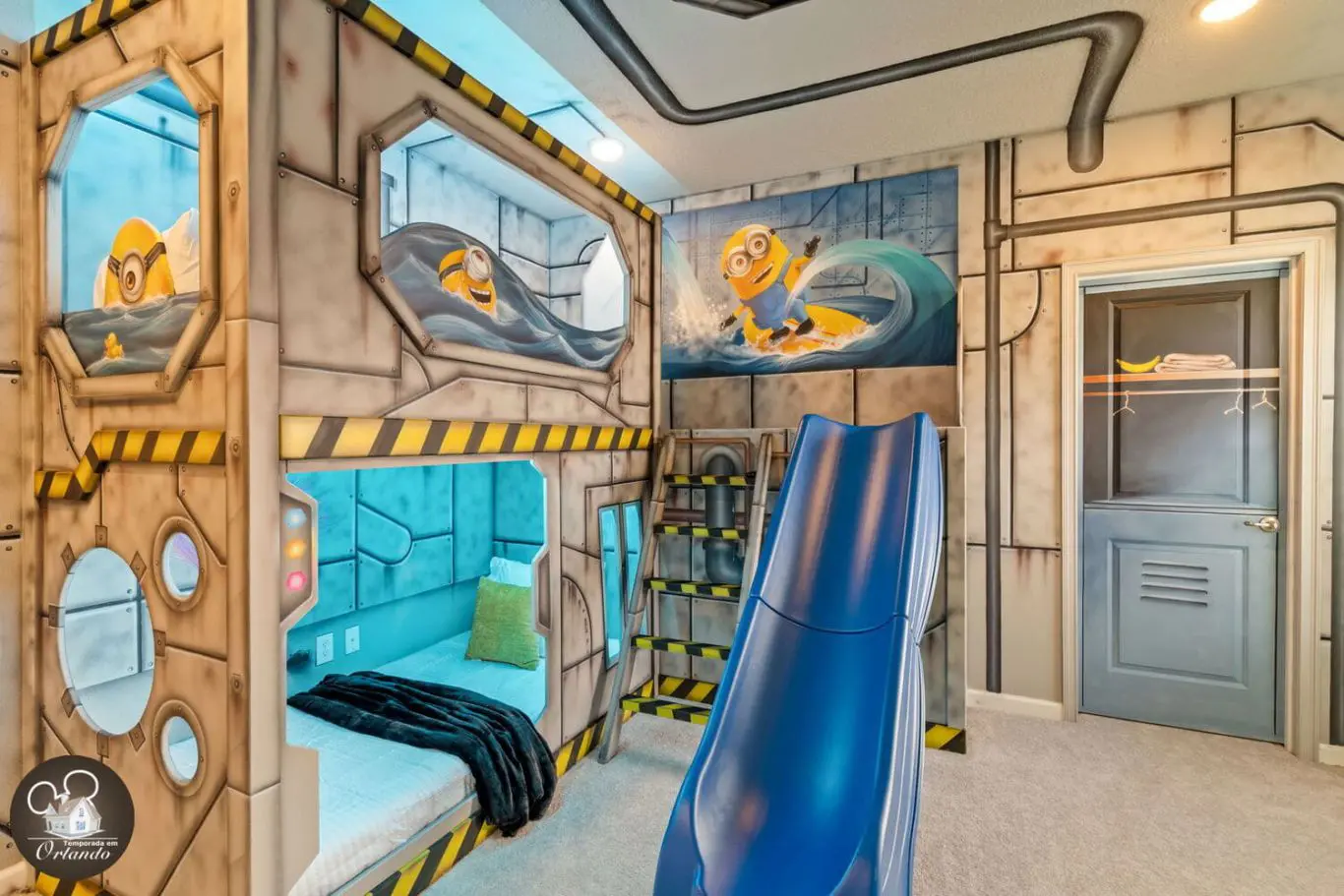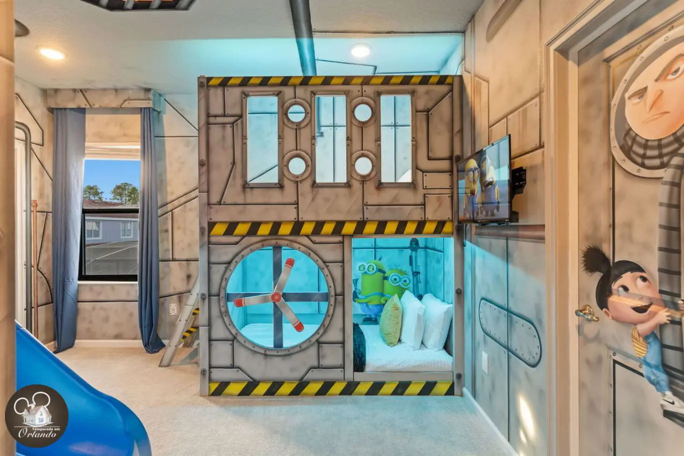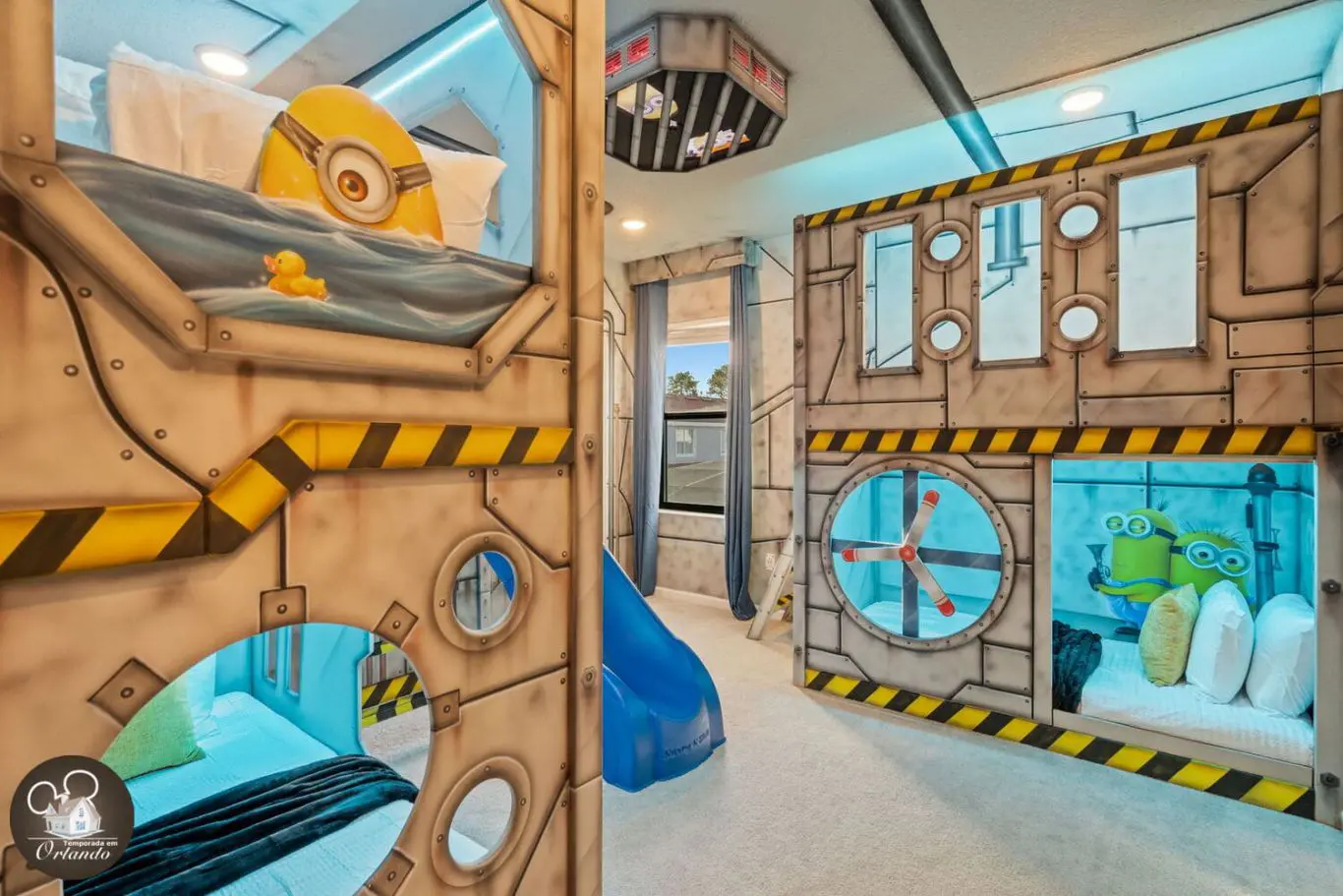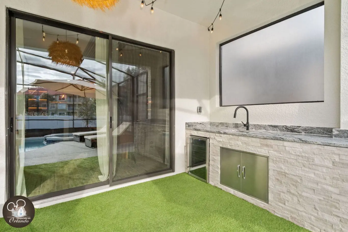 A área externa conta com piscina privativa, jacuzzi aquecida e espreguiçadeiras para quem quer descansar depois dos parques ou aproveitar um dia de sol com a família.