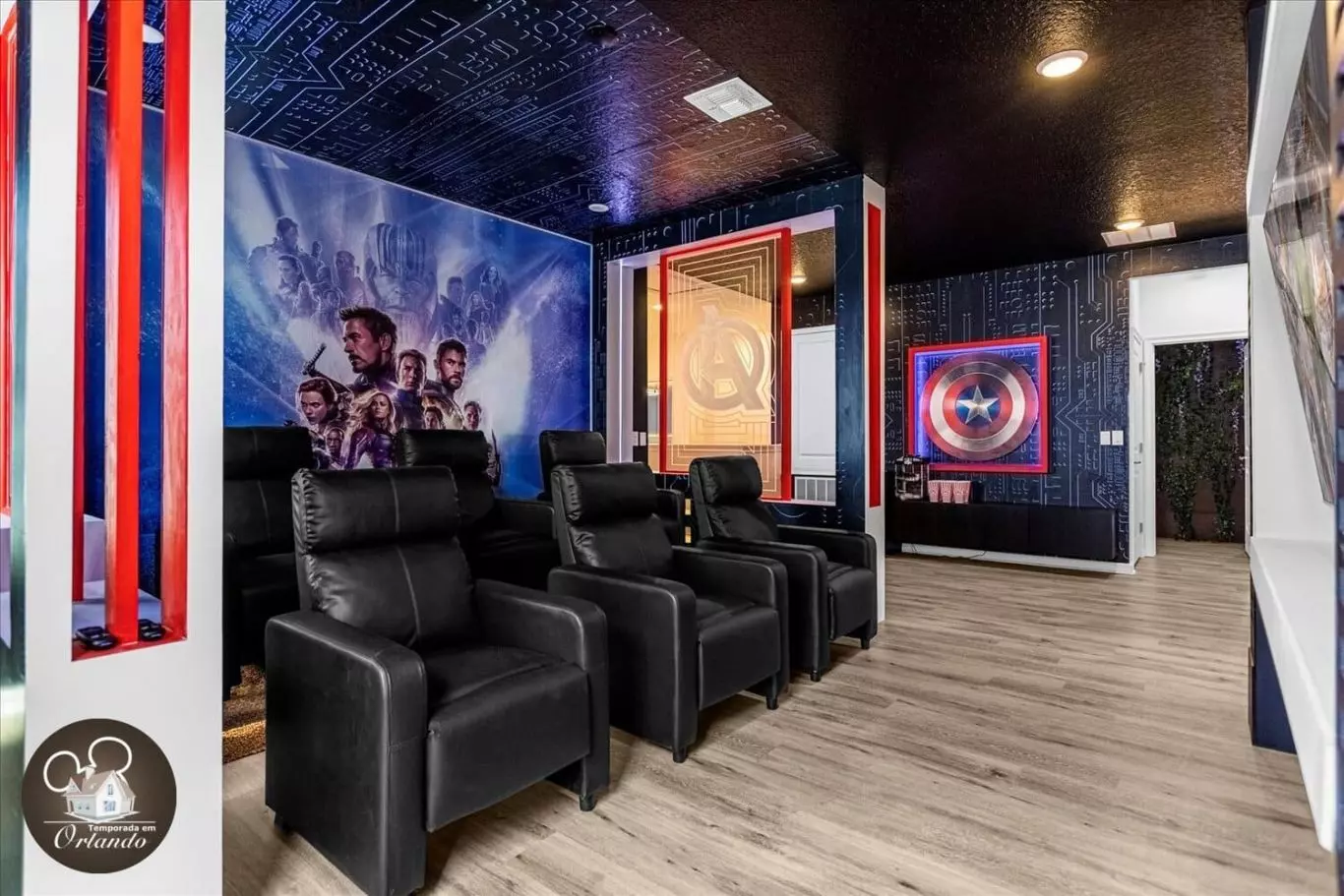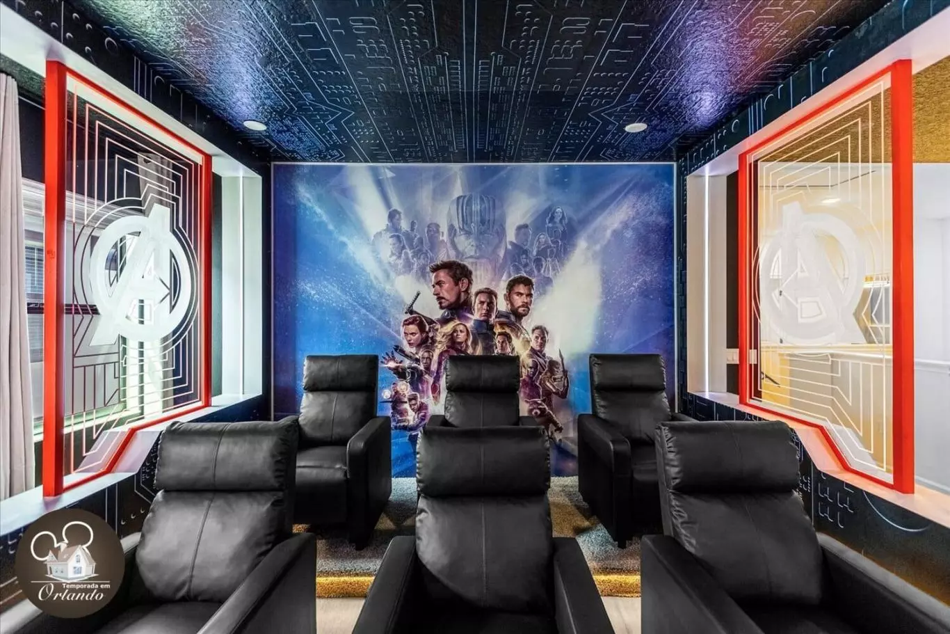 Relaxe após um dia de parques em uma sala de cinema equipada com poltronas superconfortáveis, ideal para sessões de filmes em grupo.