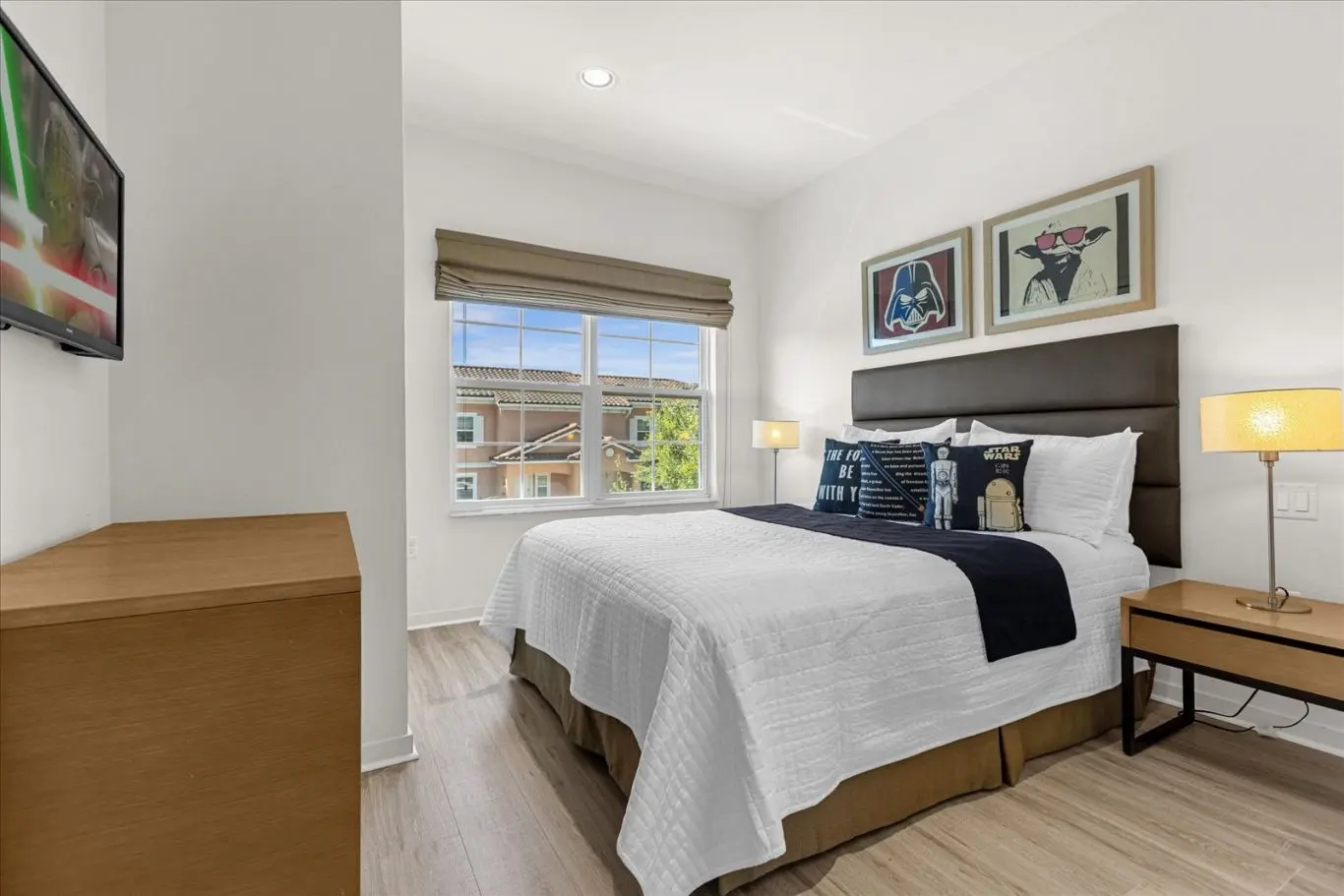 Família de 5 pessoas procurando um lugar limpo, seguro e conveniente para ficar para a nossa viagem à Disney! Este foi o melhor negócio e o bairro é fechado, com piscinas e uma casa de clube. Havia um pequeno mercado dentro do clube principal onde podíamos comprar lanches e bebidas. Eles até tinham um restaurante de serviço completo, não comemos lá, mas parecia bom. Havia mesas de pingue-pongue lá e uma grande piscina com famílias e crianças. Nossa casa era limpa e confortável. Eles tinham uma banheira de hidromassagem, mas não conseguimos usá-la. Acho que estava muito quente para ficarmos nos parques o dia todo. Belo pátio traseiro e estando na unidade final, tivemos uma brisa tão boa e mais privacidade, parecia. Levamos cerca de 14 minutos para dirigir até o Magic Kingdom e os parques da Disney. Era uma ótima localização. A equipe forneceu cápsulas de café e a cozinha tinha muitas panelas e frigideiras que eu usei para cozinhar o jantar. Ter 3 quartos foi ótimo para nossos filhos terem seu próprio espaço e os temas para os quartos foram legais. Um de Star Wars e o outro do Mickey!