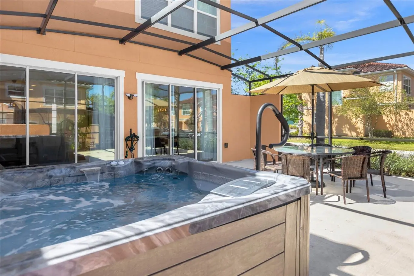 Para maior praticidade, há lavanderia com máquina de lavar e secar, além de uma área externa perfeita para relaxar: jacuzzi privativa nos fundos, com vista para o jardim, ideal para momentos de descanso após os parques.