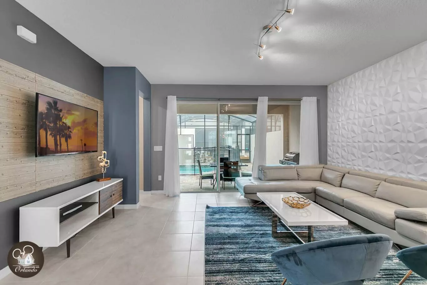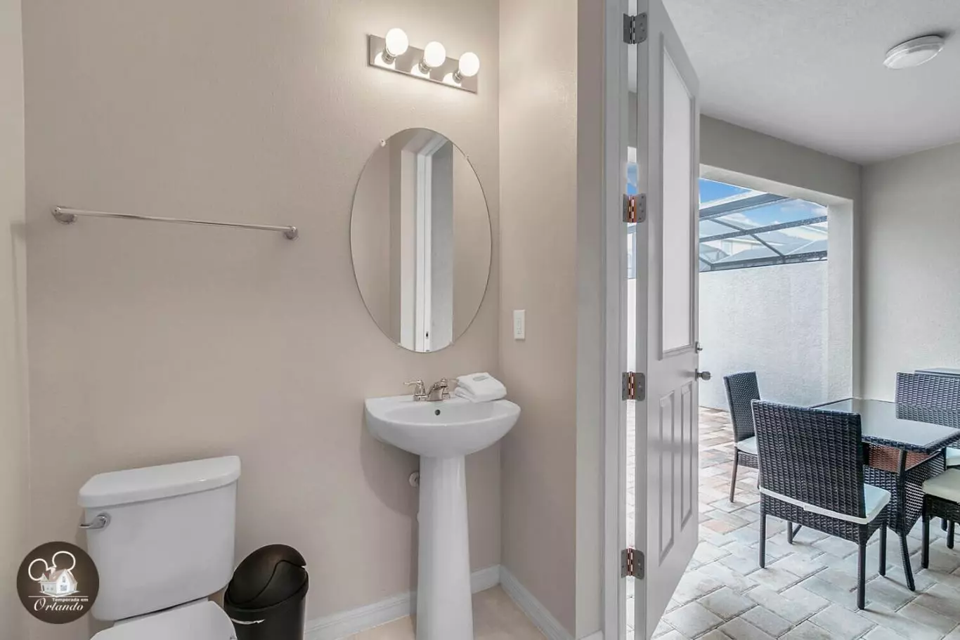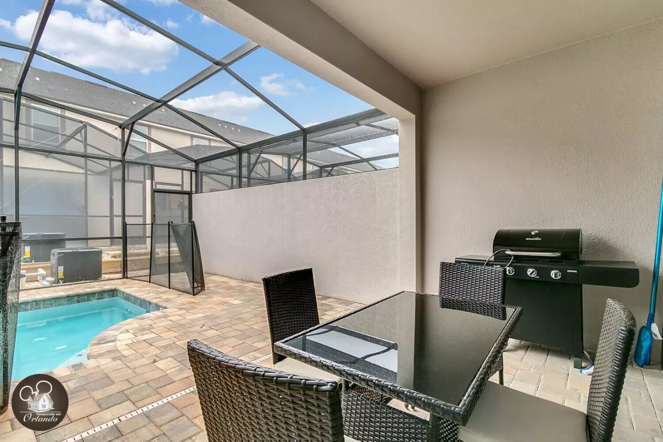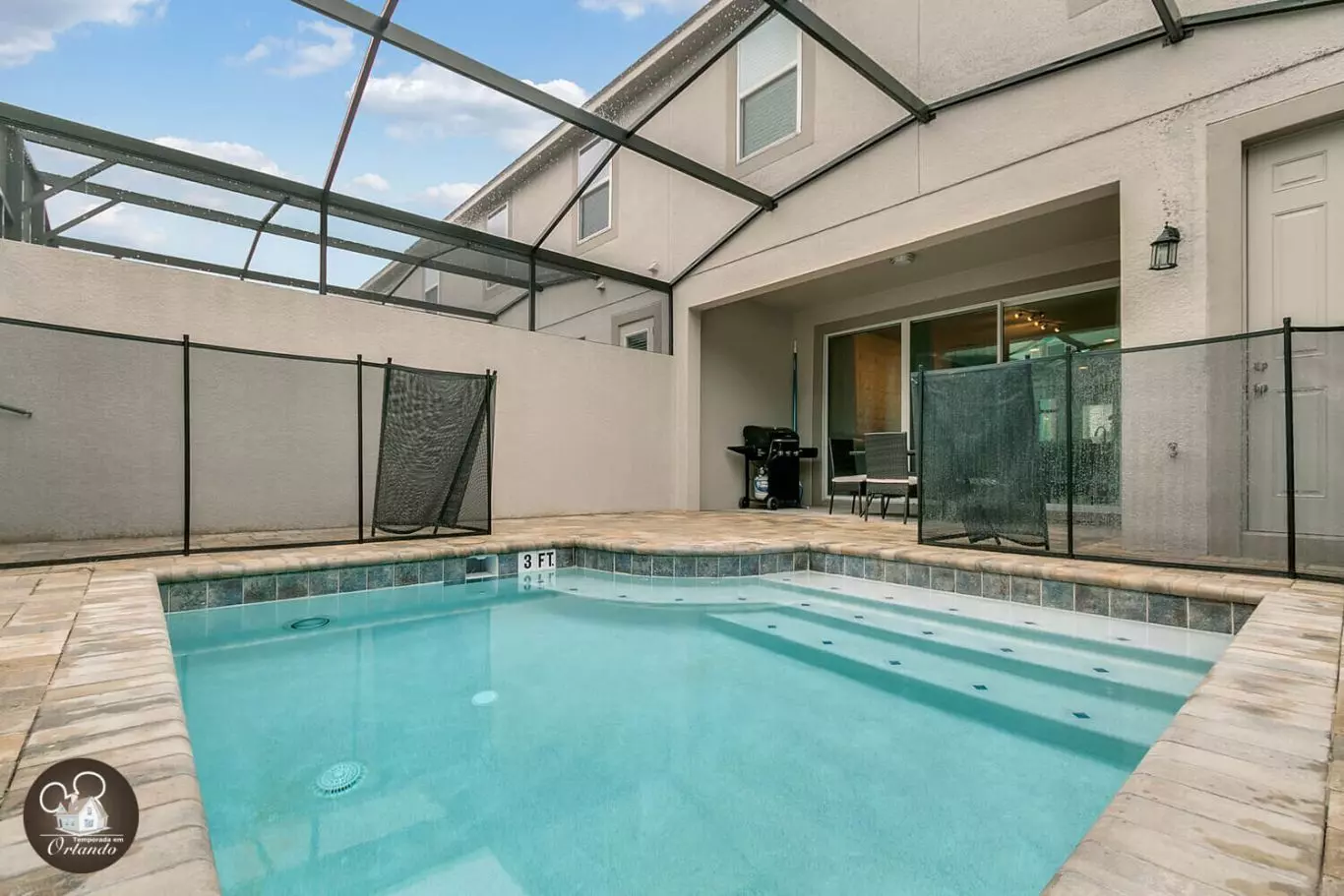 A área de lazer da casa conta com uma piscina privativa, ideal para relaxar com a família e curtir o clima da Flórida com privacidade total. Perfeita para momentos de descanso e diversão após os parques.