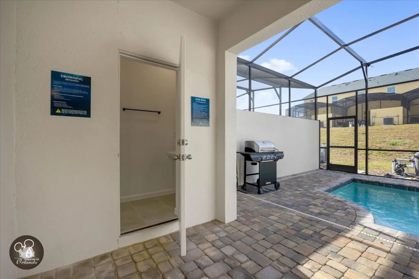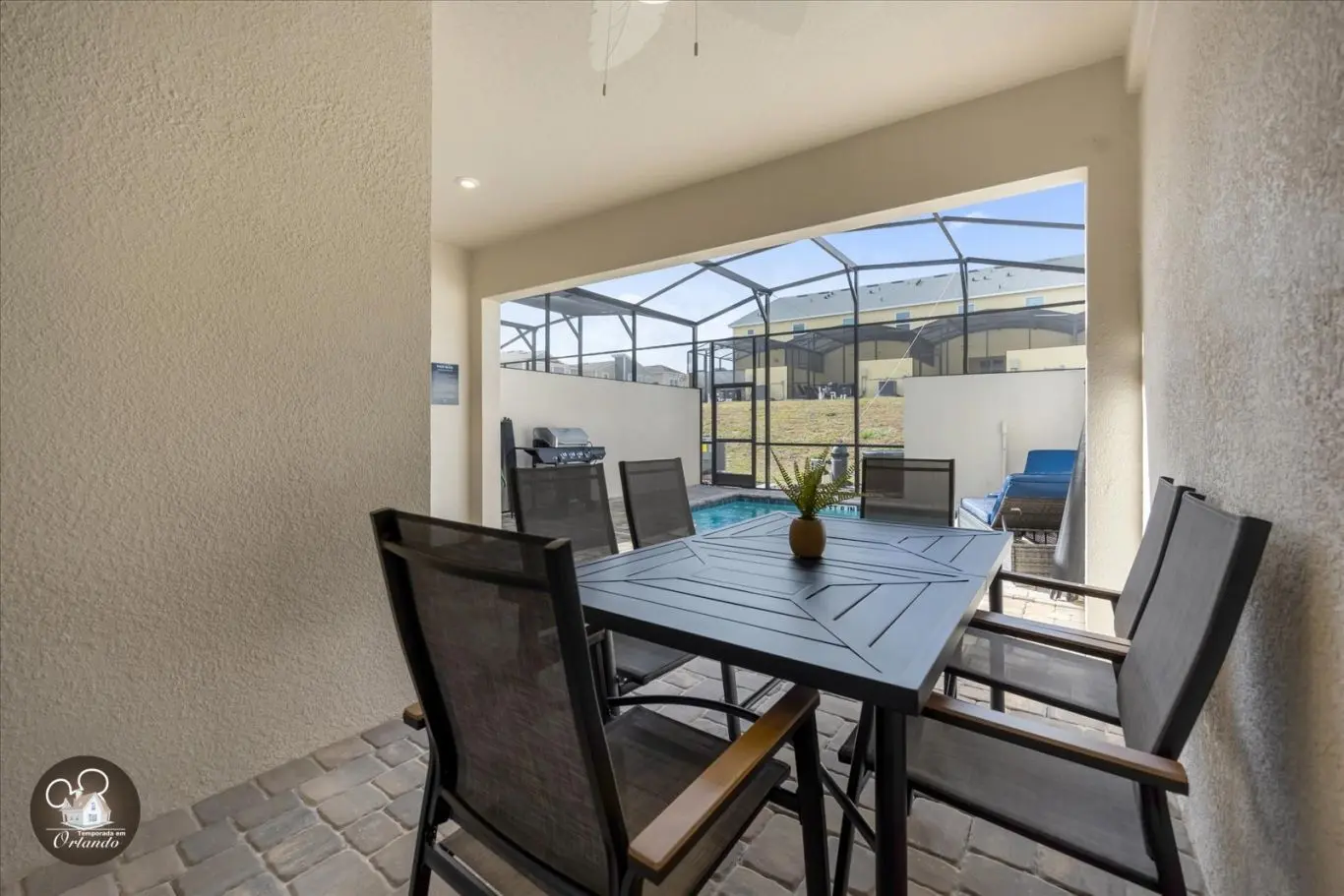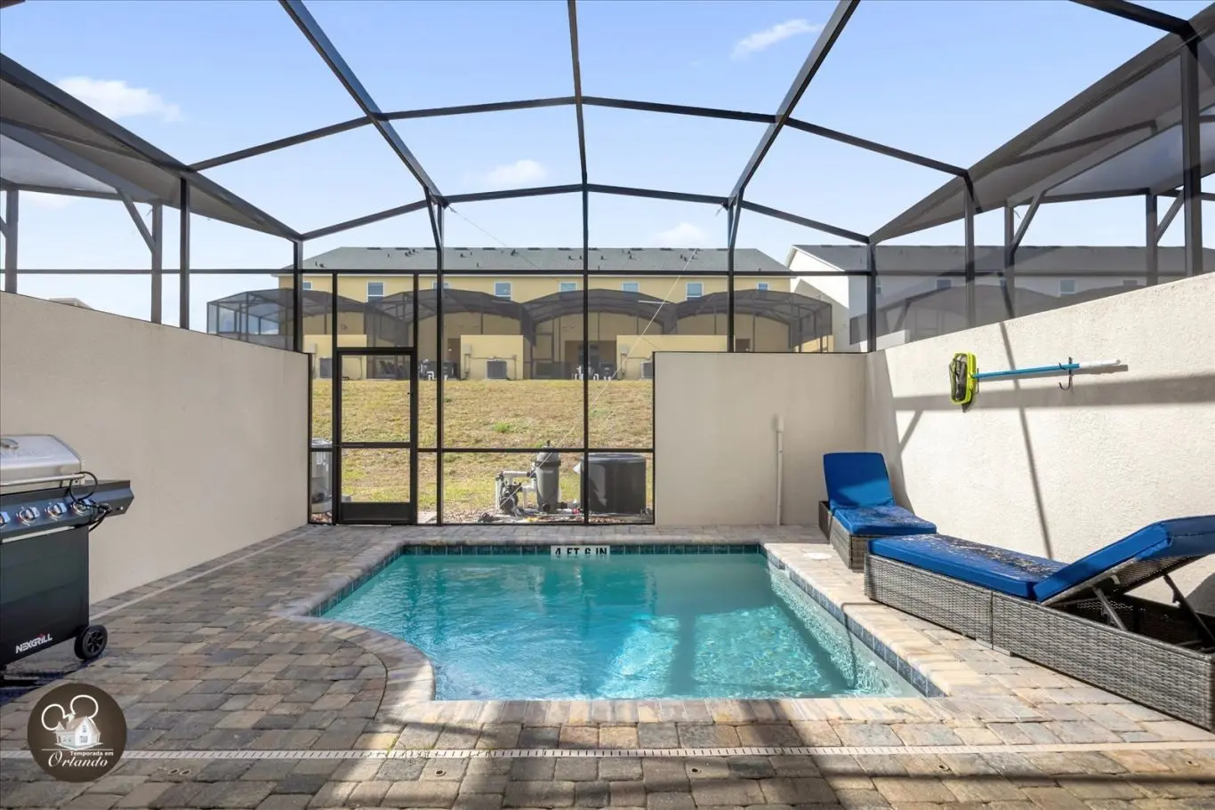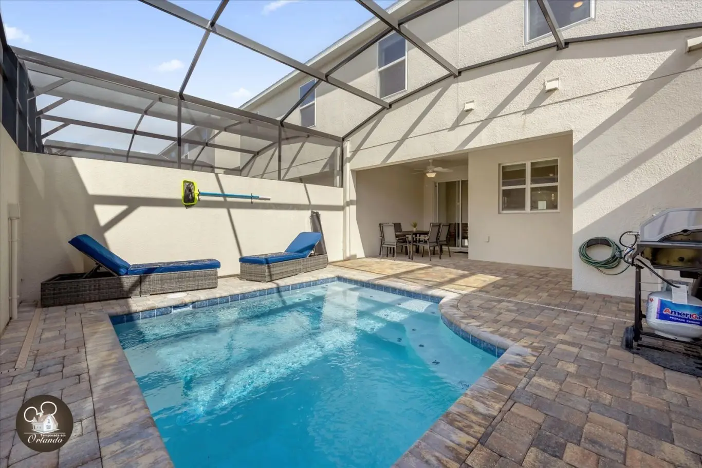 A área externa conta com uma piscina exclusiva e espreguiçadeiras, ideal para relaxar após um dia intenso nos parques. Um verdadeiro oásis particular para sua viagem.
