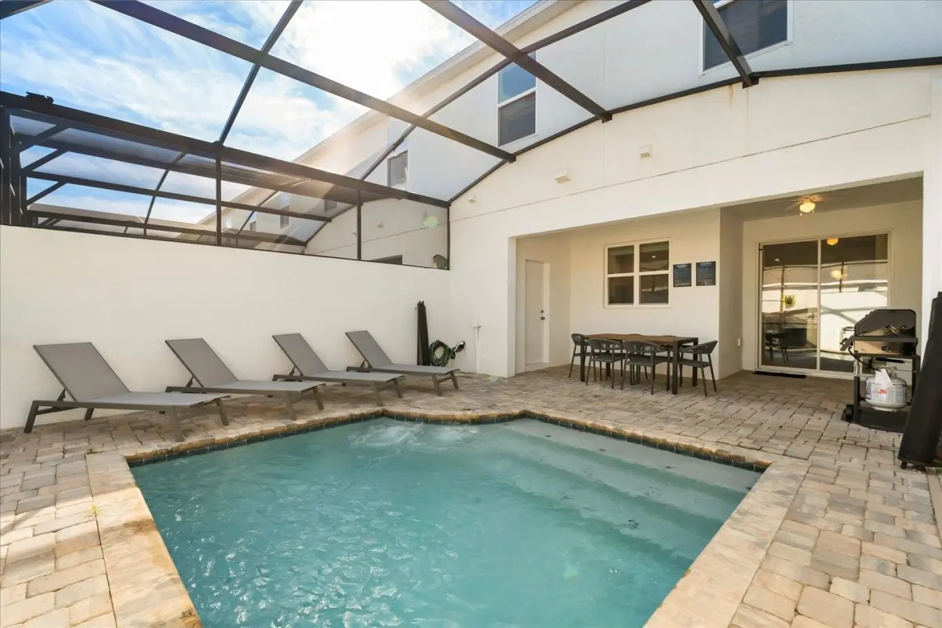A área externa conta com uma piscina exclusiva e espreguiçadeiras, ideal para relaxar após um dia intenso nos parques. Um verdadeiro oásis particular para sua viagem.