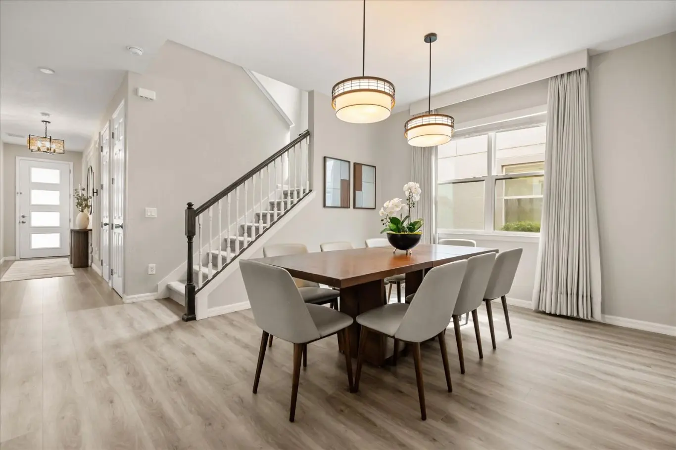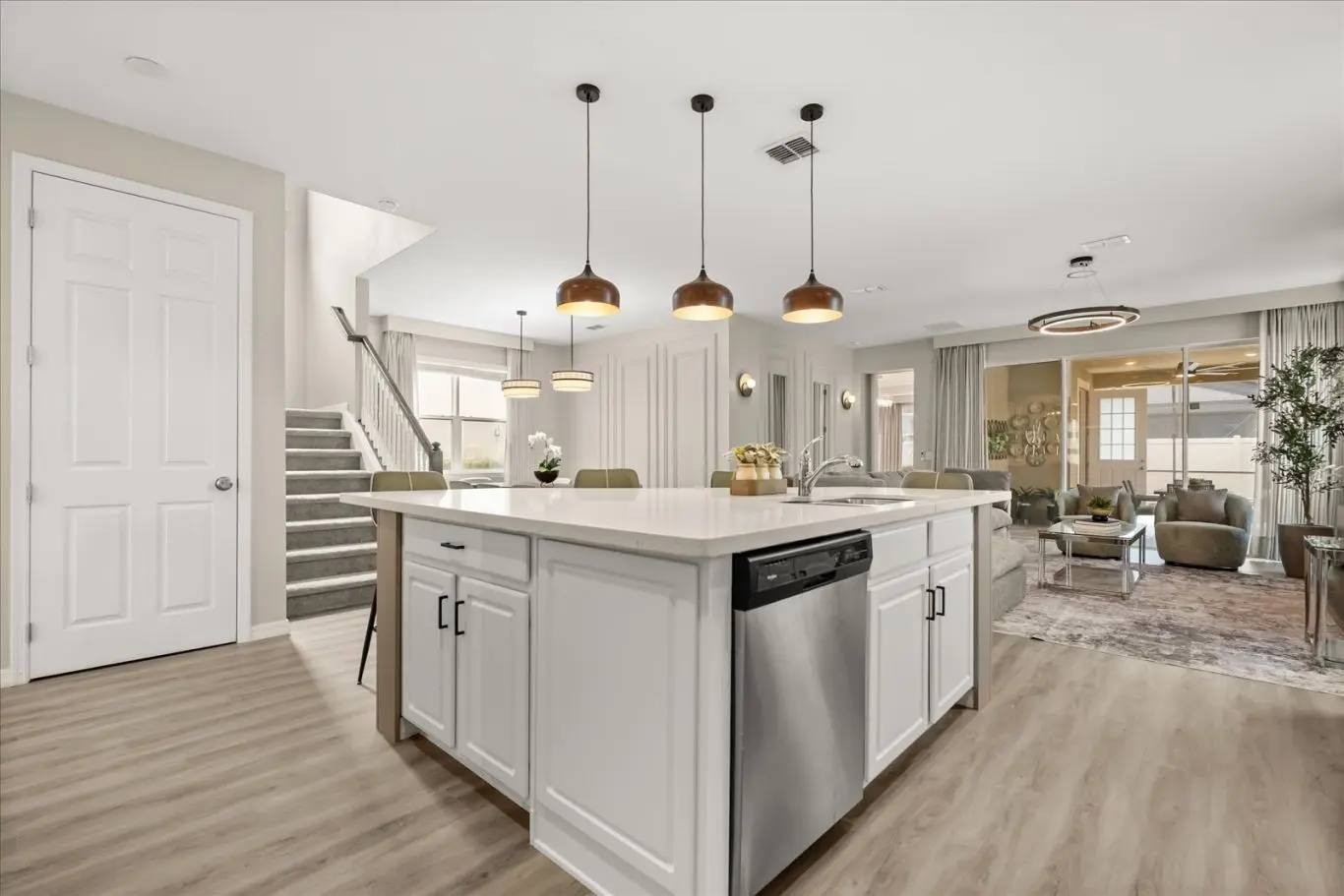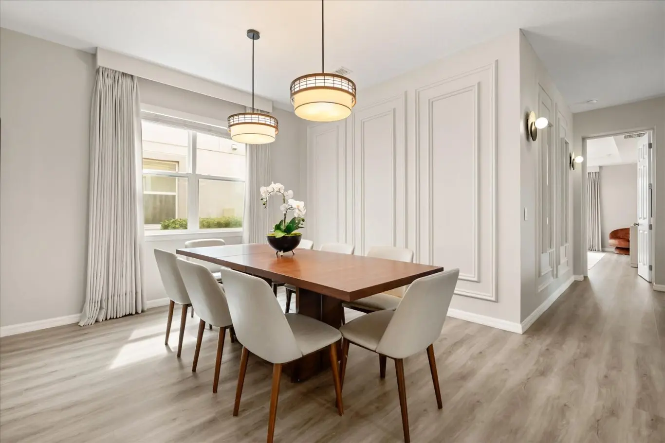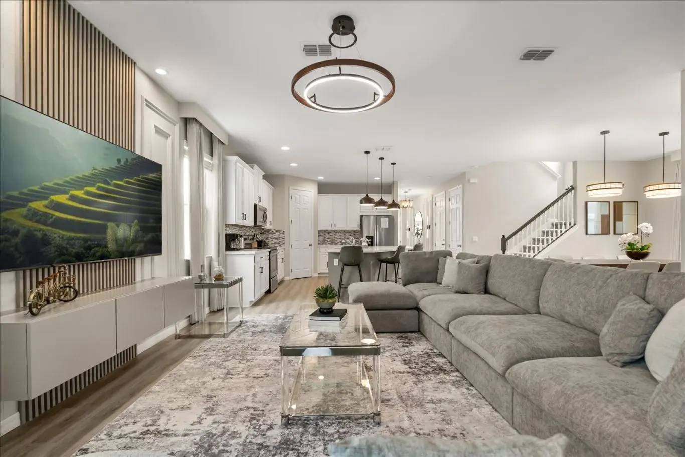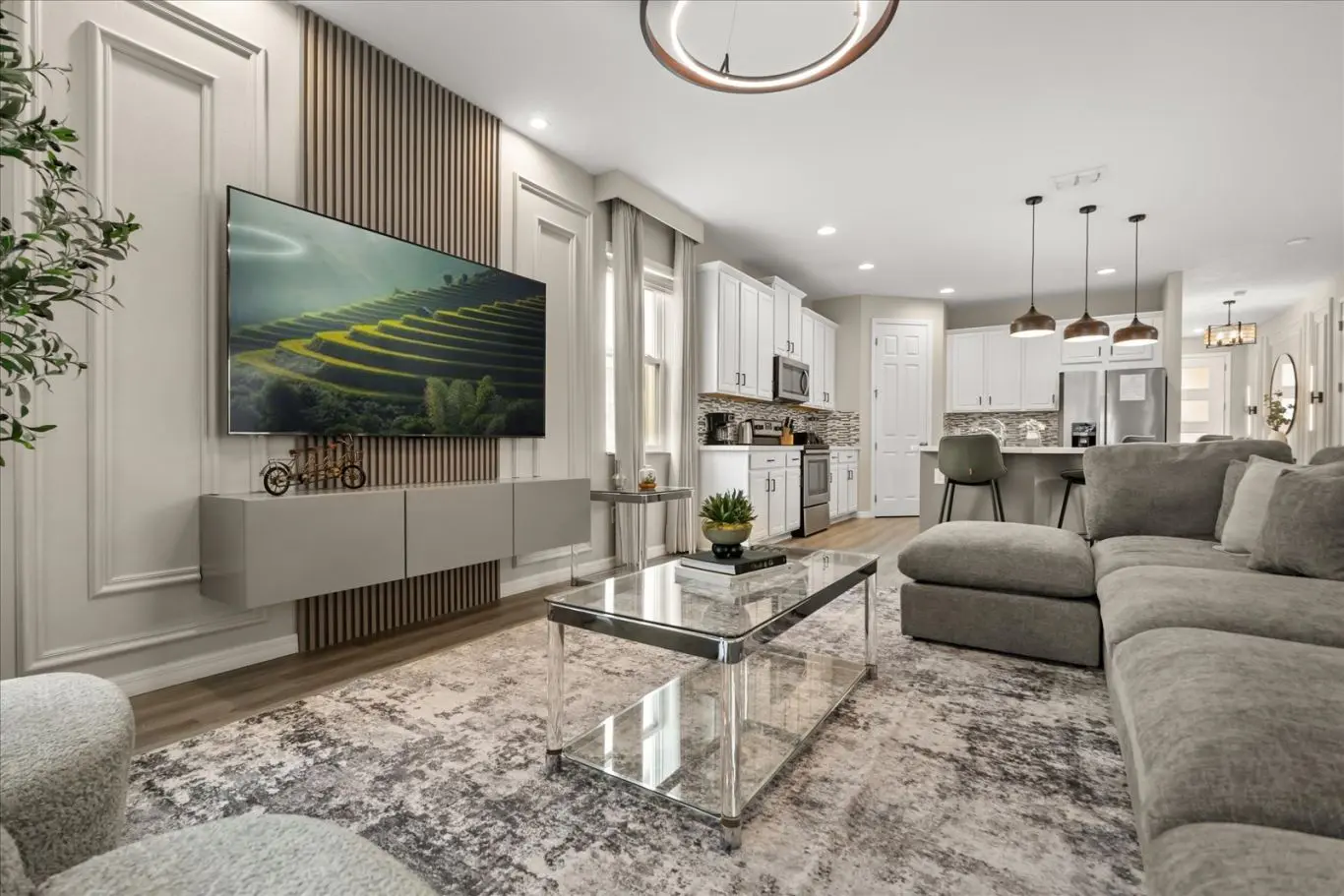Ao entrar, você será recebido por uma sala de TV, sala de jantar e uma cozinha em estilo americano. O ambiente é decorado com tons suaves em palha, criando uma sensação de harmonia, conforto e elegância.
