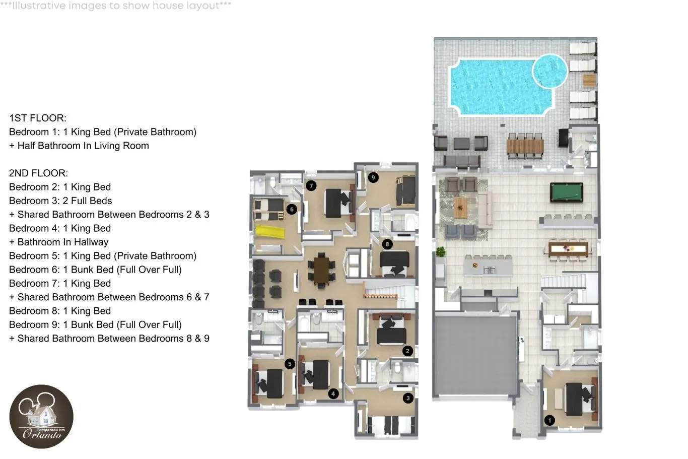 Se você está planejando férias em grupo ou em família em Orlando, essa mansão é o lugar ideal para unir conforto, diversão e localização estratégica. Com 9 quartos e capacidade para até 24 pessoas, essa propriedade de alto padrão no Solara Resort oferece uma experiência completa de hospedagem, a poucos minutos da Disney.