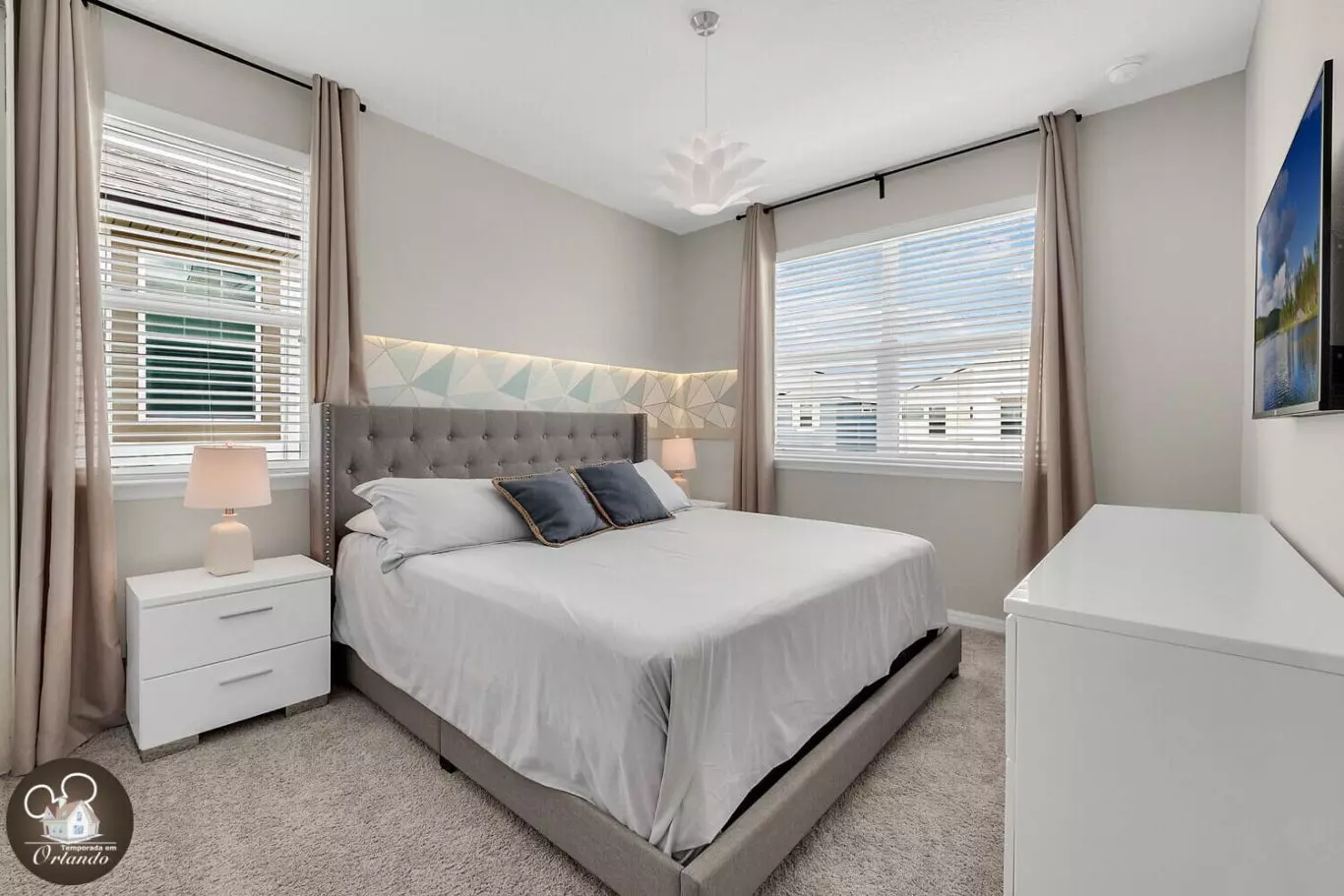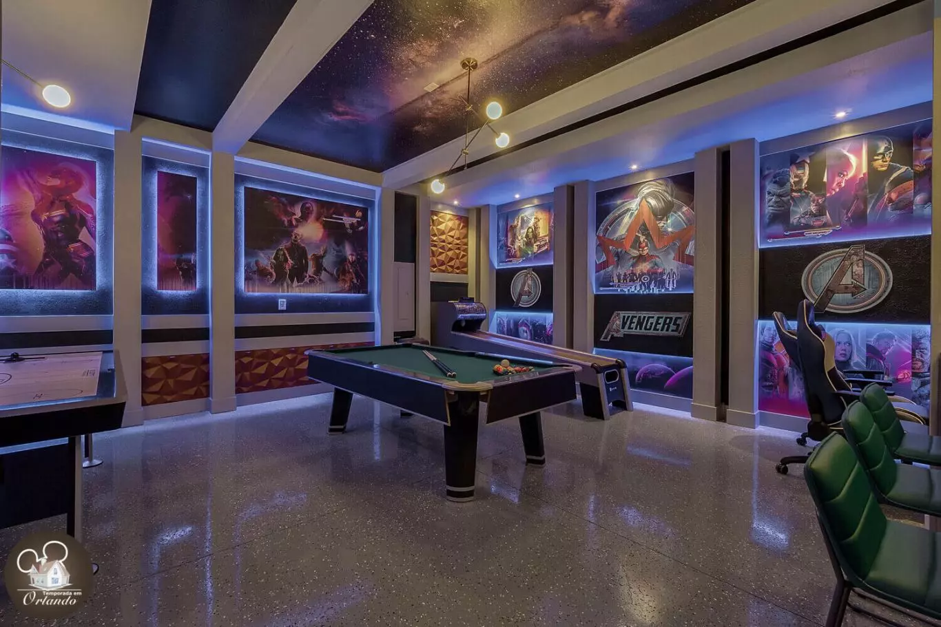 No piso superior, há uma segunda sala de estar com TV, ideal para relaxar após um dia cheio de aventuras. Para completar a diversão, a casa possui uma incrível sala de jogos decorada com luzes neon, equipada com mesa de sinuca, air game e vídeo game.