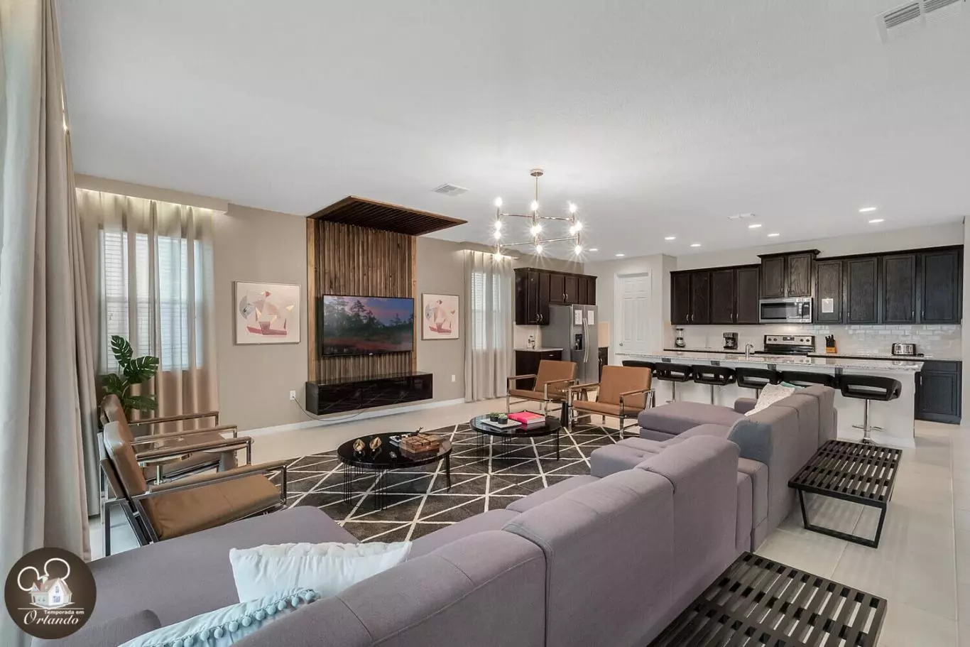 Logo na entrada, você será recebido por uma sala de TV integrada com a sala de jantar e cozinha no estilo americano. O ambiente é espaçoso, bem distribuído e decorado com bom gosto, proporcionando conforto e convivência para todos os hóspedes.