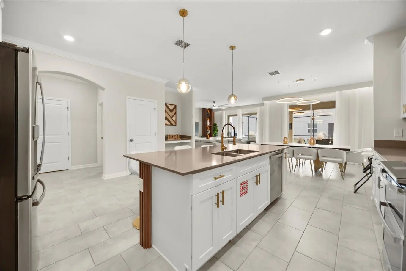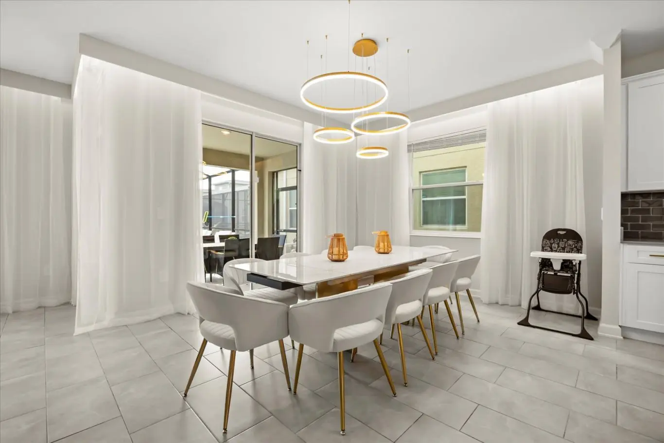 Ao entrar nesta mansão de luxo em Orlando, você será recebido por ambientes espaçosos, bem iluminados e decorados com elegância. A sala de estar, sala de jantar e cozinha estilo americano se integram harmoniosamente, criando um espaço perfeito para momentos de convivência e relaxamento após um dia nos parques temáticos da Disney. A cozinha é totalmente equipada com eletrodomésticos modernos, ideal para preparar suas refeições em família.
