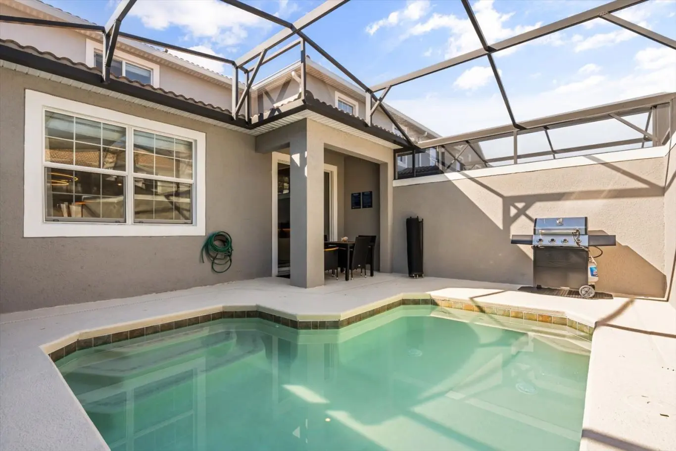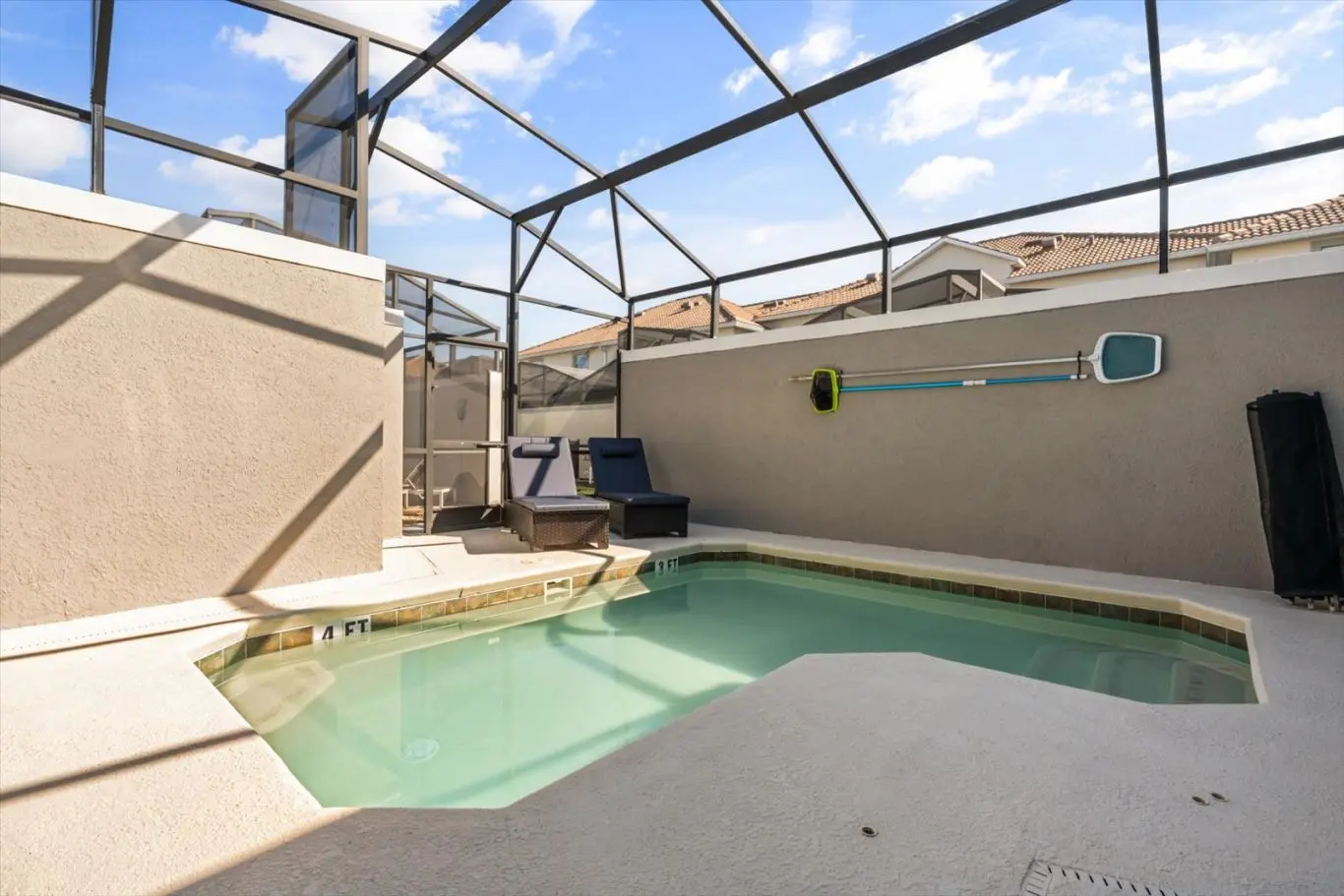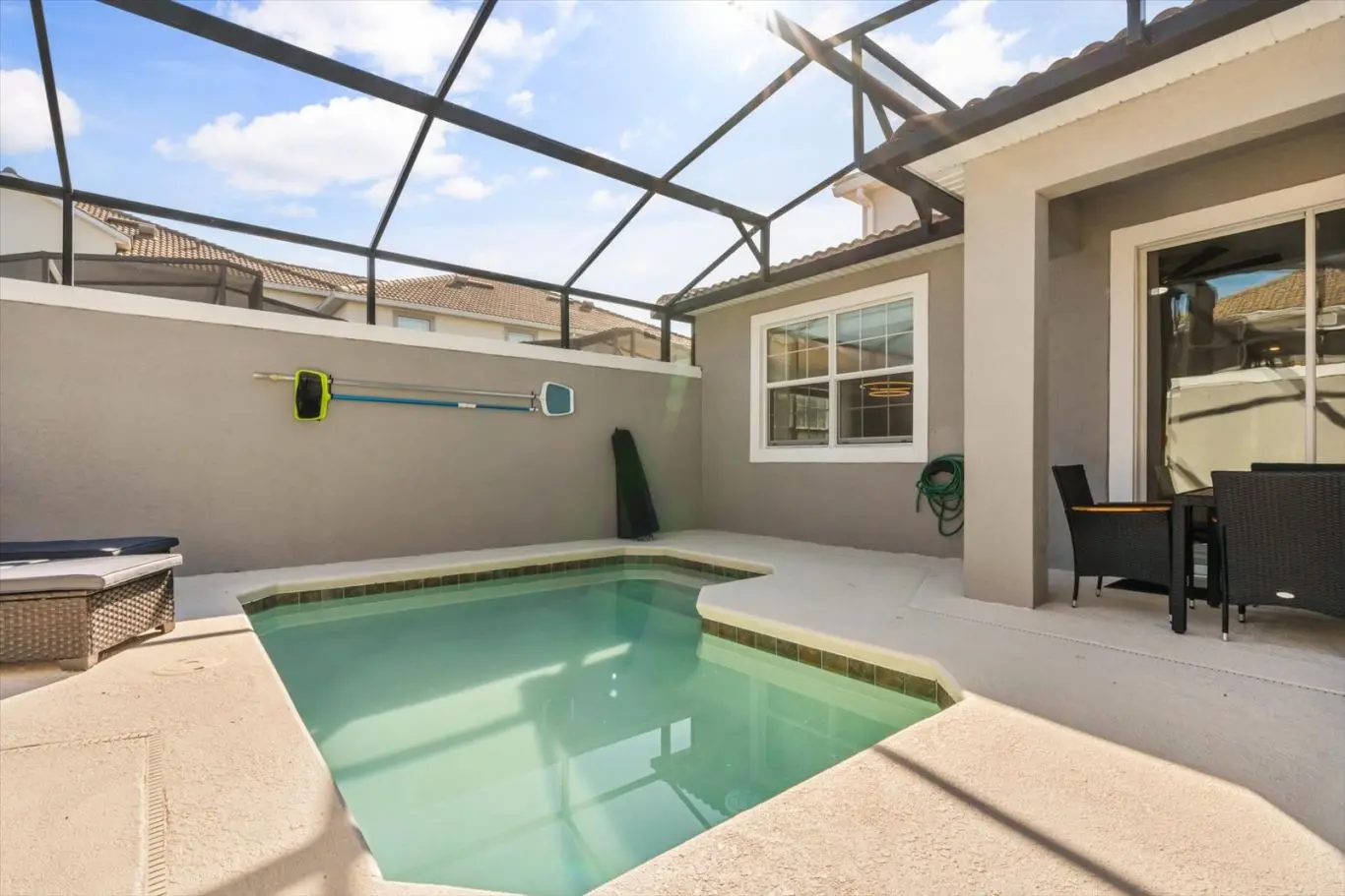 A piscina privativa oferece um refúgio perfeito para relaxar depois dos parques, com espreguiçadeiras ao redor para descanso ao ar livre com privacidade.