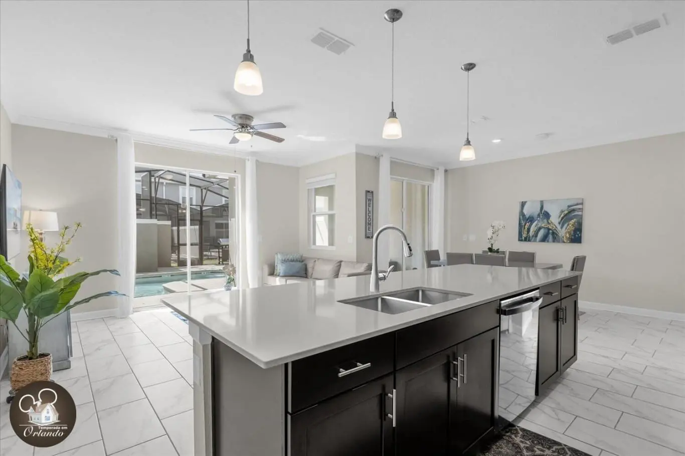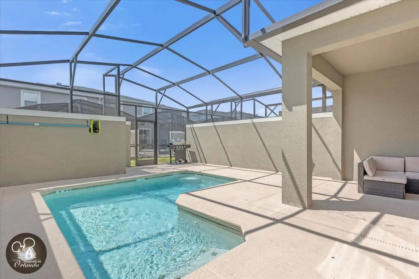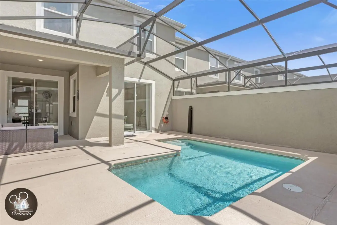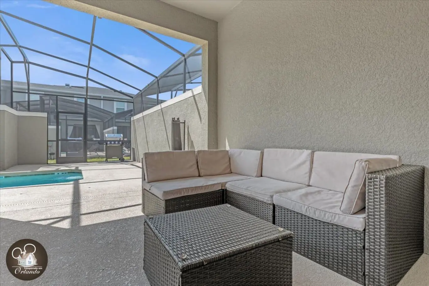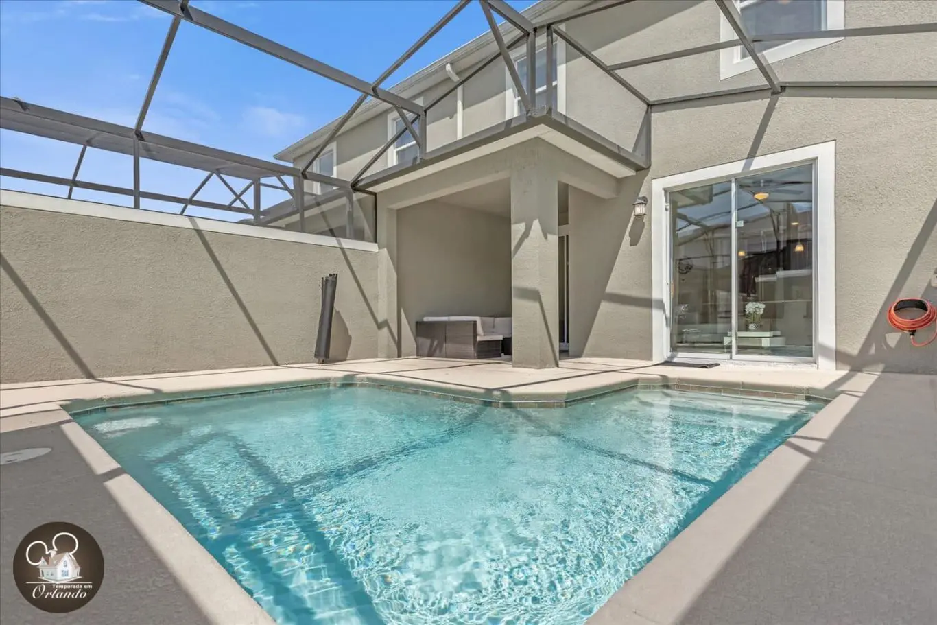 A área externa conta com piscina exclusiva, ideal para momentos de lazer e descanso. Um ambiente perfeito para relaxar após um dia de passeios em Orlando.