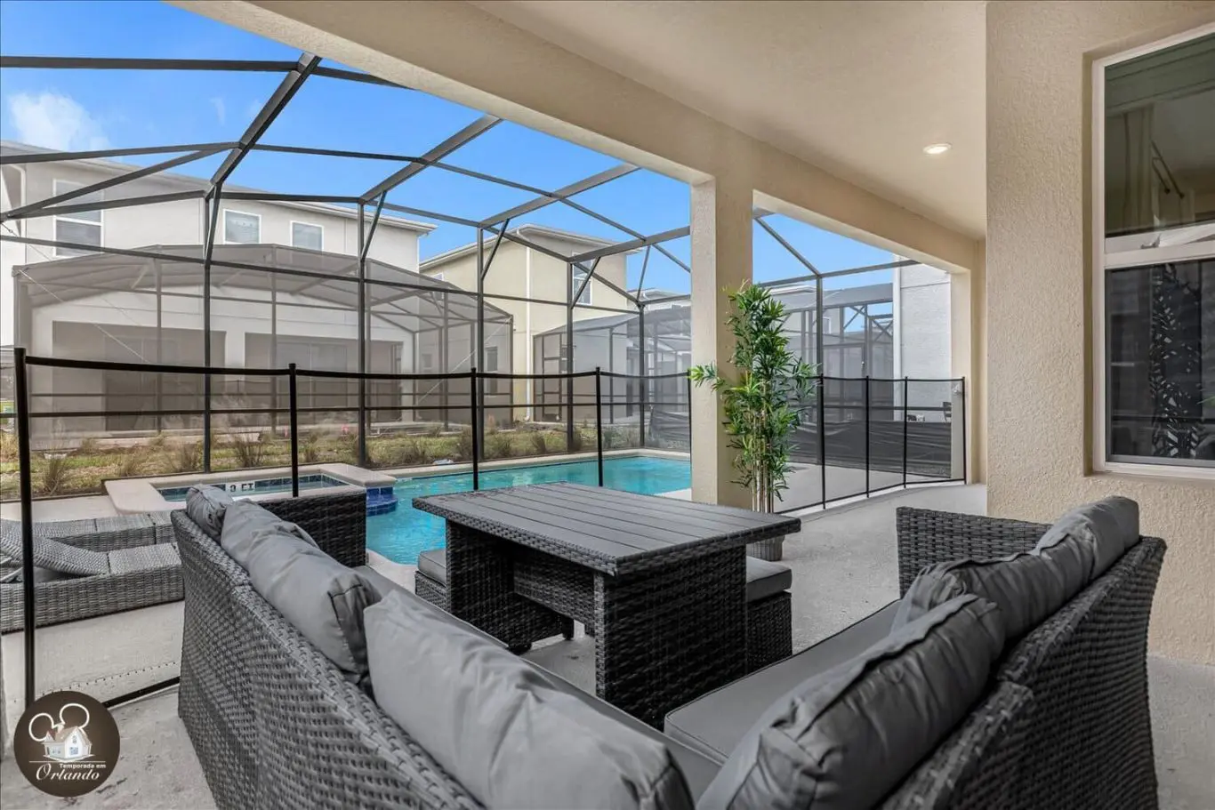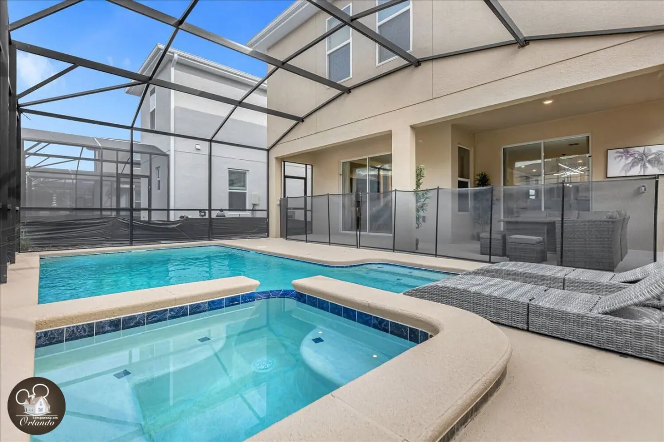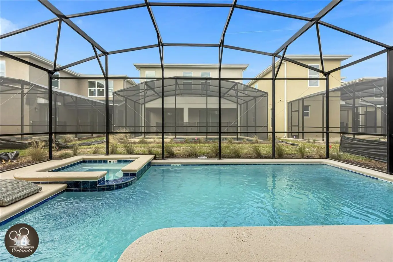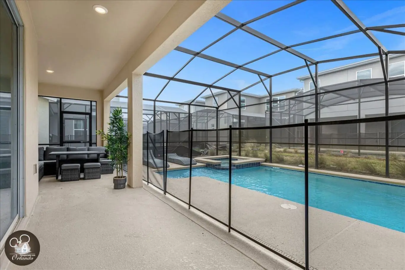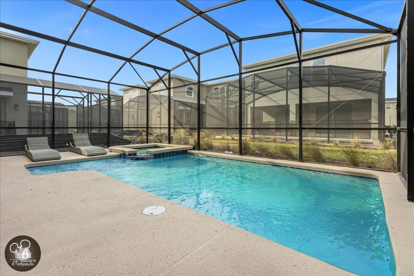 A área externa é um verdadeiro refúgio, com piscina privativa, jacuzzi e espreguiçadeiras. Um ambiente ideal para descansar após um dia nos parques.