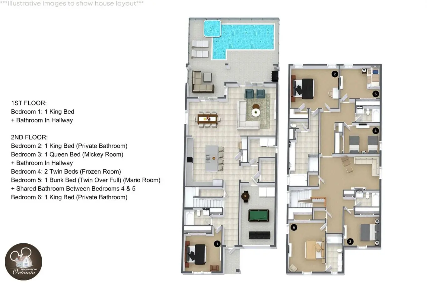 6 Quartos | Acomoda até 13 Pessoas | Piscina Privativa com Jacuzzi | Salão de Jogos | Sala de Descanso | Próxima à Disney