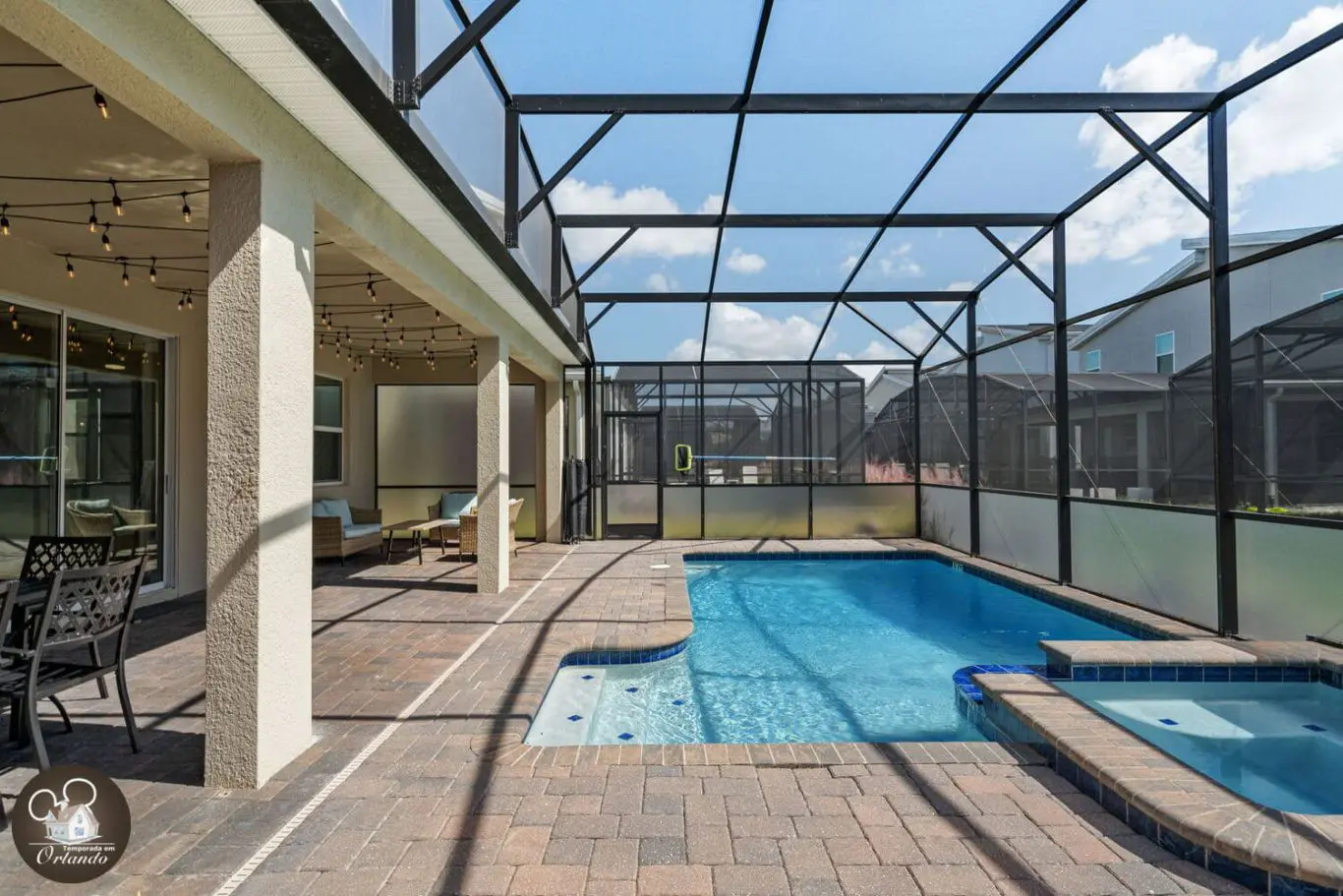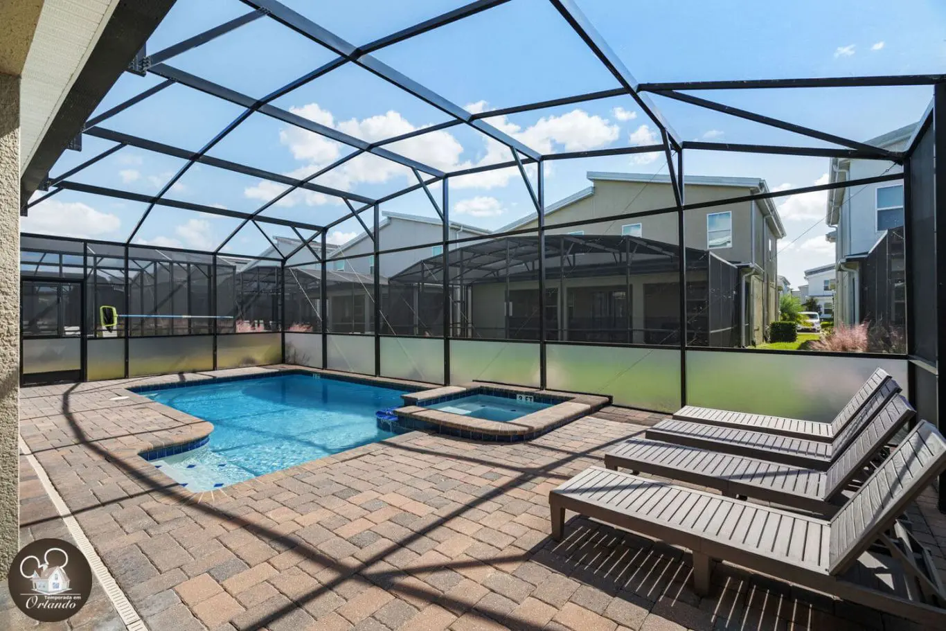 A área externa é um verdadeiro oásis com piscina privativa, jacuzzi aquecida e espreguiçadeiras. Um ambiente ideal para relaxar após um dia nos parques ou outlets.