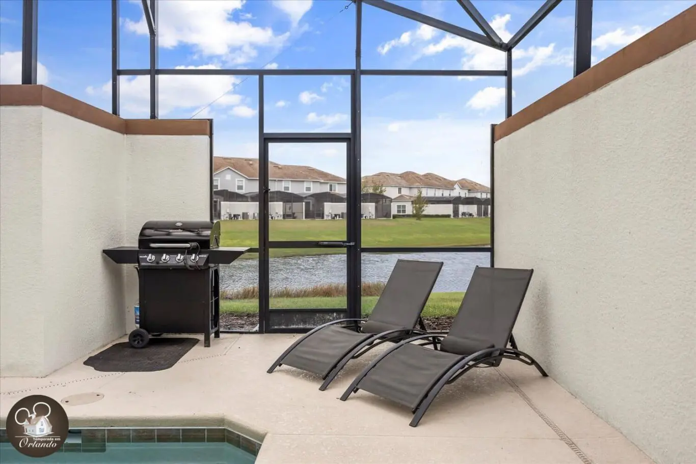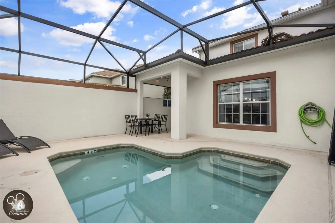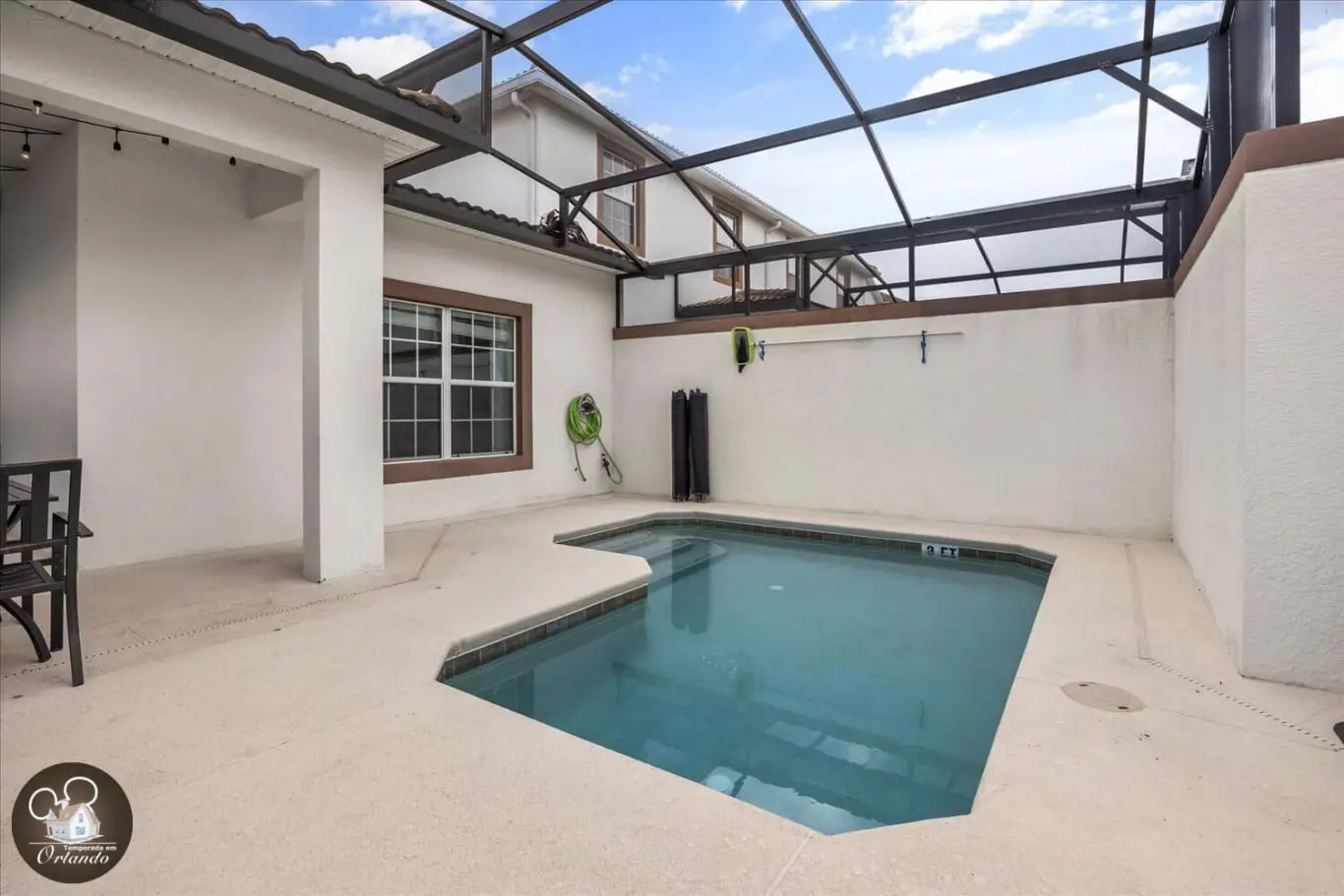 A piscina privativa oferece um refúgio perfeito para relaxar depois dos parques, com espreguiçadeiras ao redor para descanso ao ar livre com privacidade.