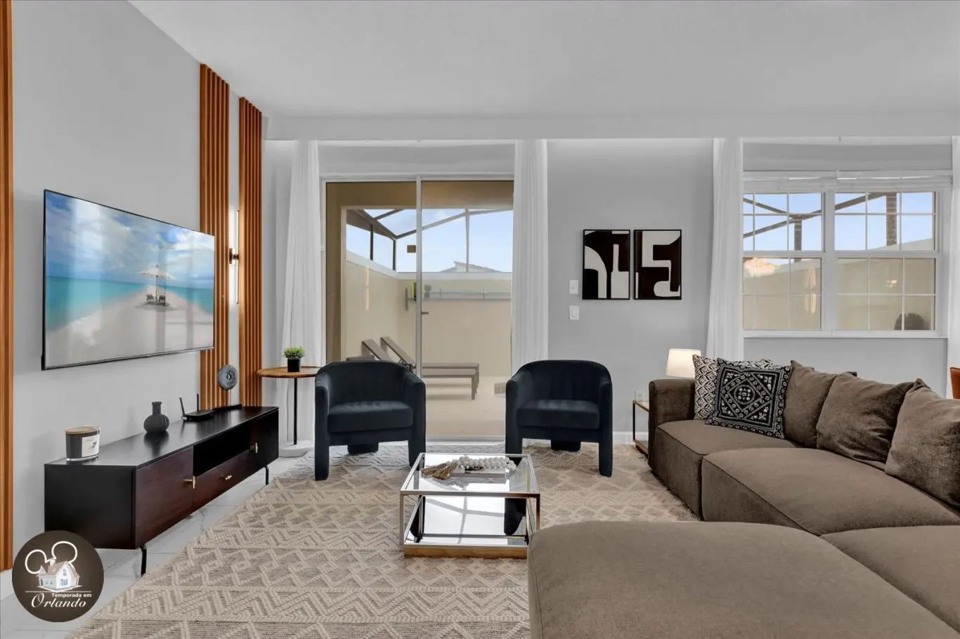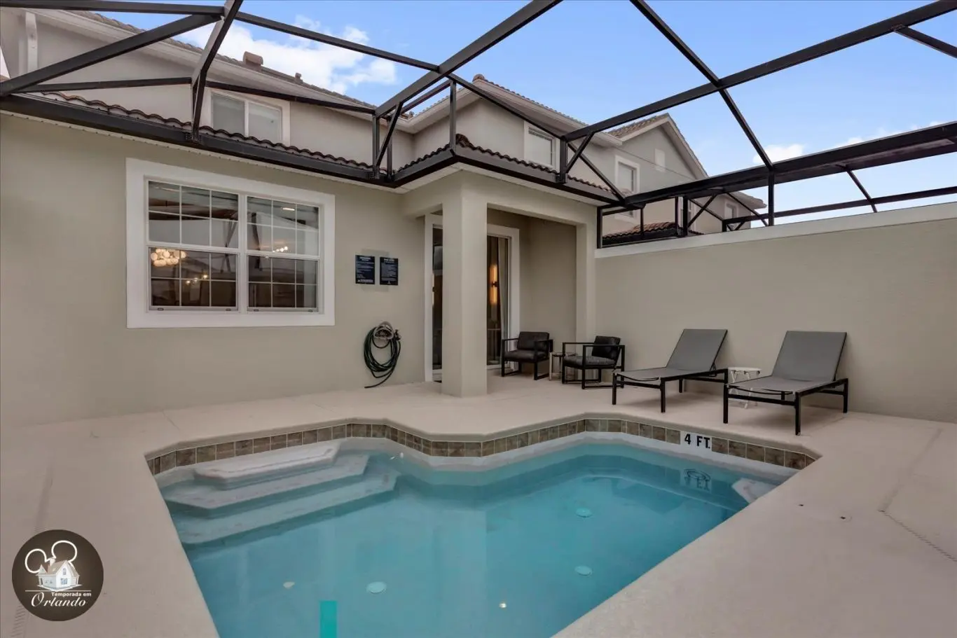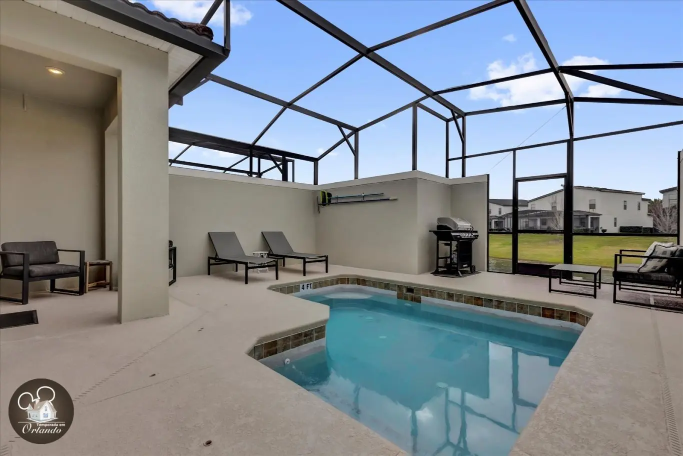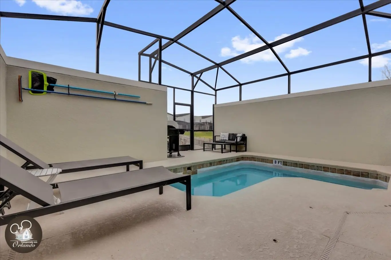 Na área externa, a piscina privativa é um convite para relaxar após um dia de parques, com espreguiçadeiras para aproveitar o sol da Flórida em grande estilo.