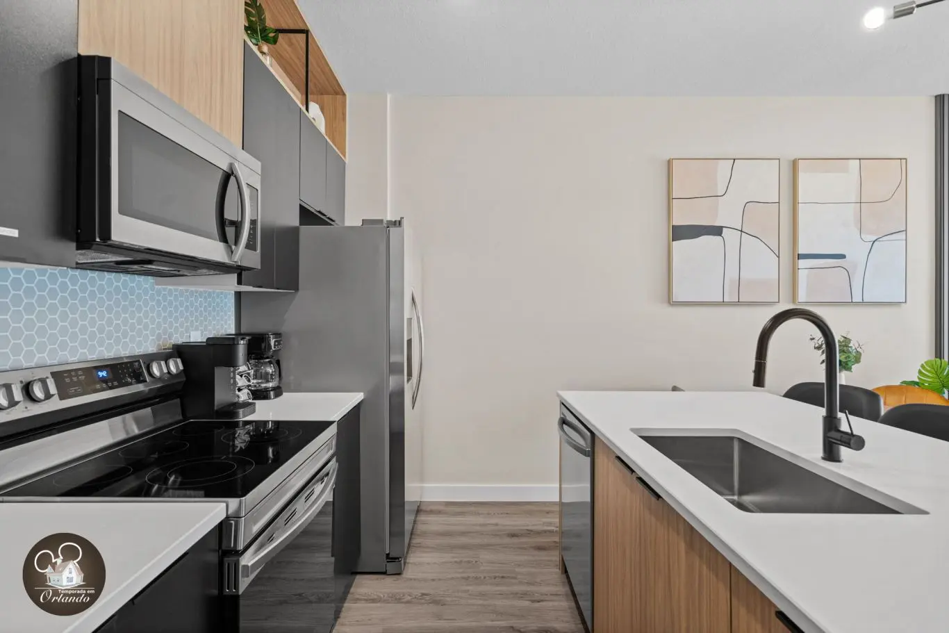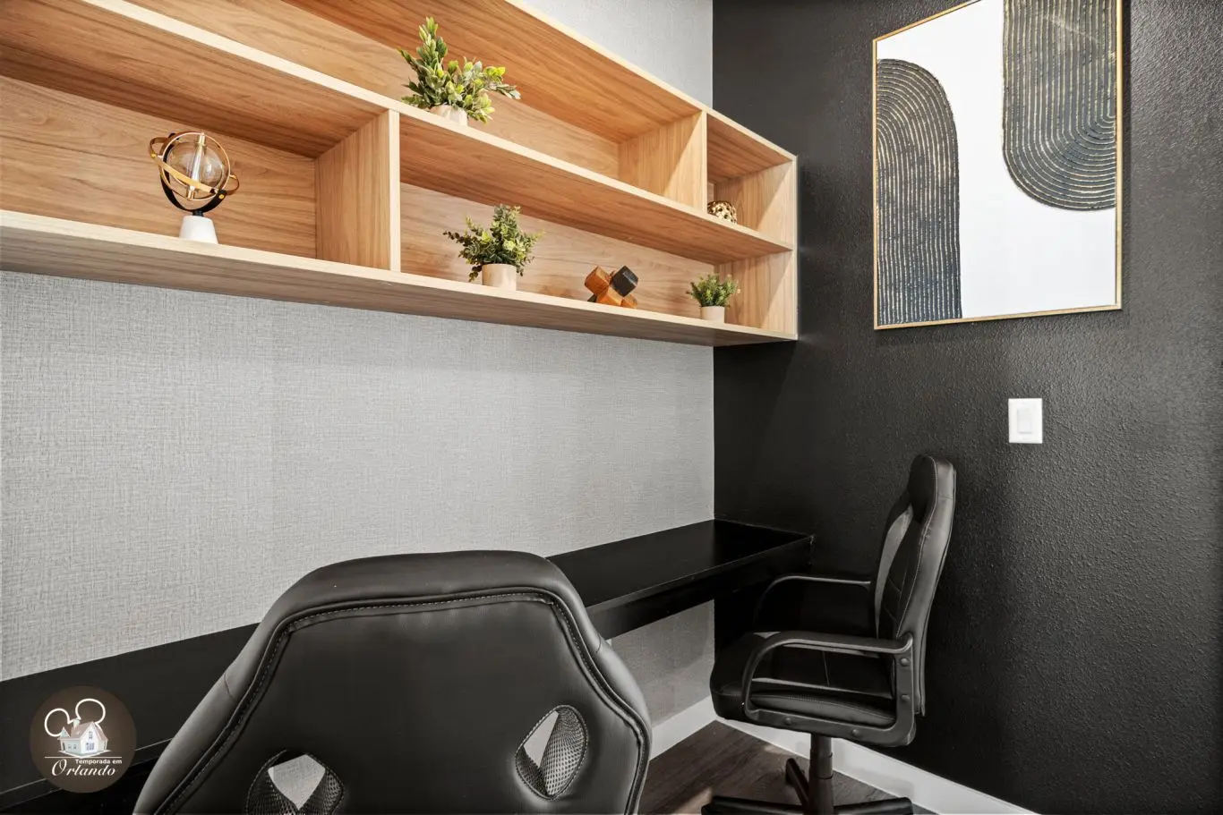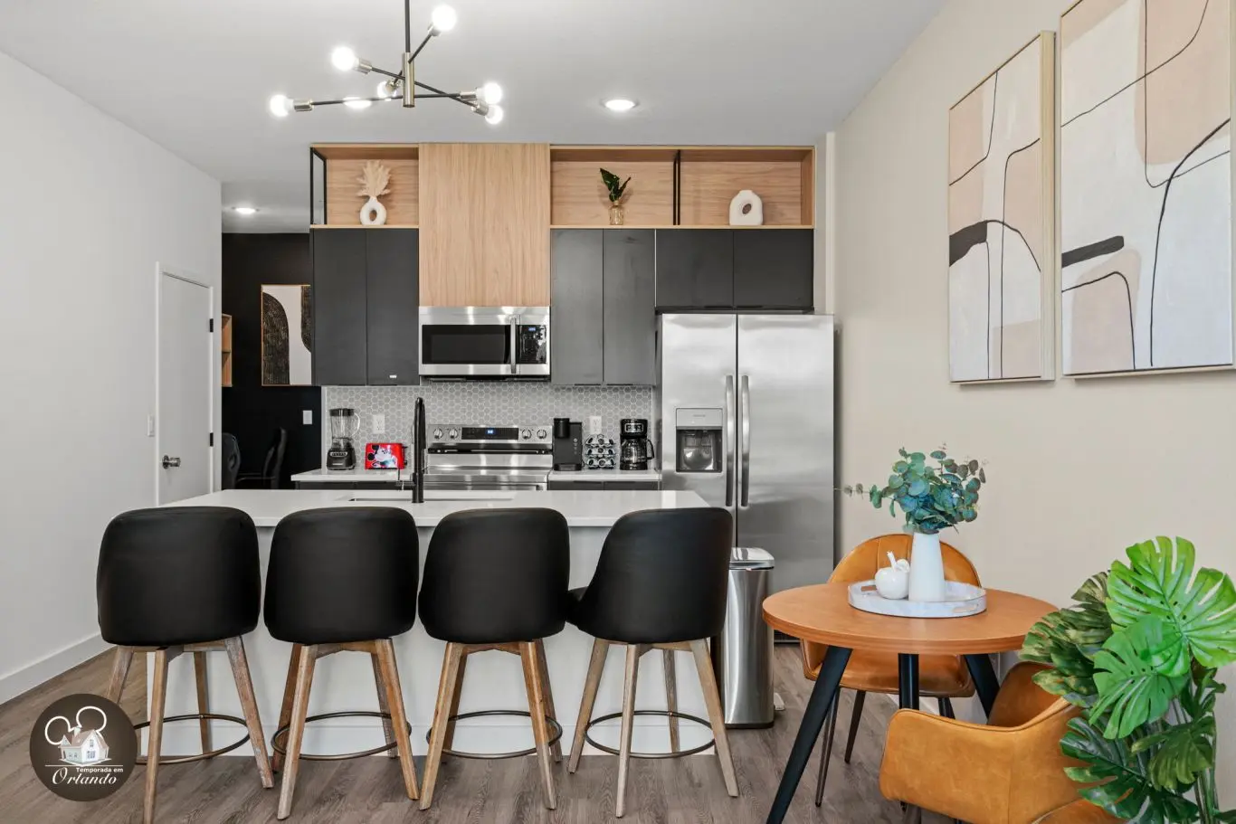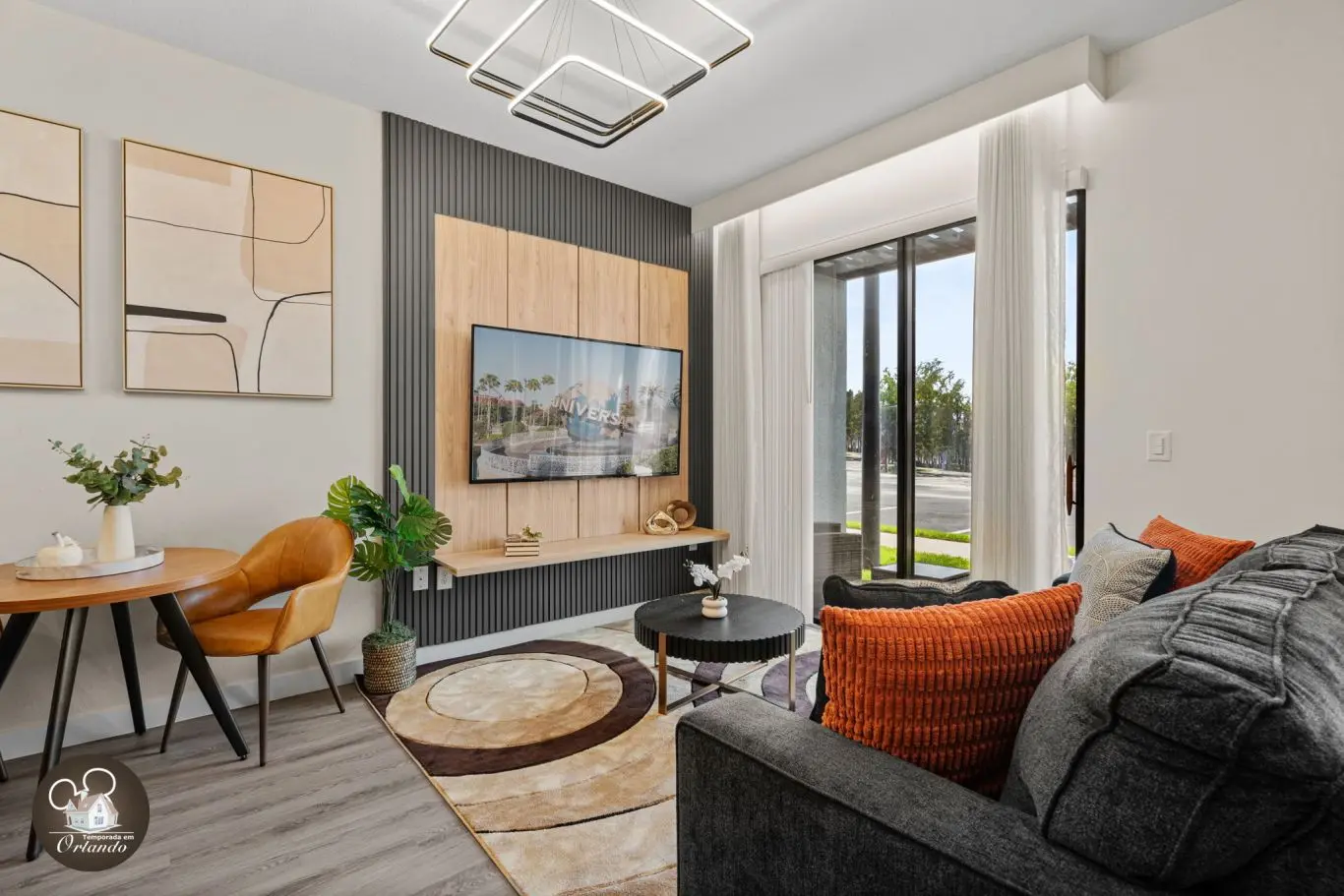 Logo na entrada, o ambiente integrado de sala de TV, jantar e cozinha americana já impressiona pelo bom gosto e funcionalidade. Cada detalhe da decoração foi pensado para refletir o espírito mágico de Orlando.