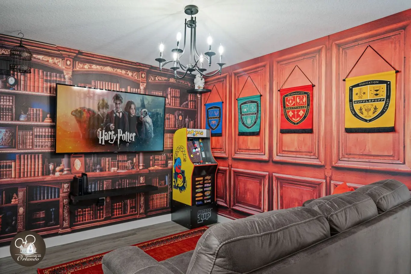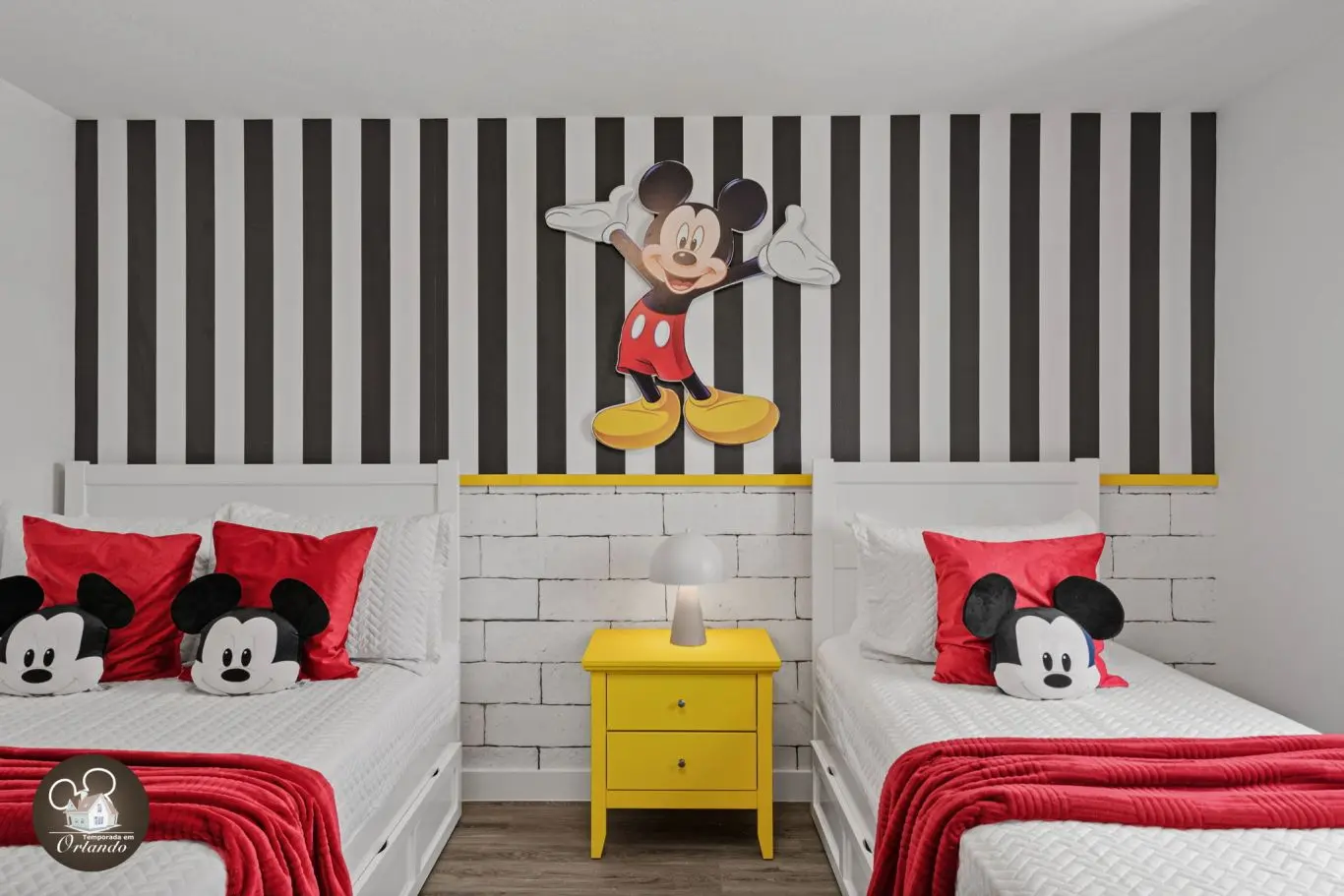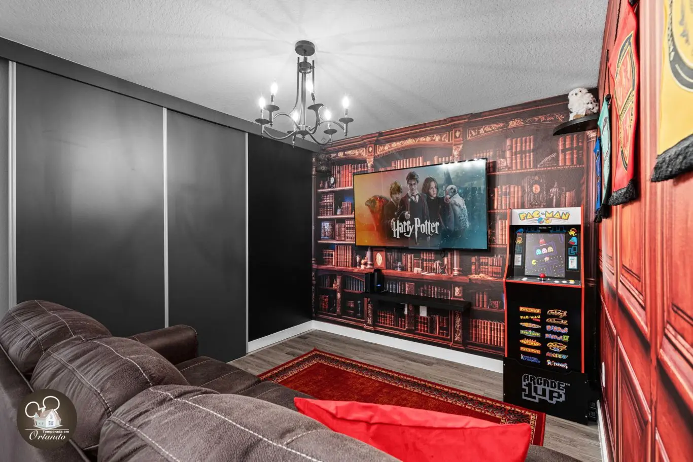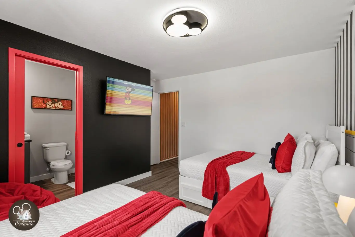 Logo na entrada, o ambiente integrado de sala de TV, jantar e cozinha americana já impressiona pelo bom gosto e funcionalidade. Cada detalhe da decoração foi pensado para refletir o espírito mágico de Orlando.