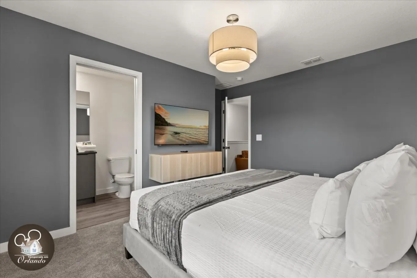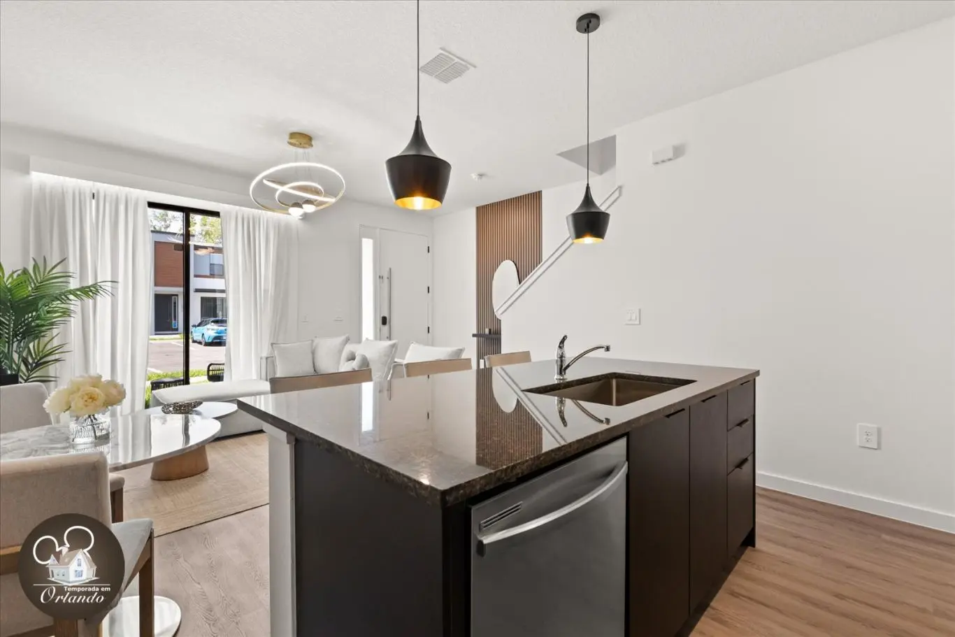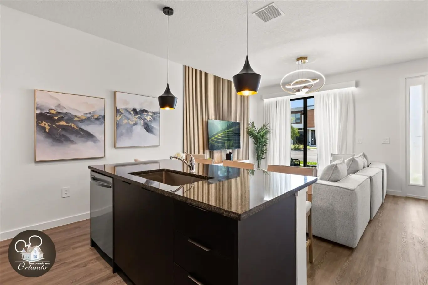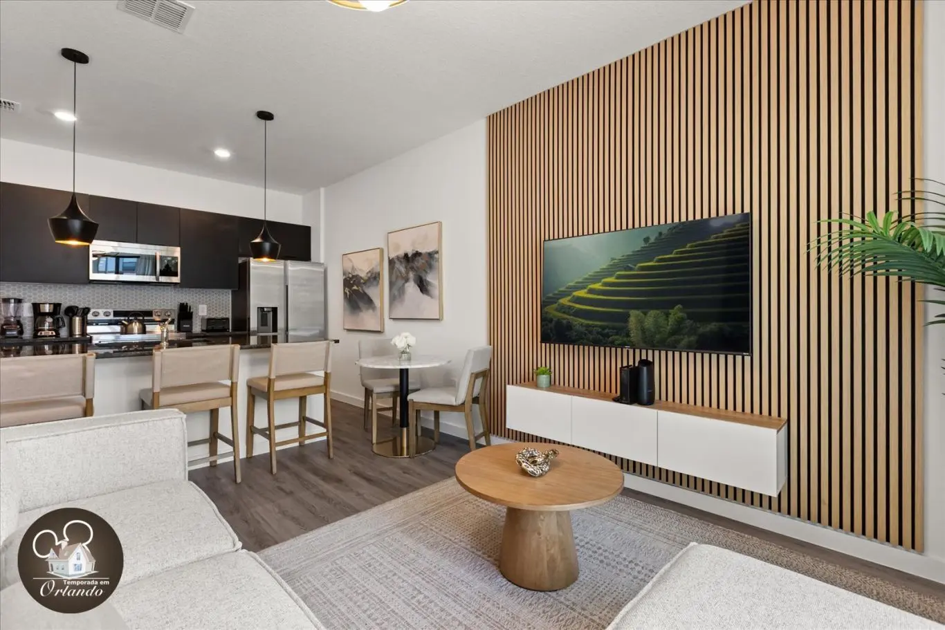 Logo na entrada, o ambiente integrado de sala de TV, jantar e cozinha americana já impressiona pelo bom gosto e funcionalidade. Cada detalhe da decoração foi pensado para refletir o espírito mágico de Orlando.