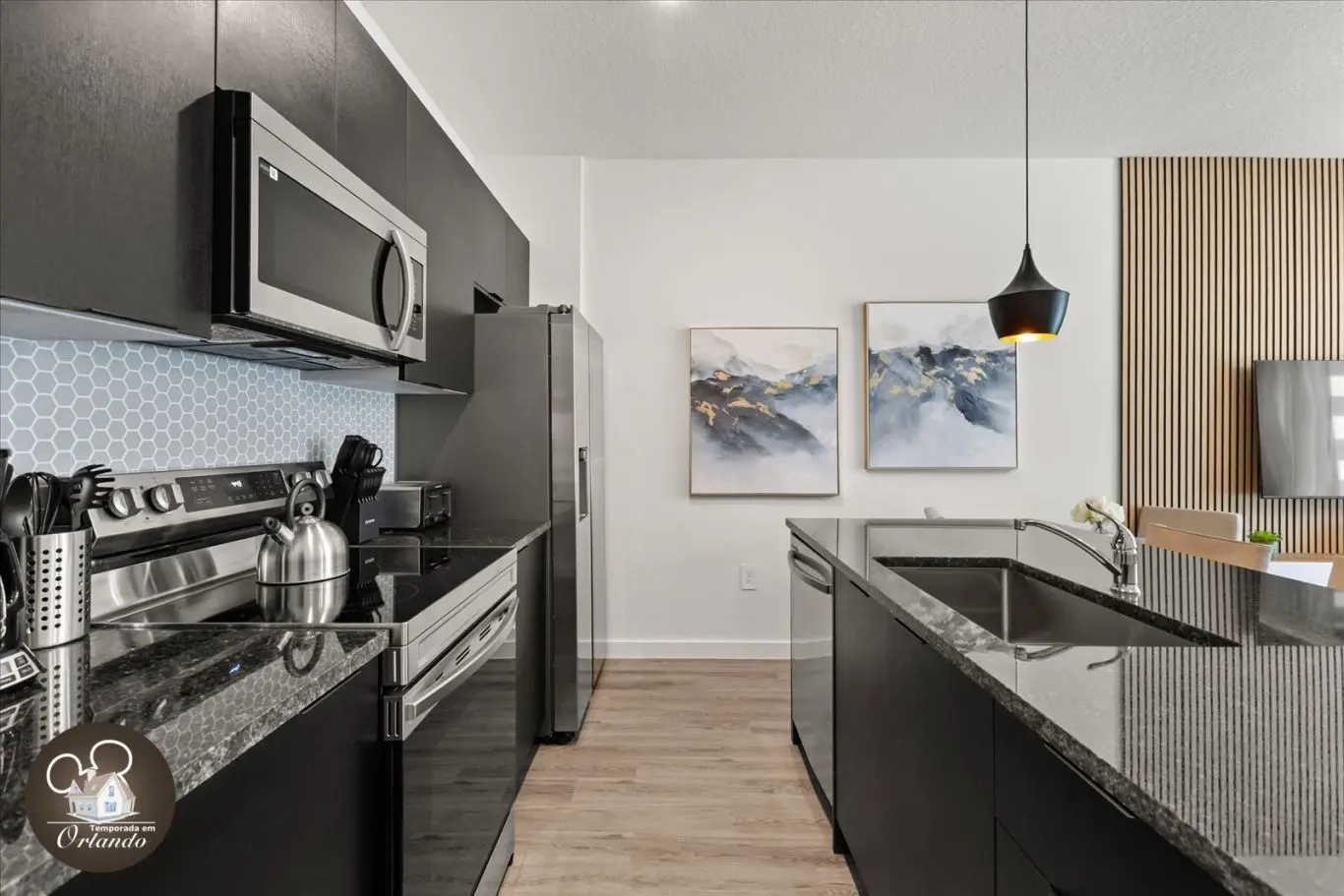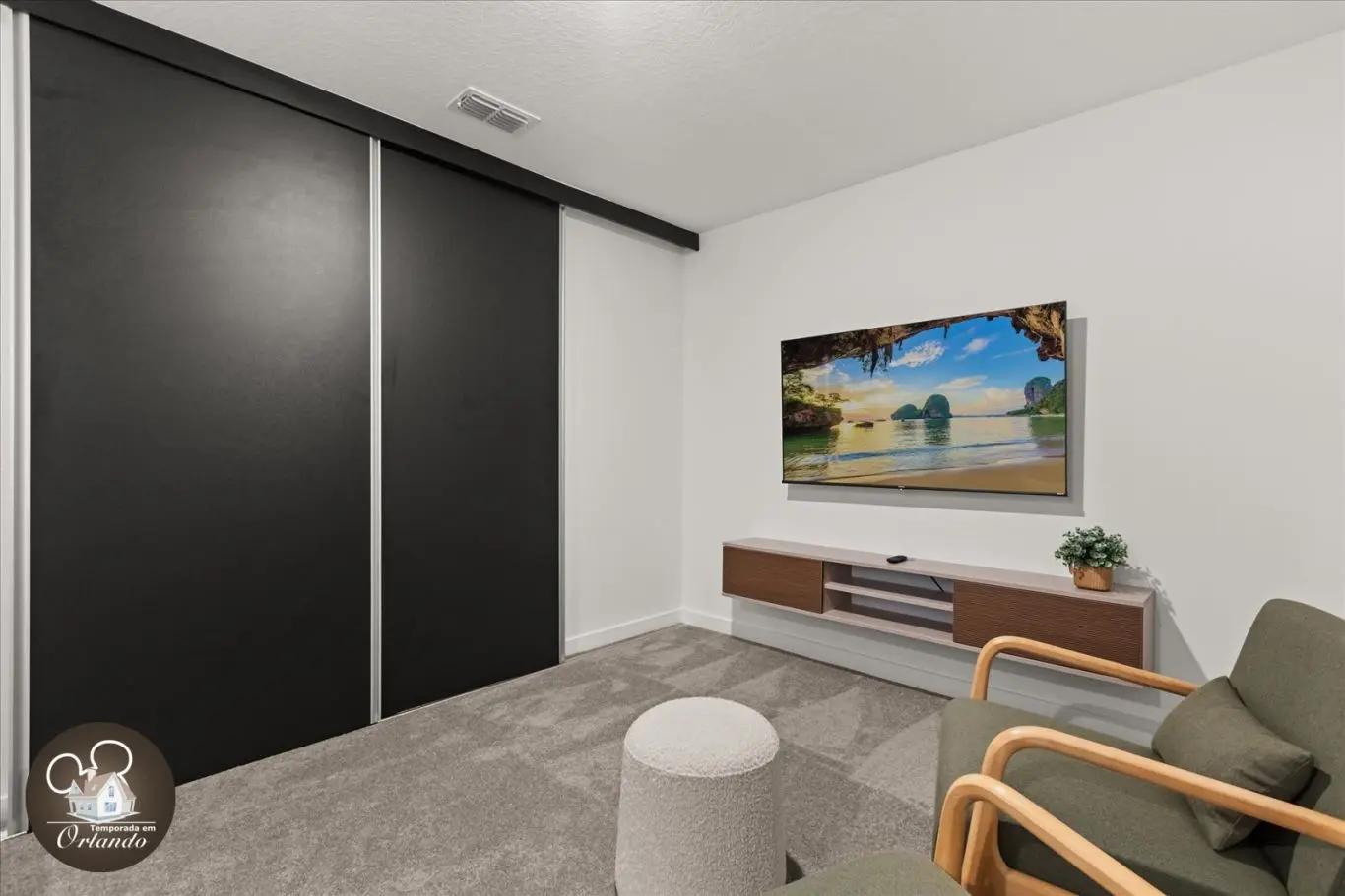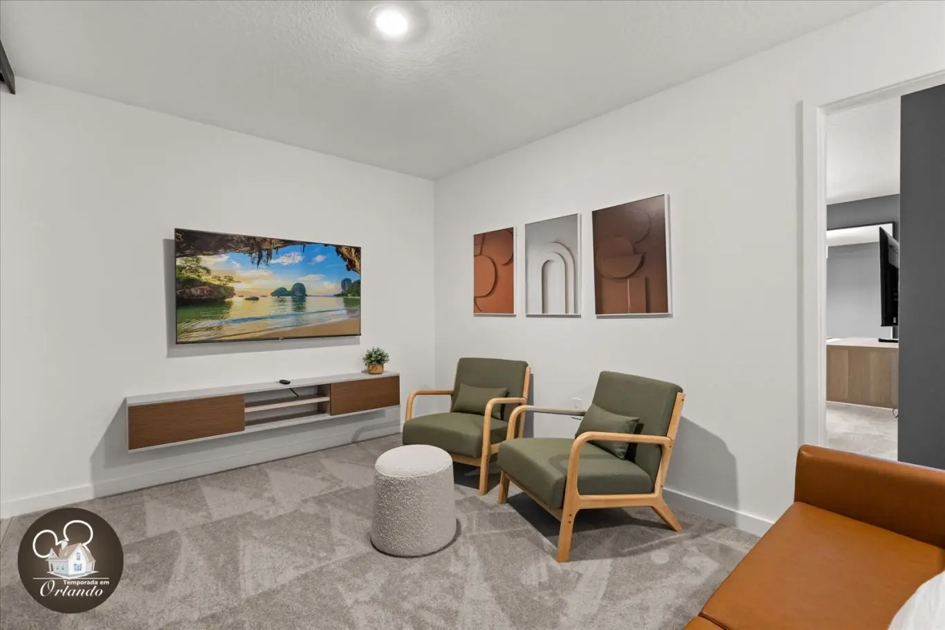 Logo na entrada, o ambiente integrado de sala de TV, jantar e cozinha americana já impressiona pelo bom gosto e funcionalidade. Cada detalhe da decoração foi pensado para refletir o espírito mágico de Orlando.