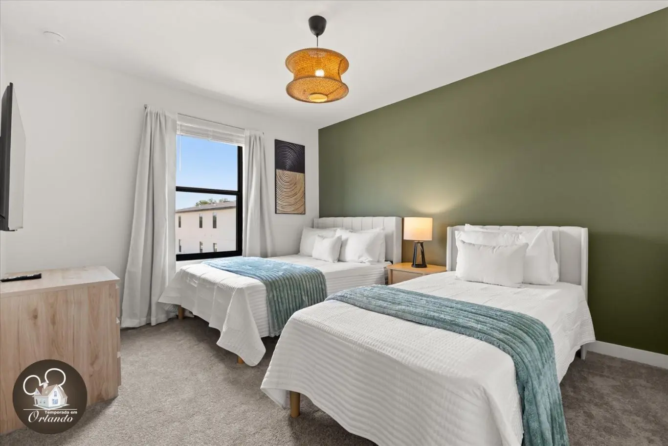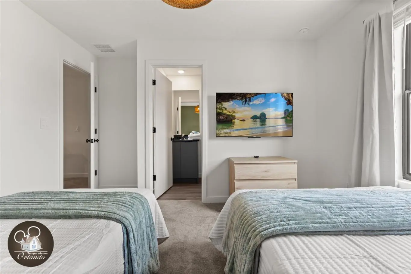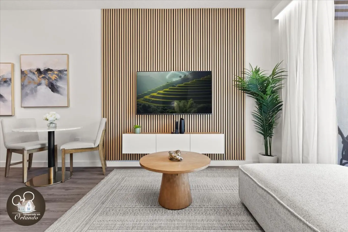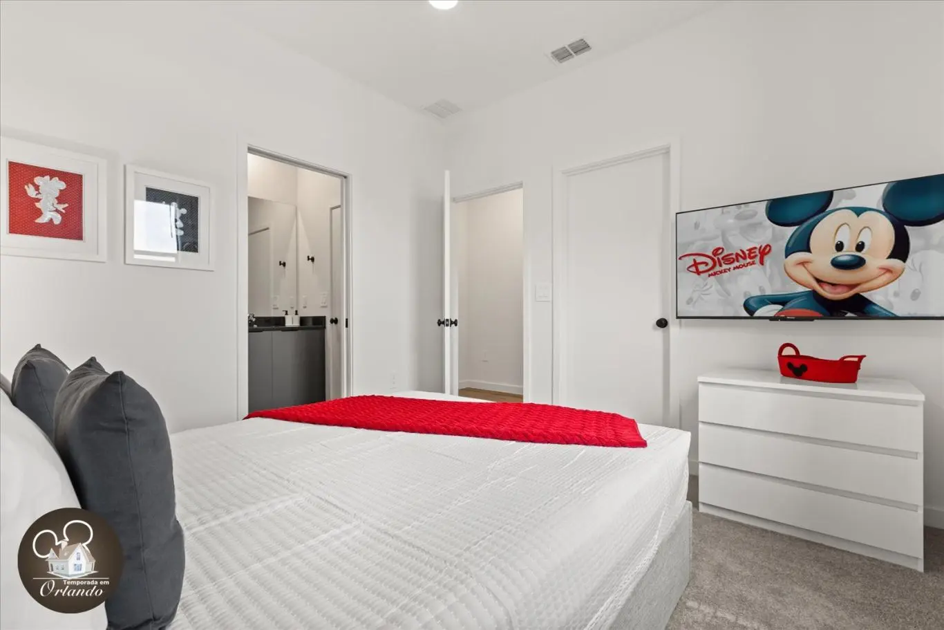 Logo na entrada, o ambiente integrado de sala de TV, jantar e cozinha americana já impressiona pelo bom gosto e funcionalidade. Cada detalhe da decoração foi pensado para refletir o espírito mágico de Orlando.