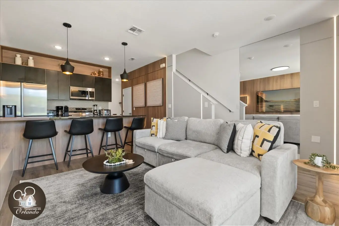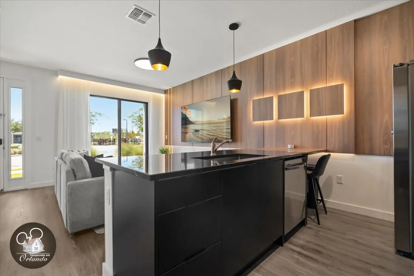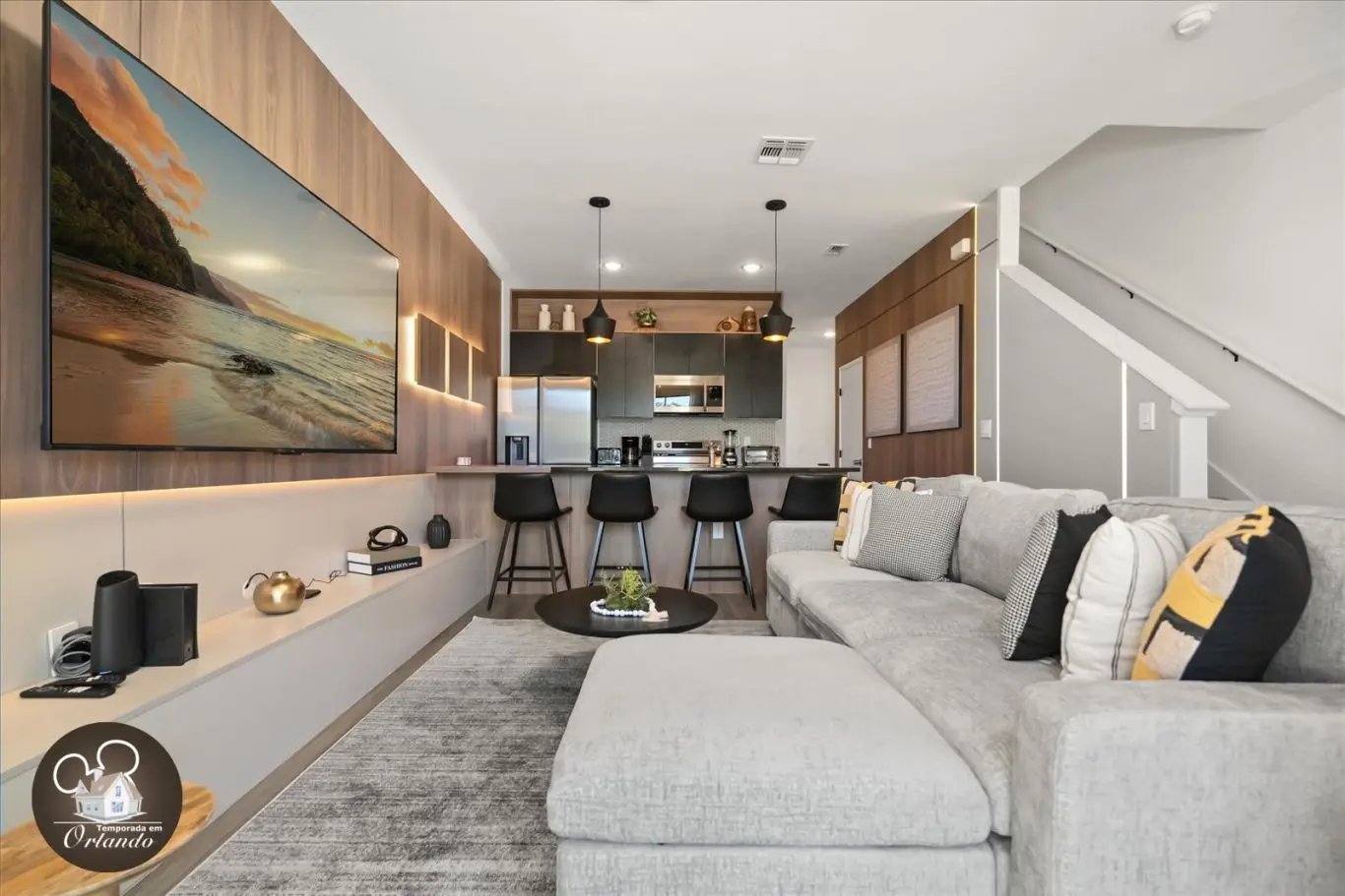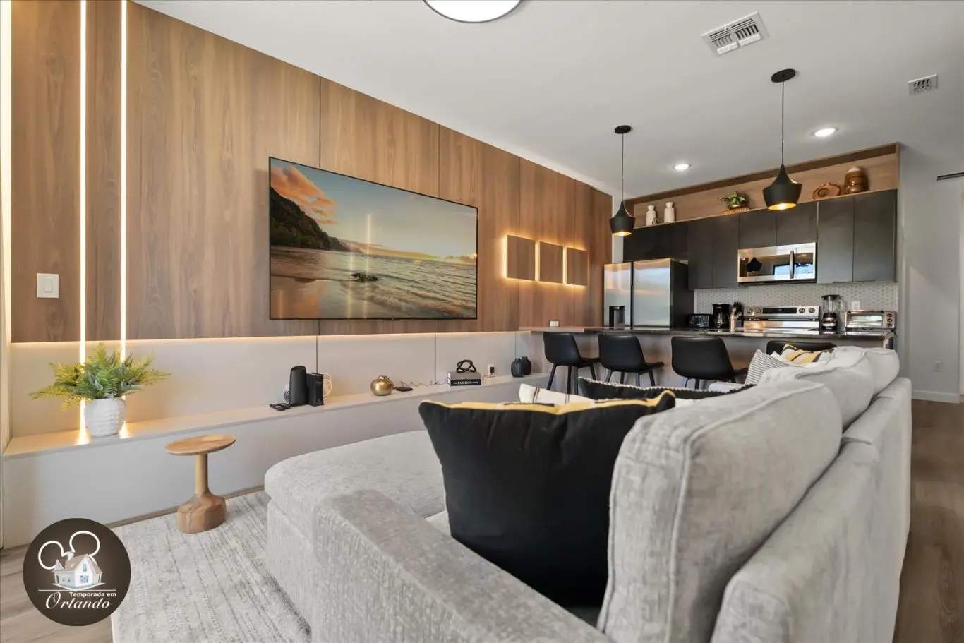 Logo na entrada, o ambiente integrado de sala de TV, jantar e cozinha americana já impressiona pelo bom gosto e funcionalidade. Cada detalhe da decoração foi pensado para refletir o espírito mágico de Orlando.