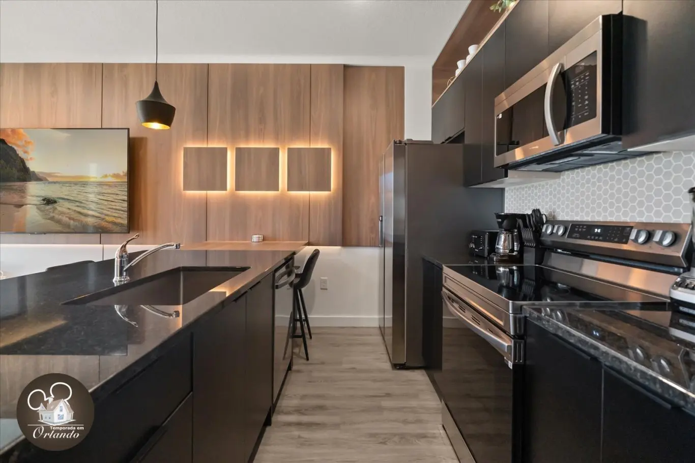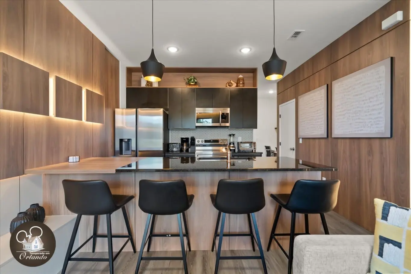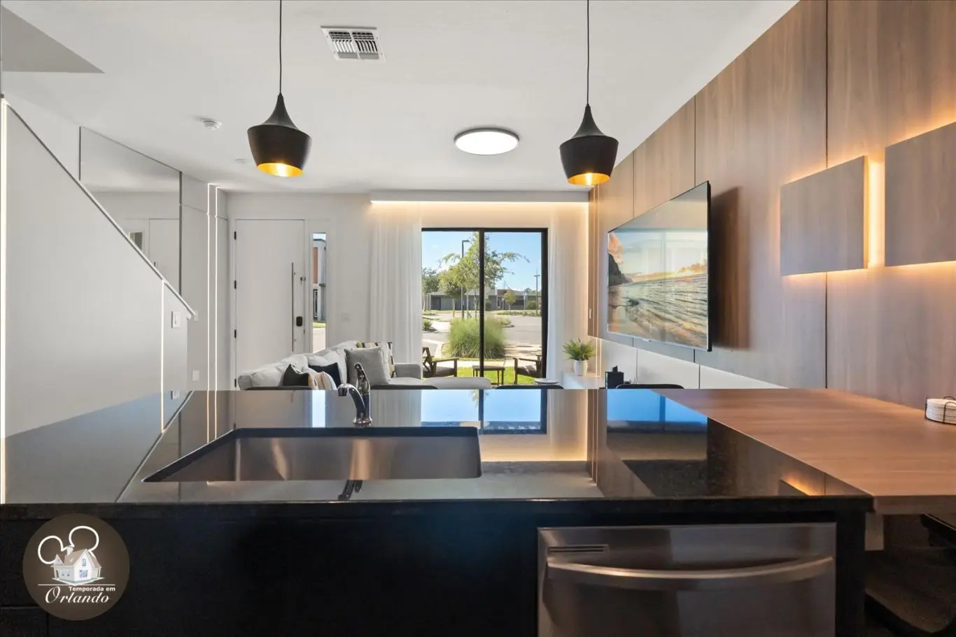 Logo na entrada, o ambiente integrado de sala de TV, jantar e cozinha americana já impressiona pelo bom gosto e funcionalidade. Cada detalhe da decoração foi pensado para refletir o espírito mágico de Orlando.