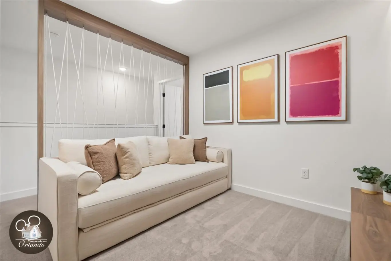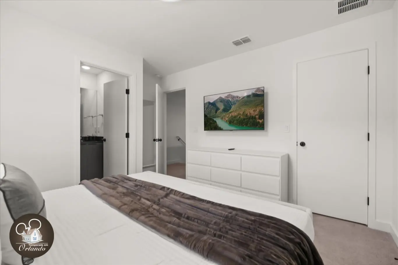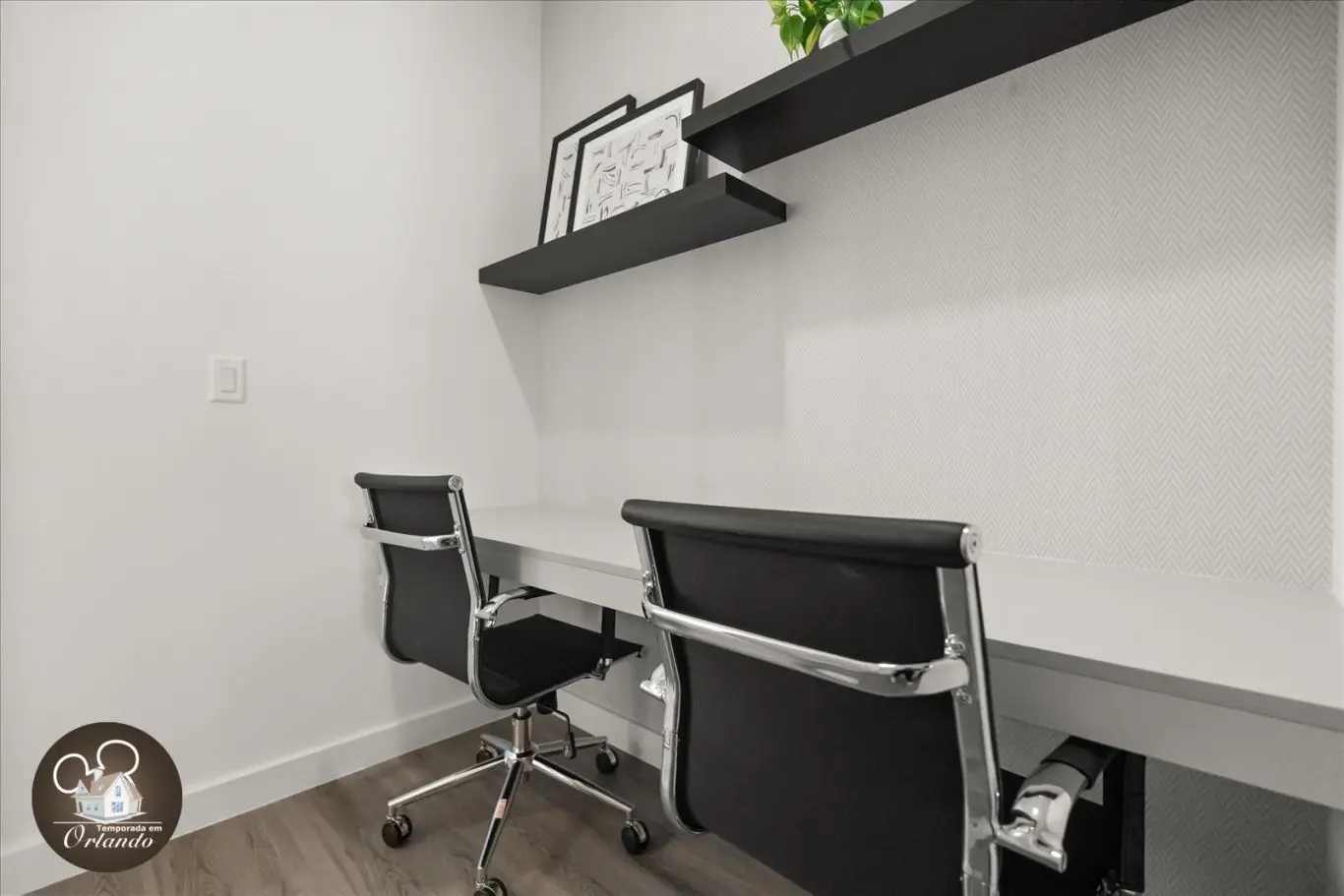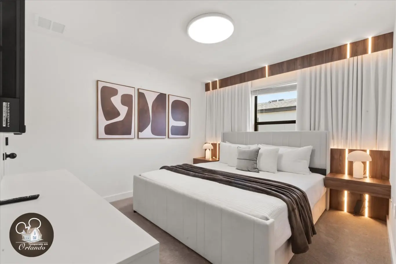Logo na entrada, o ambiente integrado de sala de TV, jantar e cozinha americana já impressiona pelo bom gosto e funcionalidade. Cada detalhe da decoração foi pensado para refletir o espírito mágico de Orlando.
