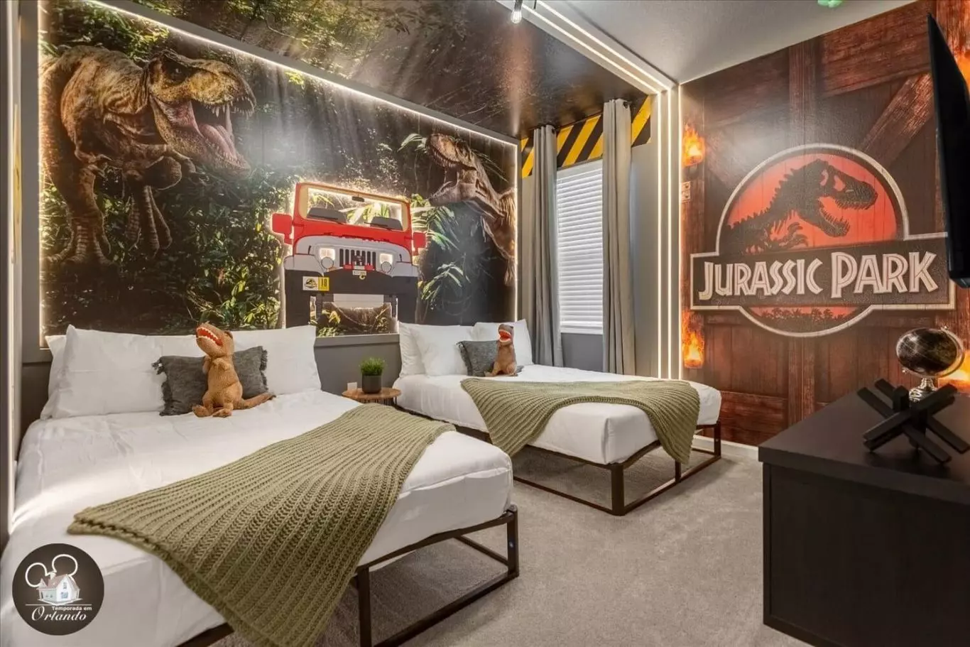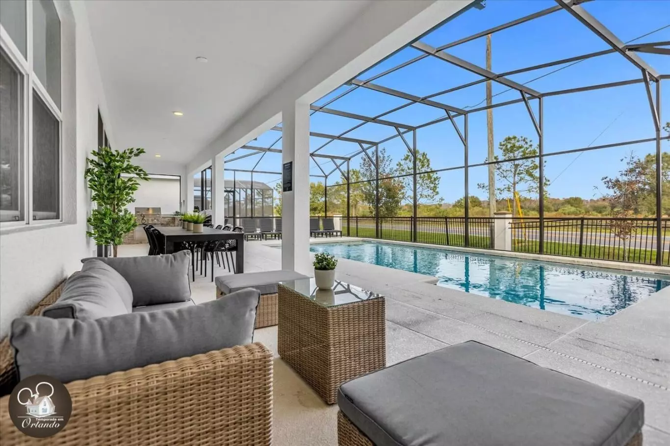 Na parte externa, a piscina com espreguiçadeiras é perfeita para relaxar após um dia nos parques. A casa ainda conta com Wi-Fi de alta velocidade e ambientes climatizados.