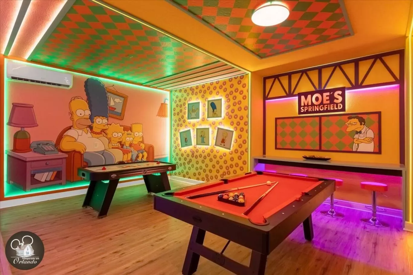 Depois de algumas noites no resort, sentimos que uma casa grande atenderia melhor às necessidades de nossas famílias. Foi bom ter todos juntos sob o mesmo teto, com certeza. A casa é bem decorada com temas em muitos quartos que as crianças adorariam. Durante os meses de verão, o ar condicionado não é capaz de manter a casa abaixo de 73. Provavelmente por causa do calor extremo na Flórida durante julho, em combinação com a grande área. A casa tem pequenos arranhões aqui e ali, o que é esperado em uma propriedade de aluguel de curta duração. O preço é bom e difícil de superar para um grupo grande. Manchas de móveis pré-existentes são difíceis de provar. Recomendamos tirar fotos de quaisquer marcas nos móveis que você veja quando chegar.