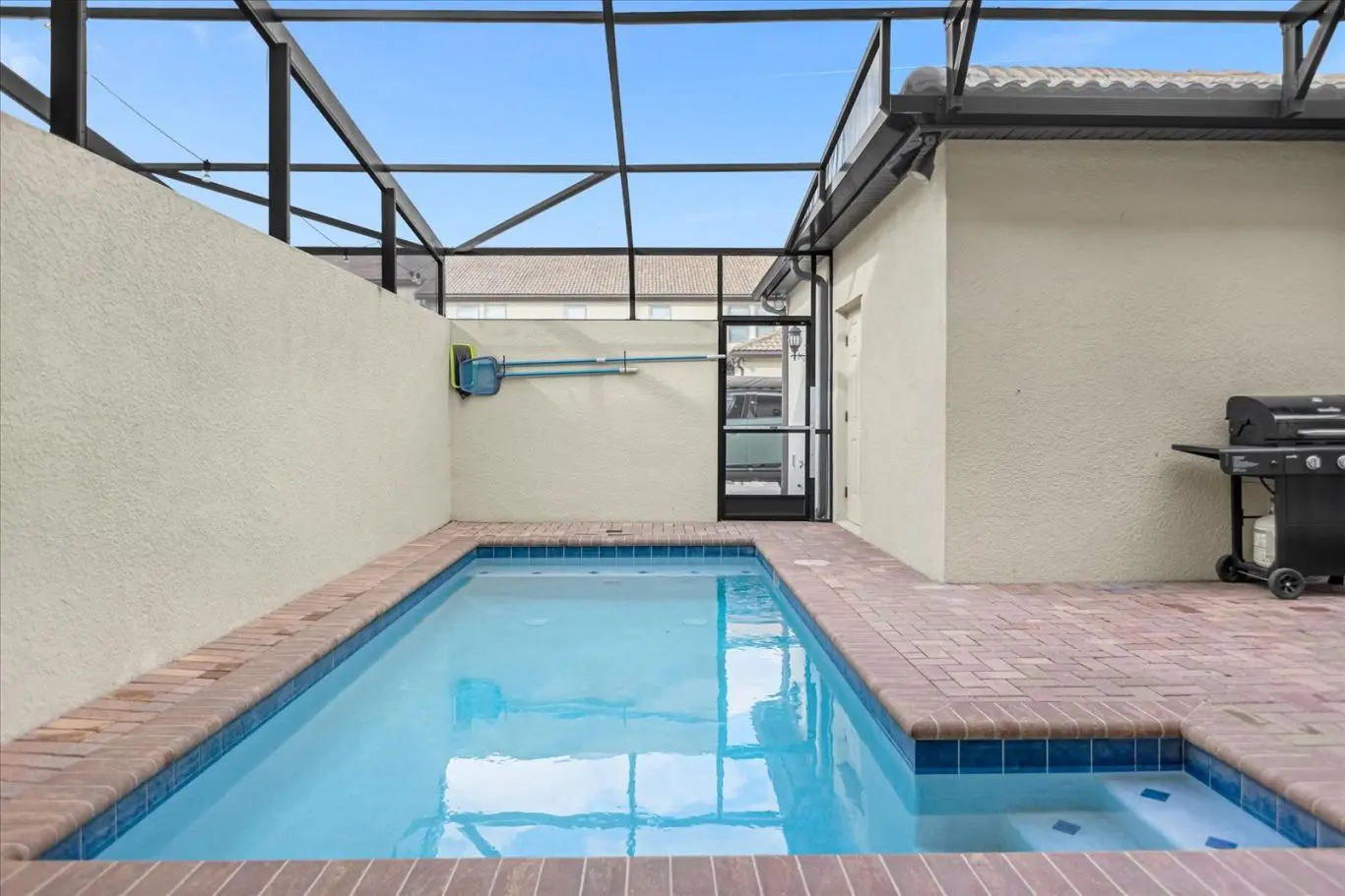 A área externa conta com piscina privativa, perfeita para relaxar em família após um dia intenso de passeios. Um ambiente reservado, tranquilo e ideal para aproveitar o sol da Flórida com liberdade.